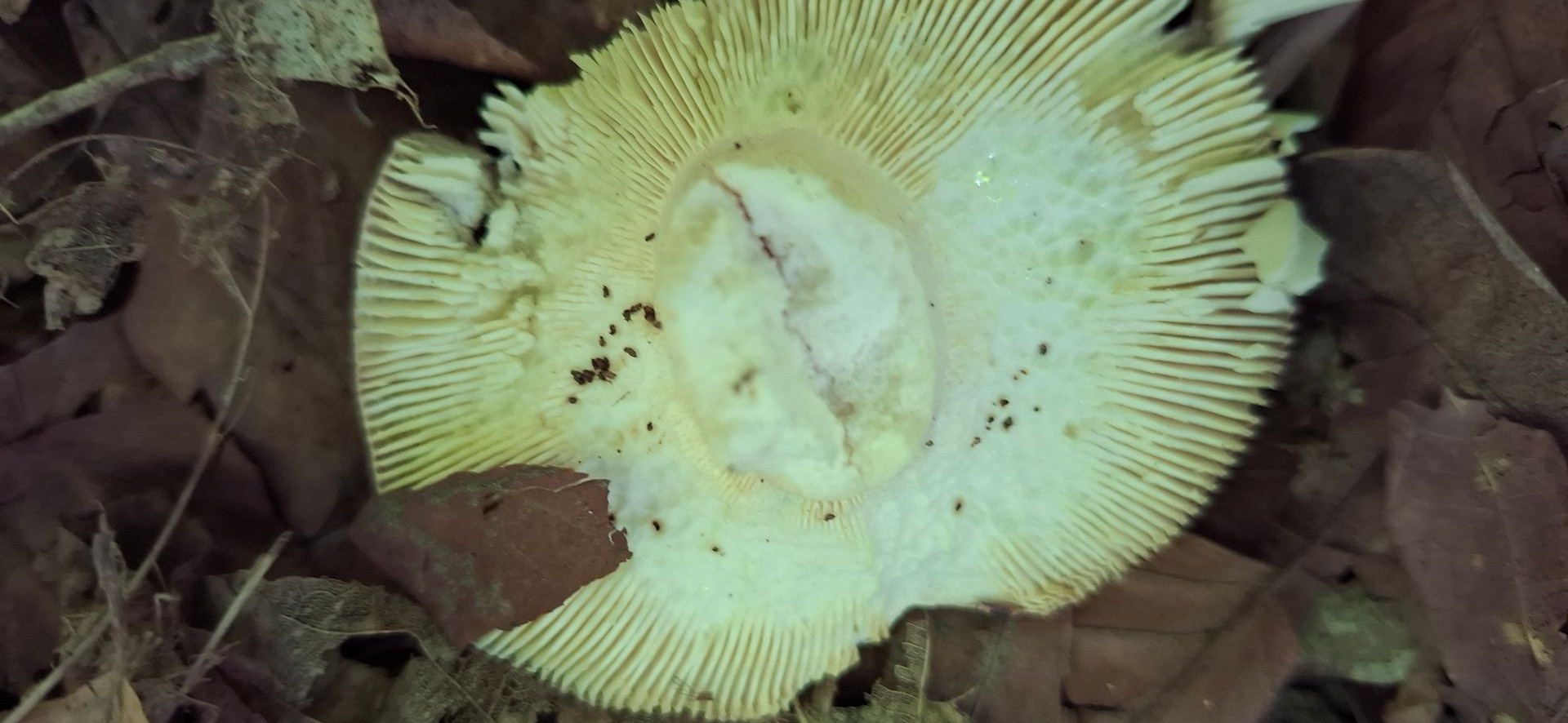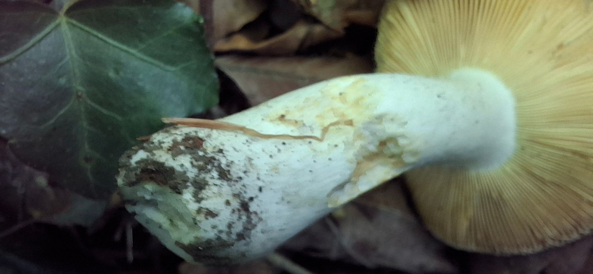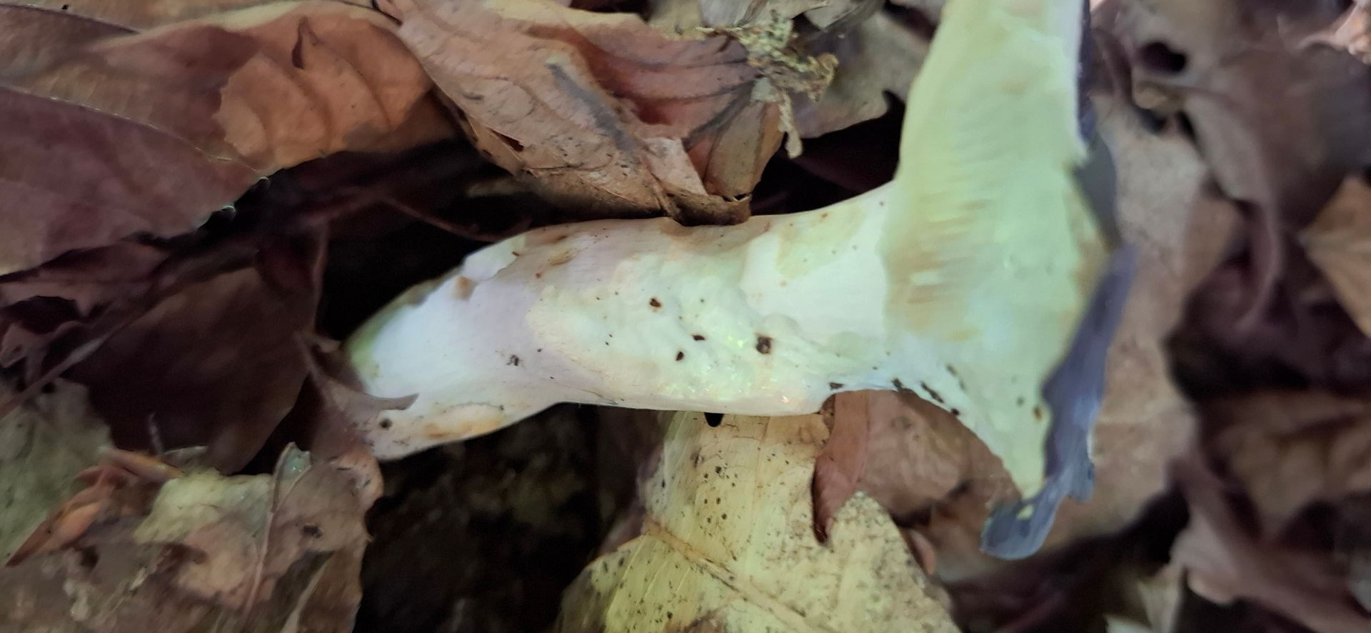 Lamellen ockergelblich. Stiel weißlich, mit bräunlich/gelblichen Verfärbungen, zur Basis etwas dicker. Lamellen deutlich brüchig. Auffälliger säuerlicher Geruch, in der Nase fast leicht stechend wirkend, wie diese leicht stechende Nöte von Essig oder wie wenn man an einem Senfglas riecht, dieses säuerlich schärfliche in der Nase.