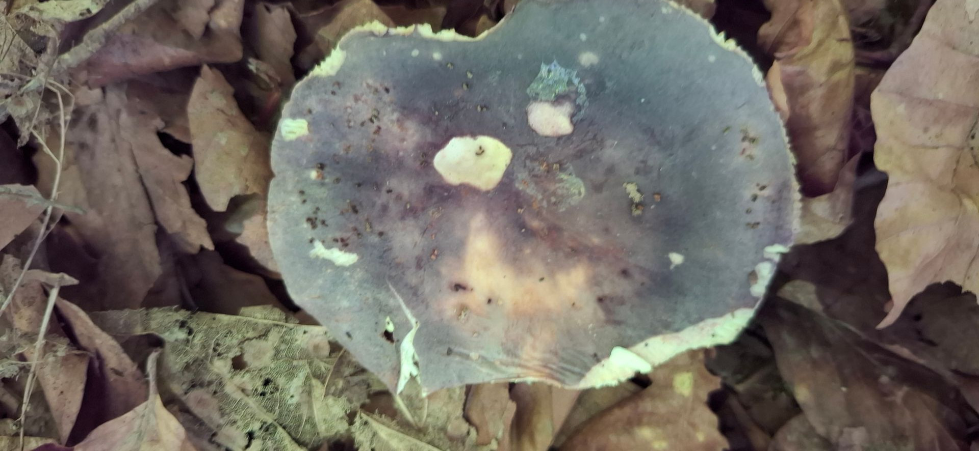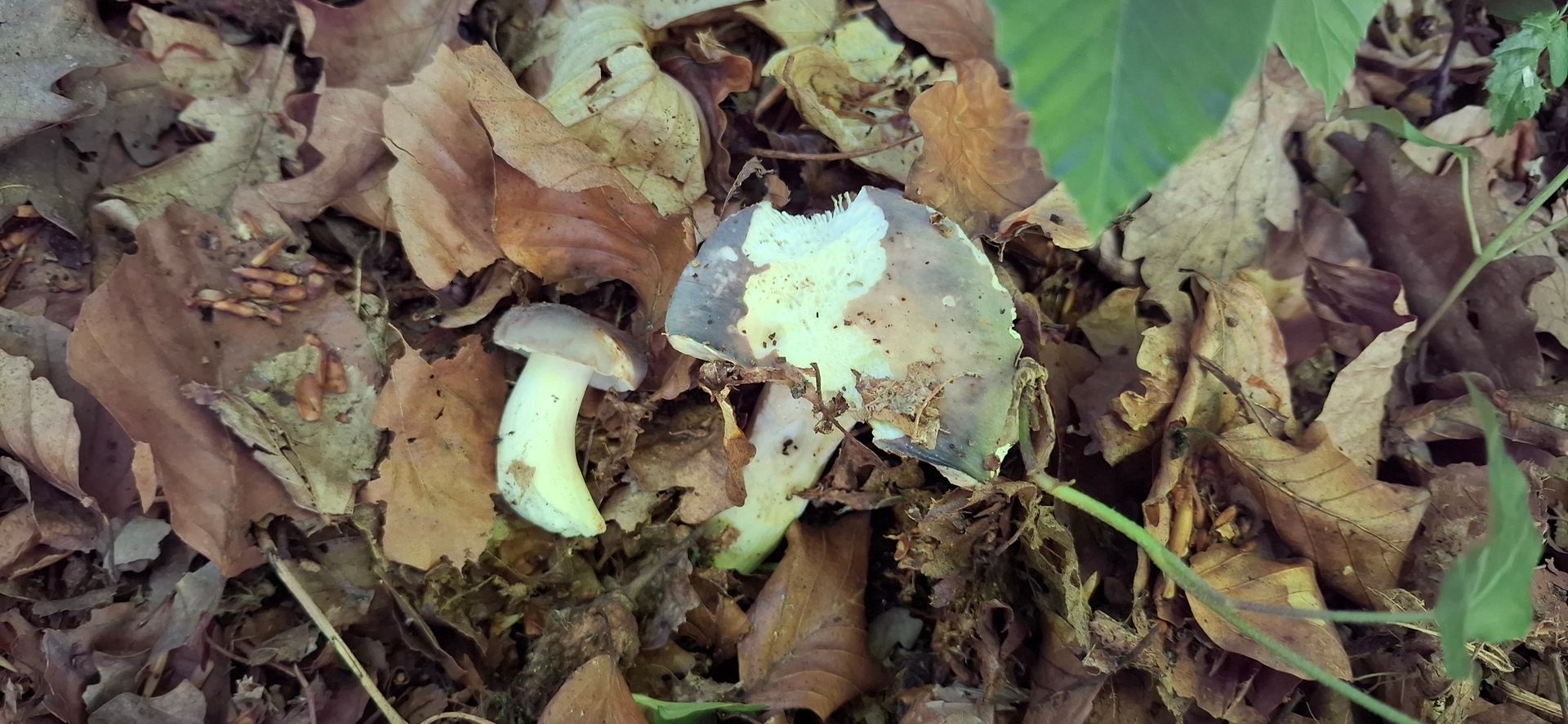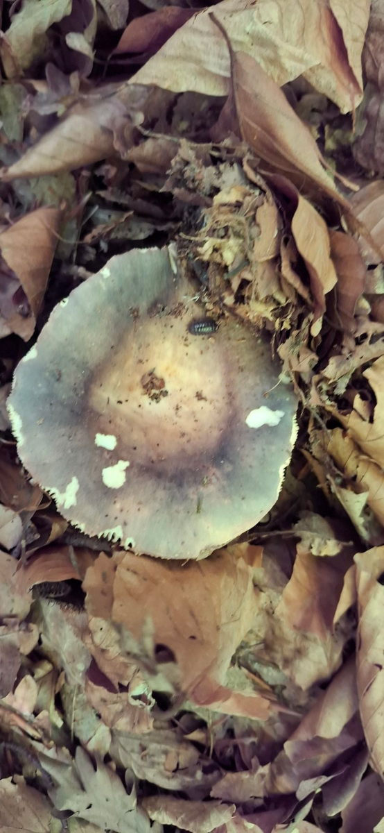 6. In gutem Zustand für die Pfanne, heute leider bis auf einen kleinen nix, den hab ich zum Verkosten genommen. Gräulich, rosalich, violett, gelblich, jung weißliche Lamellen, älter cremefarben, Lamellen brüchig, Stiele teils leicht rosalich überhaucht, unter der Huthaut ebenfalls leicht rosalich, Geschmack ein ganz kleines bischen schärflich, da denke ich an Russula inonochlora - Papageitäubling. Stelle ist bekannt, lecker sind sie auch ![]()