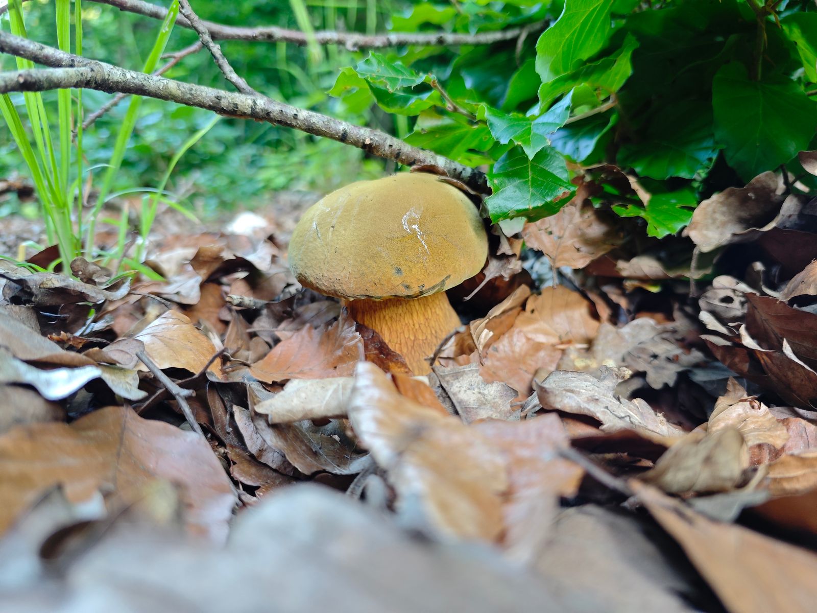 Etwas später zeigten sich dann im Gebüsch hinter einer Erdbeerfläche ein paar überständige Sommer-Steinpilze. Ein genauerer Blick ins Gebüsch brachte noch drei jüngere Exemplare zum Vorschein.