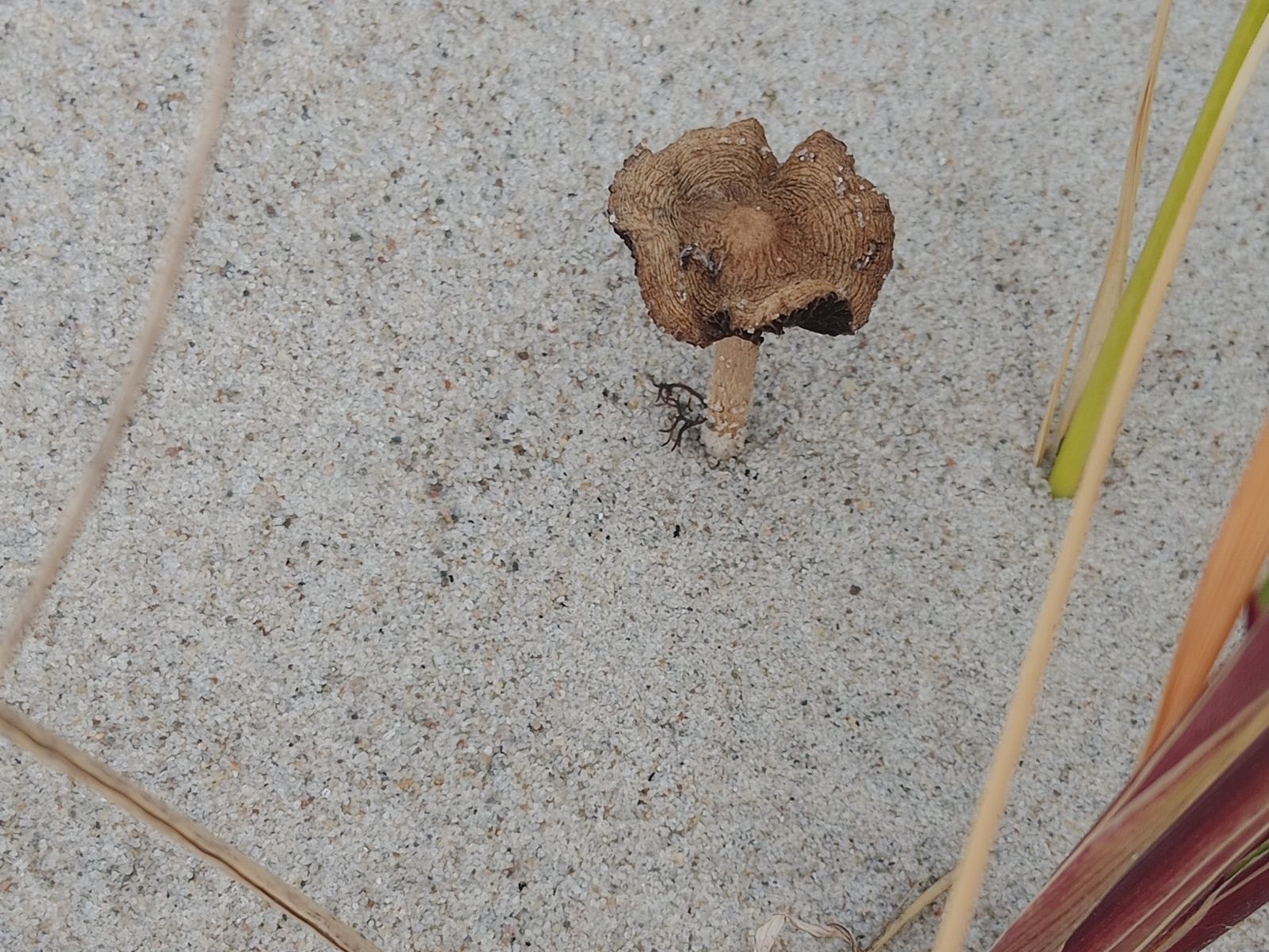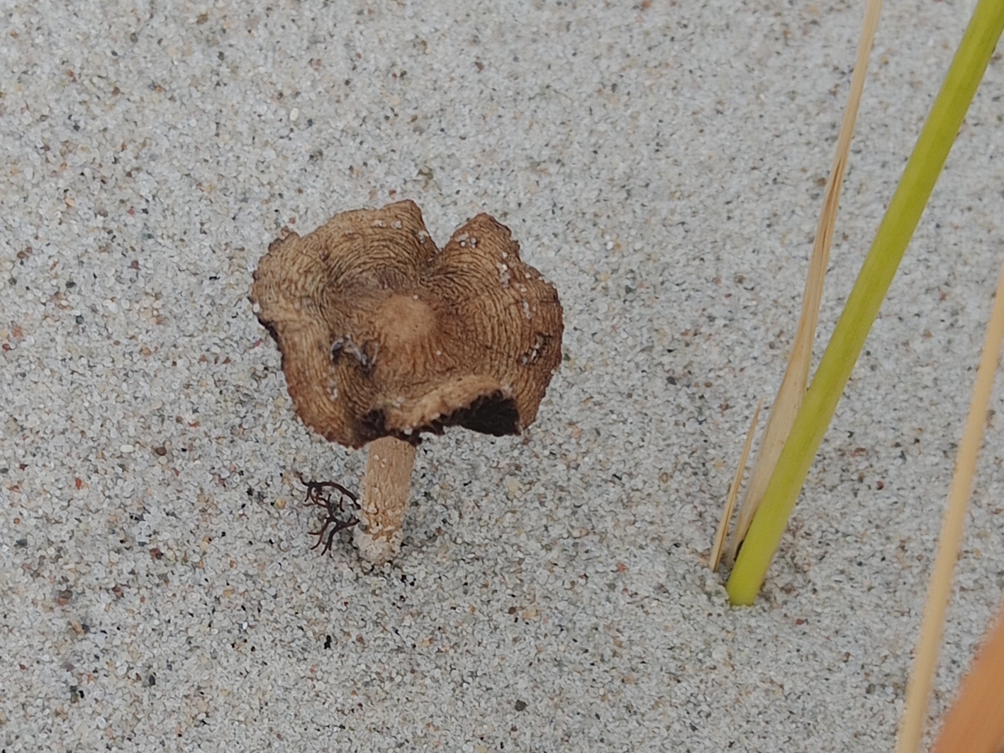 Hallo Ja, am Strand, in den Dünen, da wächst ein Pilz! Allerdings nichts für die Pfanne. Aber ein richtig extremer Standort. Dünenfaserling (Psathyrella ammophila)