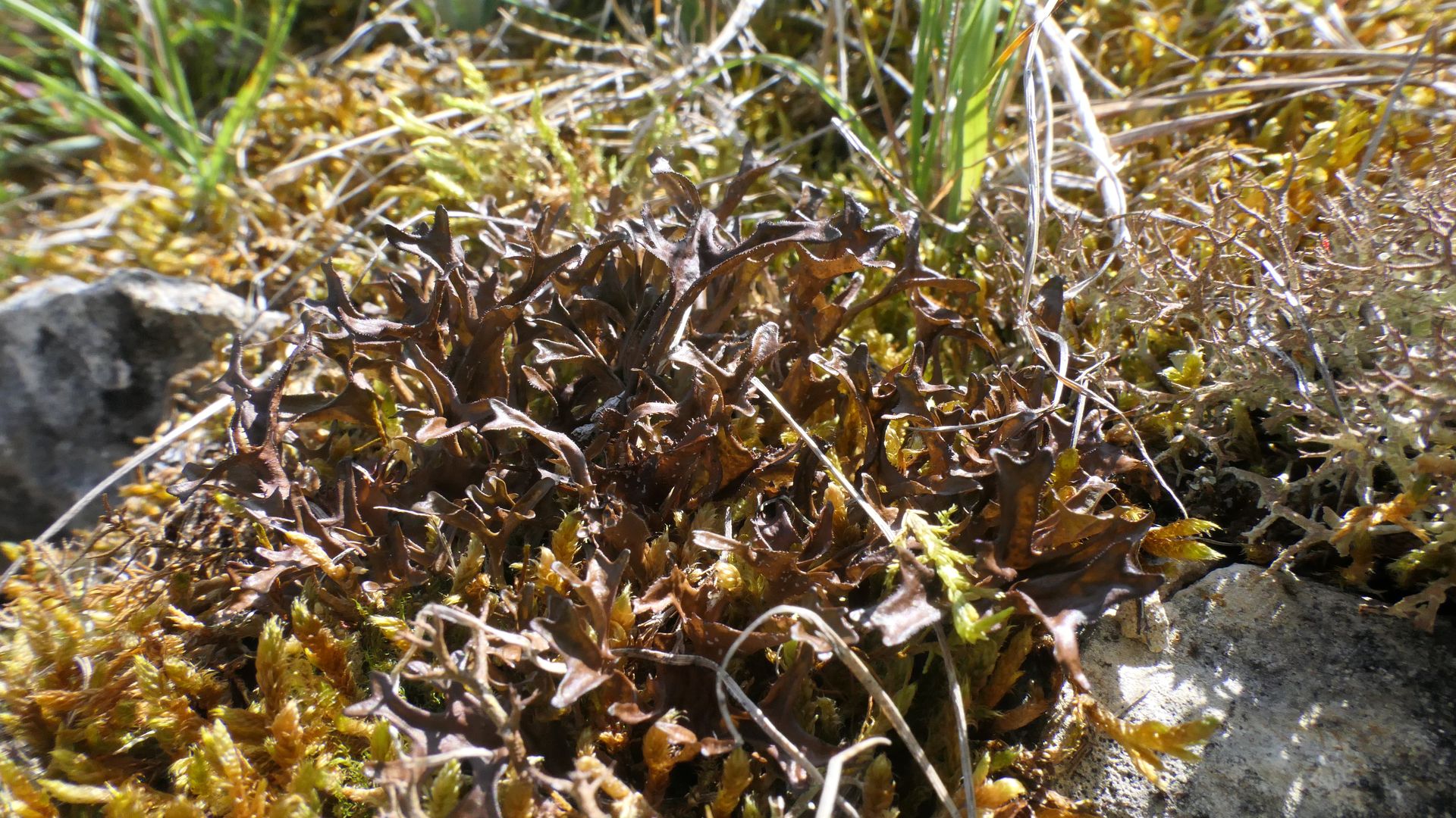Bild 15a Schwarz-violette, stachelige Hornflechte Cetraria aculeata zwischen brauner Cladonia furcata und mir leider unbekanntem Moos.
