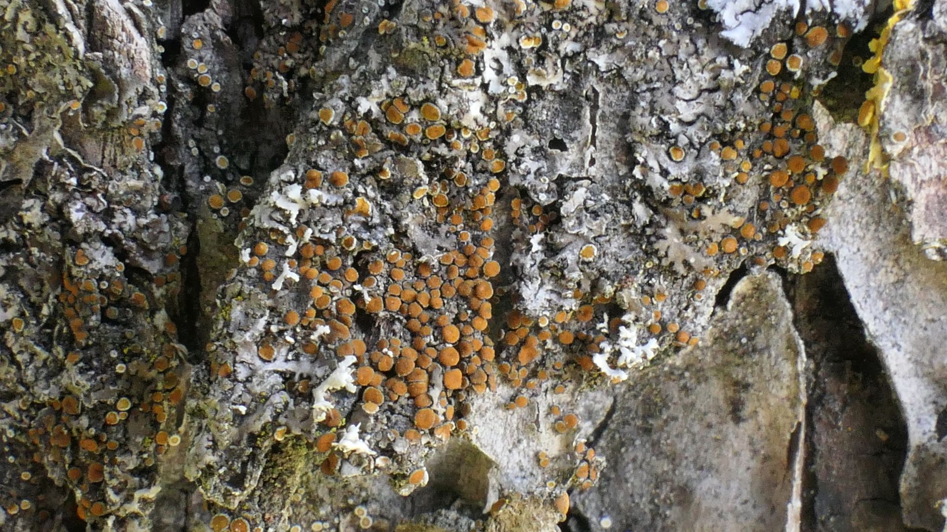 Bild 17 Gelbe, später orange Apothecien (K+, C-) mit weiß bereiftem Thallusrand, ohne Eigenrand.