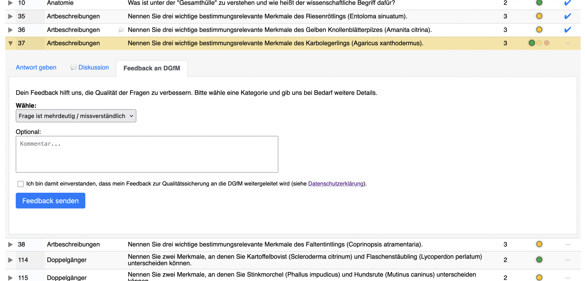 Feedback zum Fragenkatalog: Die Möglichkeit, direktes Feedback zu den Fragen an die DGfM zu senden. Fällt euch etwas auf oder habt ihr einen Verbesserungsvorschlag, wird dieses Feedback gesammelt und zur Qualitätsverbesserung weitergeleitet.