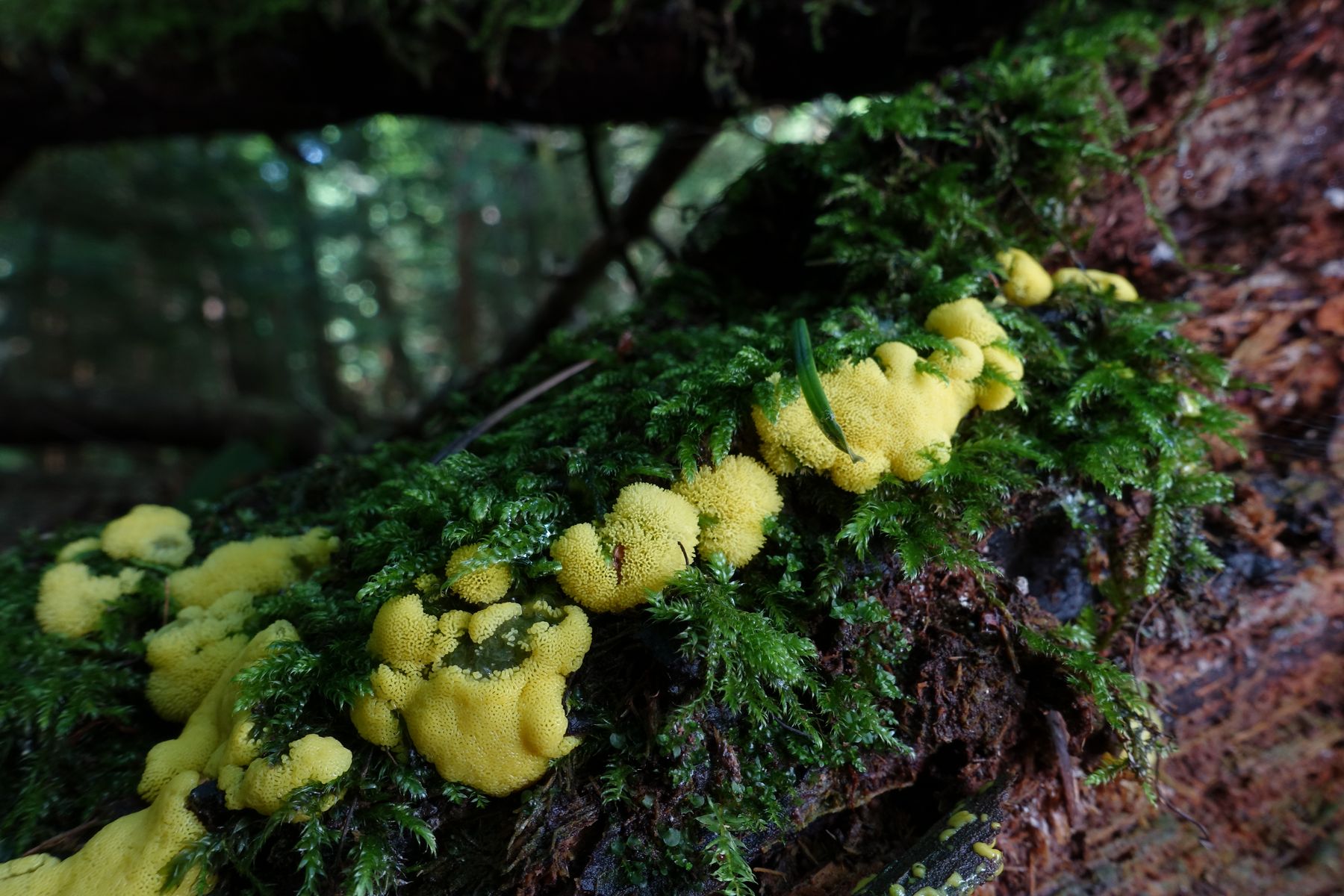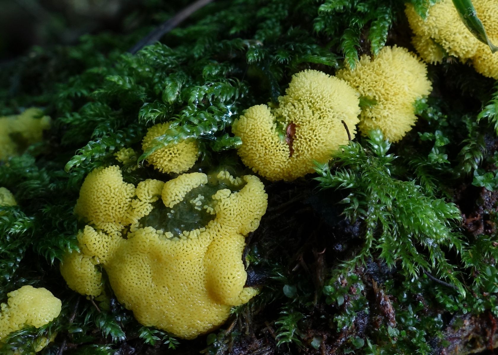 Pilzbestimmung Schleimpilze: Ist das Ceratiomyxa fruticulosa var. porioides? Und ist der gelbe Pilz auch ein Schleimpilz und welcher?