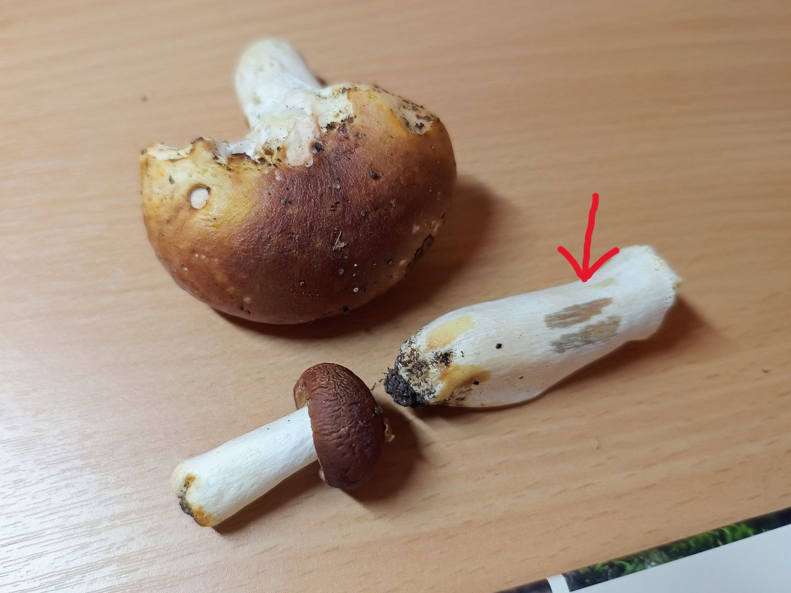vielen Dank für eure Expertise! Dass man sich bei der Täublingsbestimmung nicht unbedingt auf die Hutfarben verlassen sollte weiß ich. Da habe ich die Variabilität von R. velutipes unterschätzt. Tatsächlich hatte ich Eisensulfat zur Hand und hatte es auch auf der Stielrinde getestet (s. Bild unten). Die Beurteilung fällt mir aber noch ziemlich schwer. Zunächst sah die Verfärbung eher gräulich aus. Danach war schon eine leichte Farbe zu erkennen. Ob das nun aber eher orange oder rosa war, konnte ich nicht einschätzen. Anhand des Fotos nun wahrscheinlich auch nicht mehr sicher zu beurteilen.