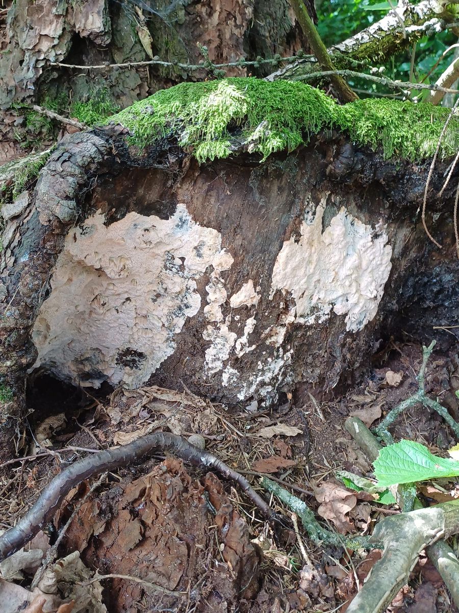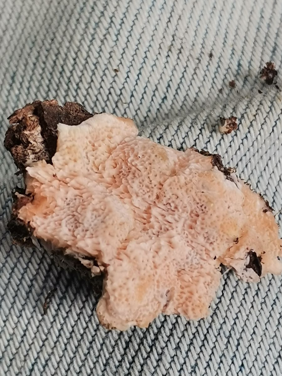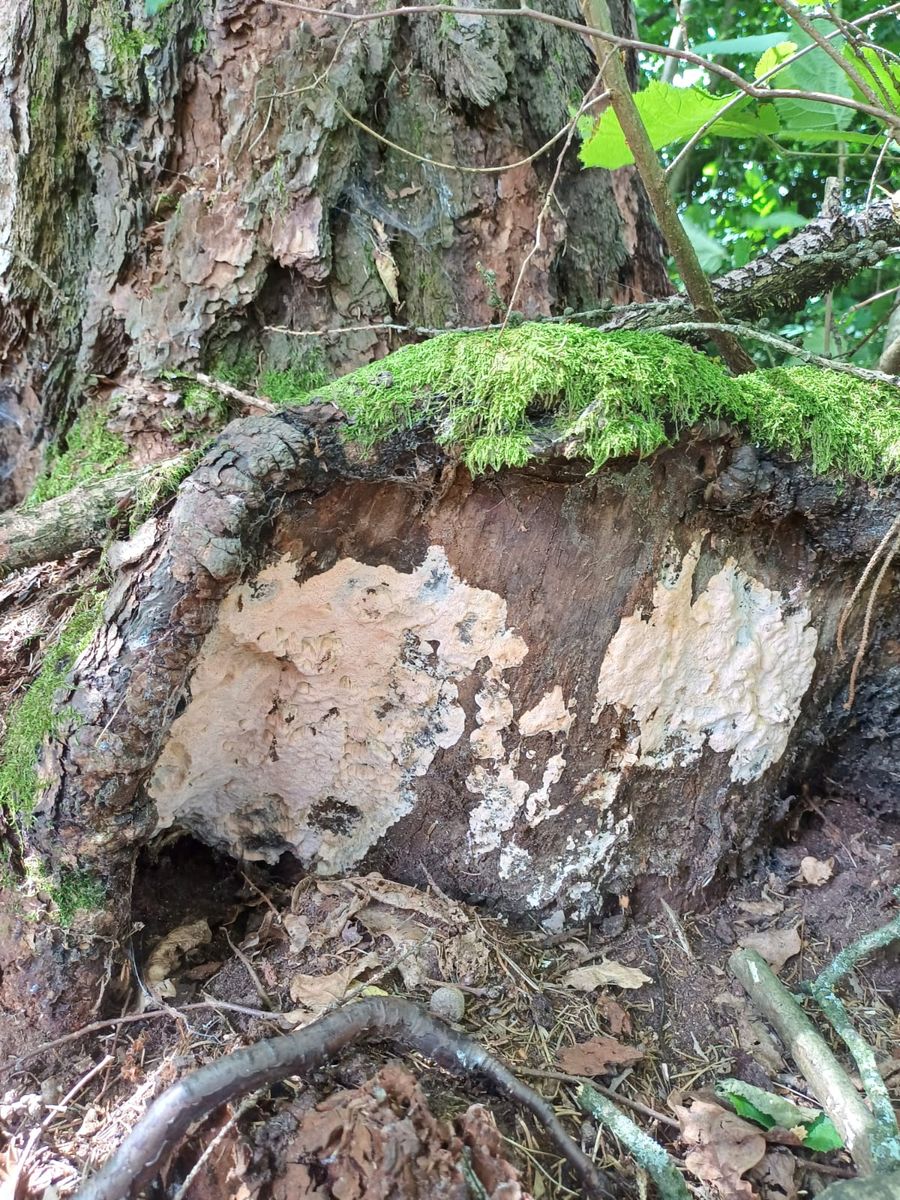 Ich denke hier an rhodonia placenta der wirt ist eine Lärche und es riecht fruchtig lg aber sicher bin ich nicht.