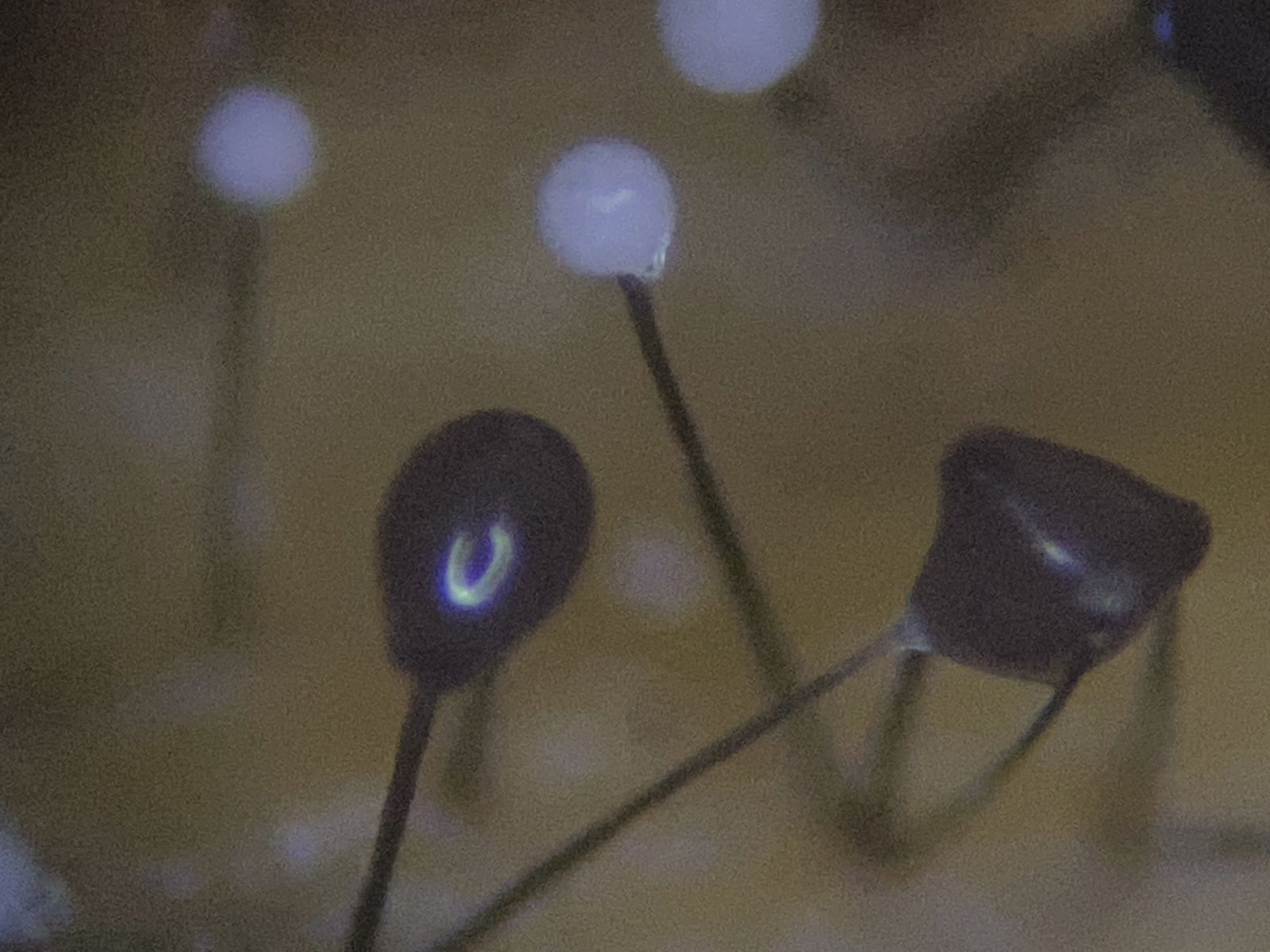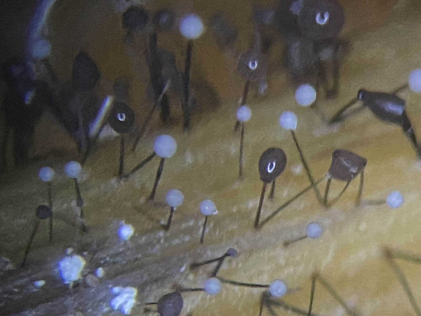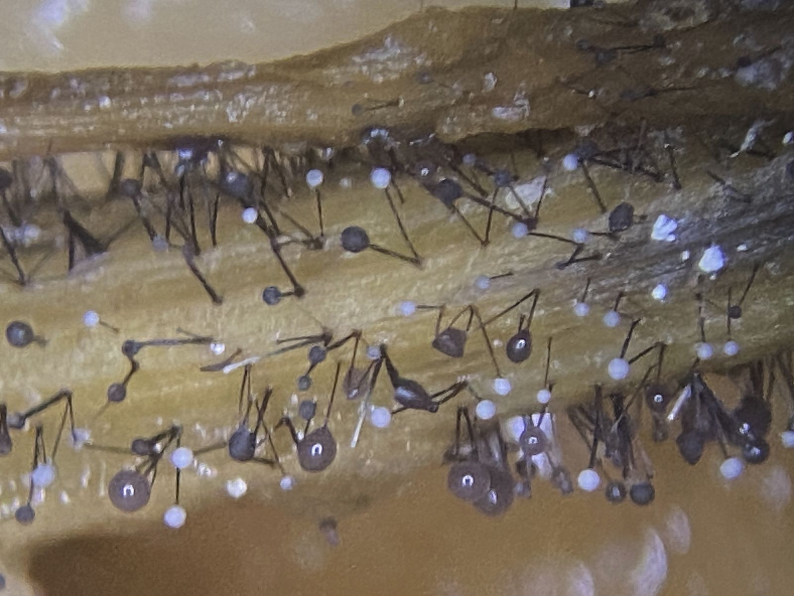 Könnte das eine Crinula sp. sein. Oder evtl. eine Stromatographium sp. Oder Arthrobotryum sp. etc. Jedenfalls kein Schleimpilz der Art Comatricha nigra, schon wegen der Konidien/Sporenform. Evtl. sind auch weiße und schwarze Köpfen jeweils etwas anderes.