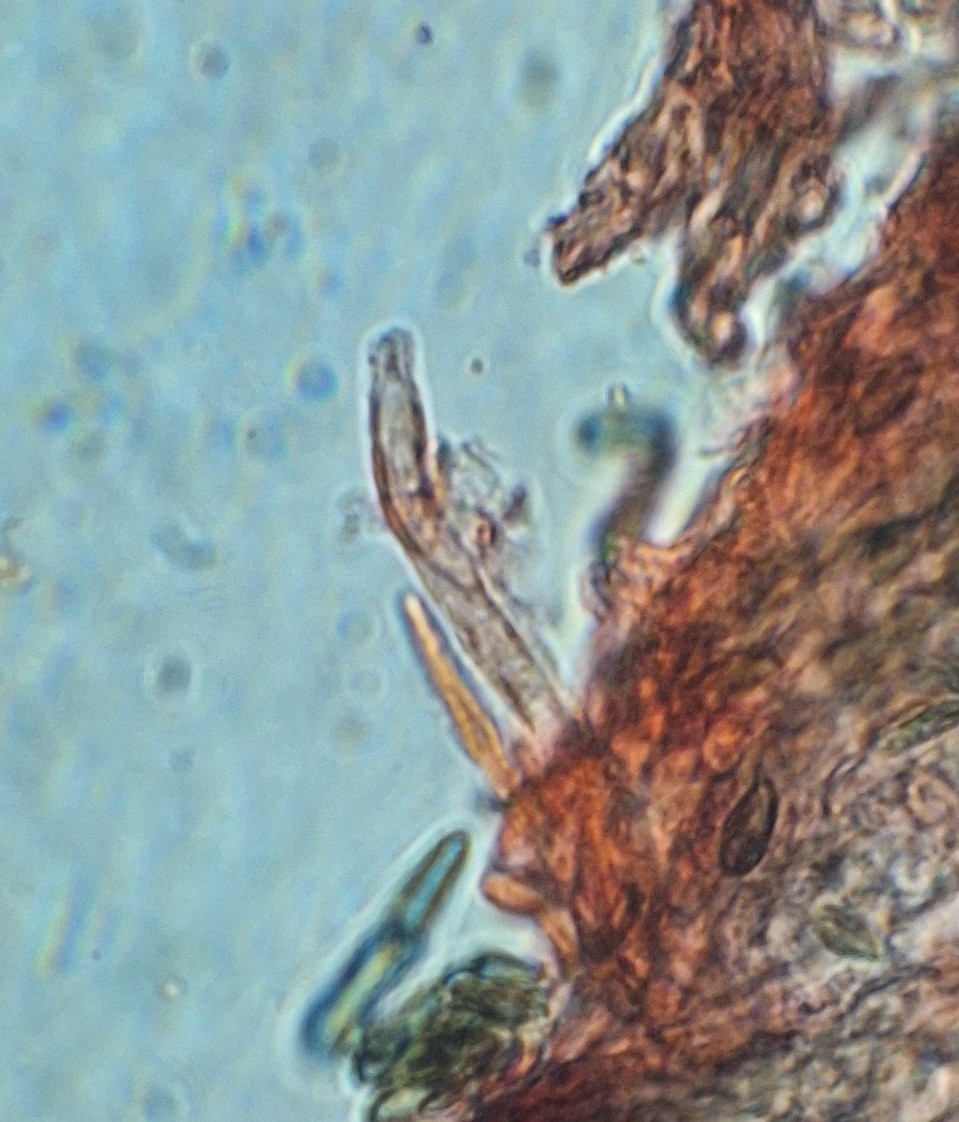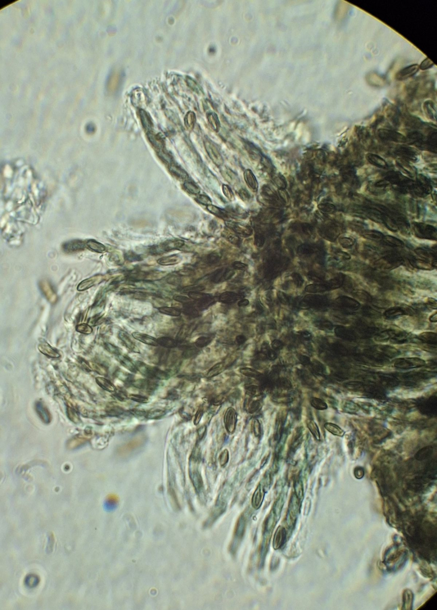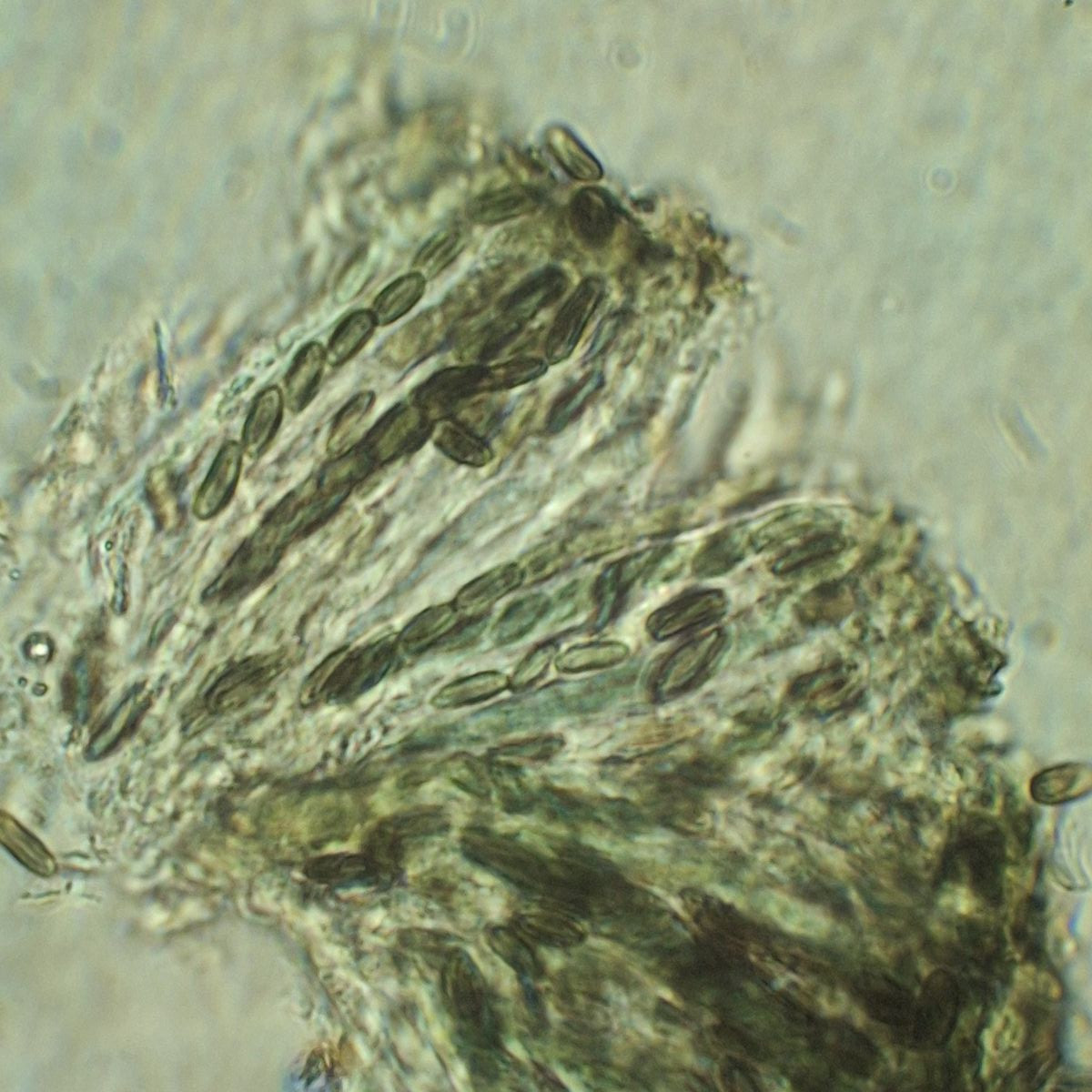 Unterm Mikroskop ist es mir nicht gelungen, Asci zu separieren und sauber abzubilden. Nach dem wass man erahnen kann, sind sie etwa 40-45 mm lang. Die Sporen sind nicht separiert, hellbraun, glatt, länglich