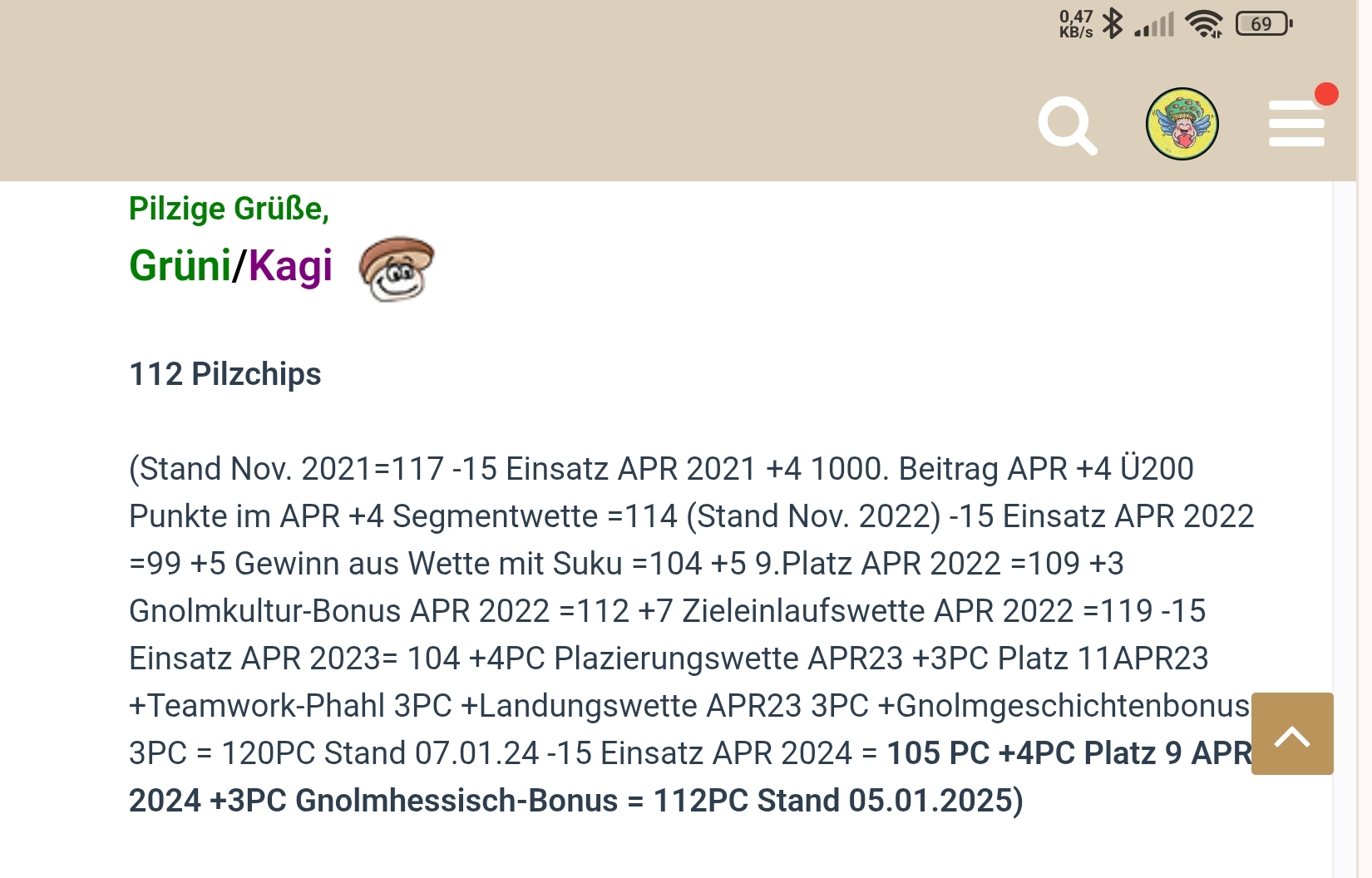 (120PC Stand 07.01.24 -15PC Einsatz APR 2024 = 105PC +4PC Platz 9 APR 2024 +3PC Gnolmhessisch-Bonus +3PC für Sozialphahl= 115PC Stand 05.01.2025 -15PC Einsatz APR 2025 = 100PC +3PC 1. Rätzler über die Mitte +3PC Am nächsten an Schnapspunktzahl 222 +2PC 1500. Beitrag im Rätzelthread +3PC Selbsteinschätzung +3PC Bonus Bunte Gratulations-Lobhudelei +3PC Sondierungsphahl Salate = 117PC Stand 10.01.2026)