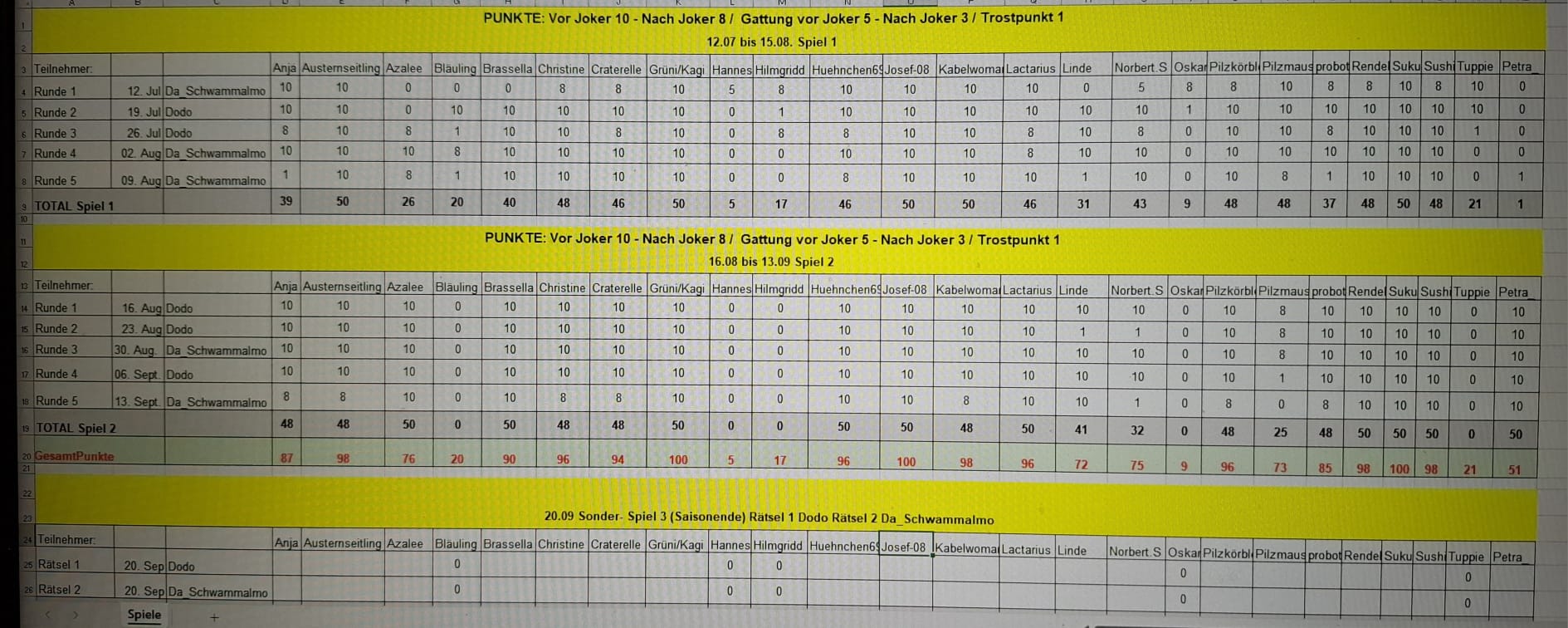 Innerhalb der letzten fünf Rätzel konnten diese Rätzler folgende Punkte erreichen: