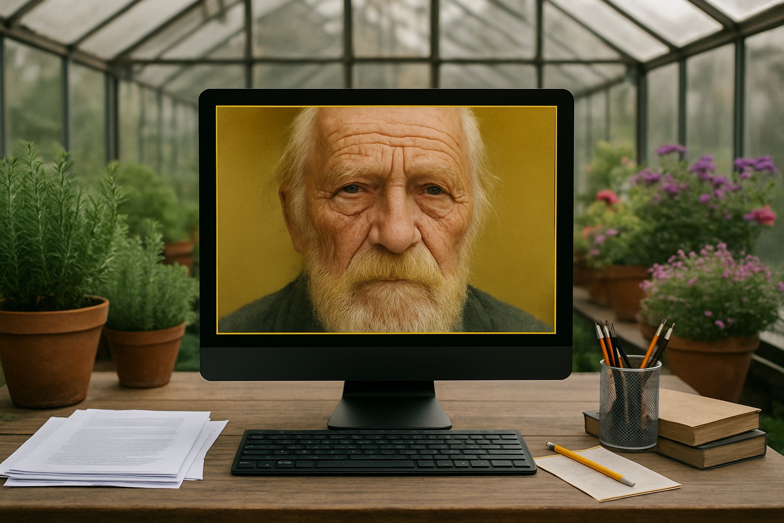 Wie kommt man darauf? 1. Ein PC mit einem gelbumrandeten Bildschirm auf dem das Gesicht eines älteren Mann zu sehen ist. Das Gesicht ist reich an Falten, er hat blondgelbe Haare und der Hintergrund ist ebenfalls gelblich. Der Tisch mit dem Computerbildschirm steht in einem Gewächshaus wo man diesen Pilz in den Blumen/Kräutertöpfen finden kann.