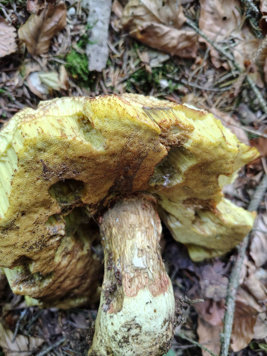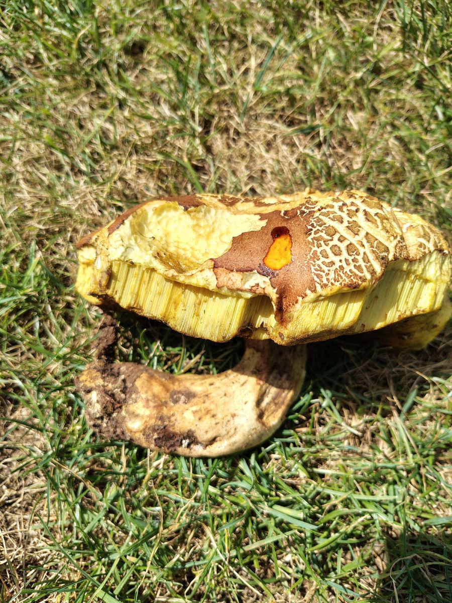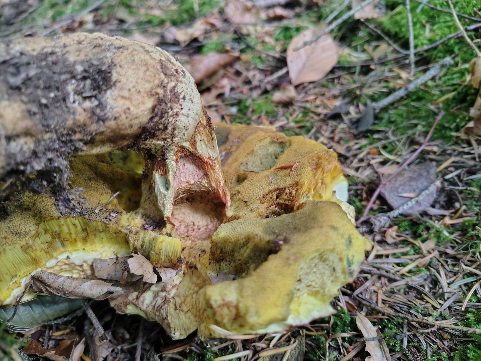 Heute hab ich mal wieder einen Butyriboletus gefunden. Etwas nervig dass der schon so mitgenommen ist (3 andere Exemplare die ich stehen lassen habe sahen noch viel schlimmer aus). Der sieht zwar etwas nach Mumie aus aber das täuscht ein Bisschen, der Hut war nur leicht weich, der Stiel sogar noch komplett fest.