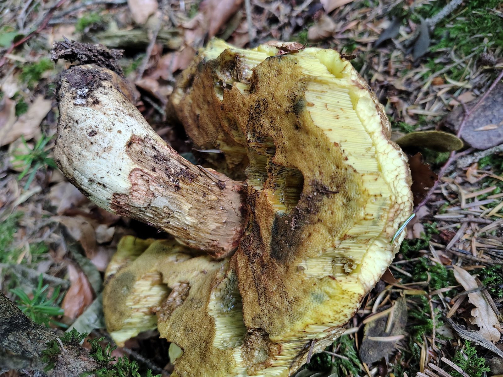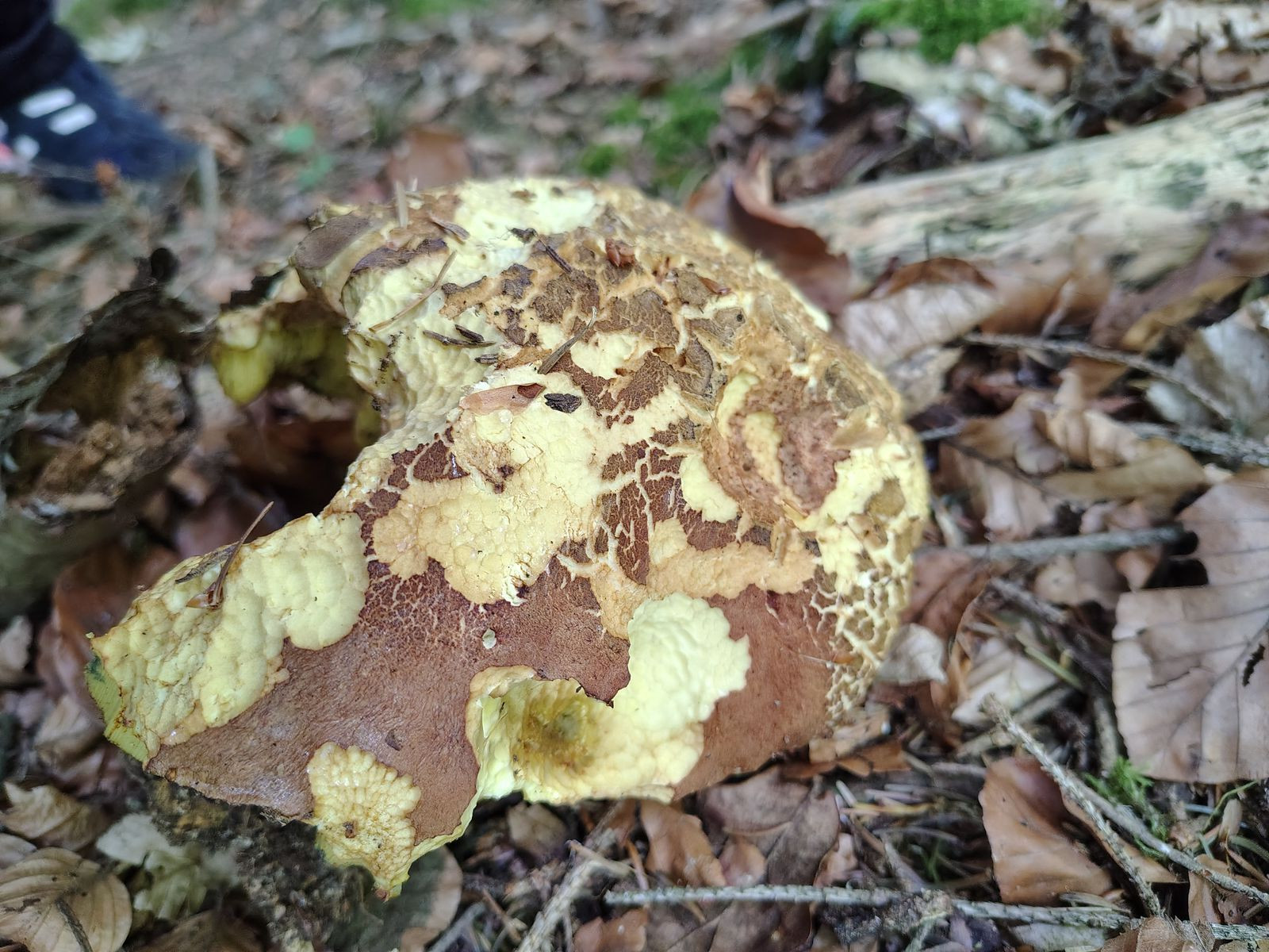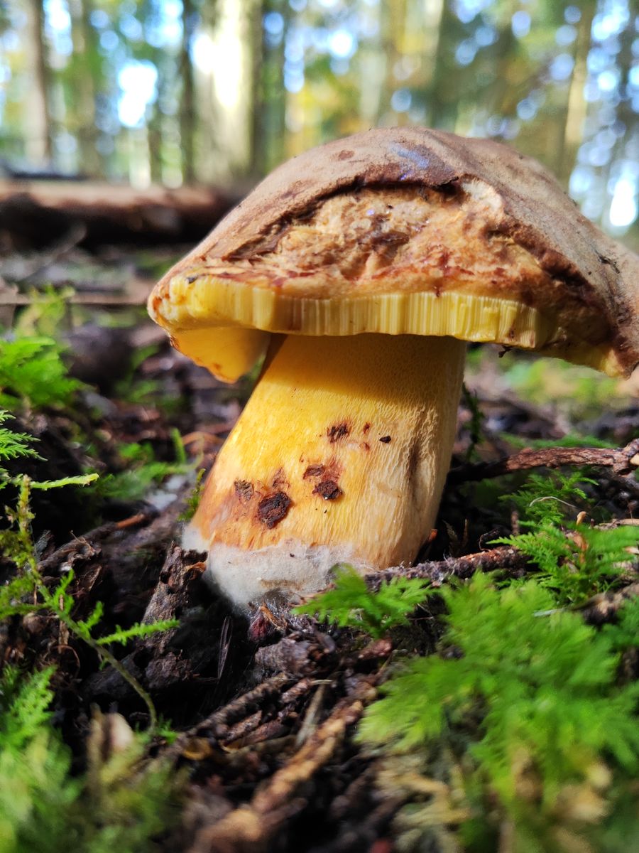 Heute hab ich mal wieder einen Butyriboletus gefunden. Etwas nervig dass der schon so mitgenommen ist (3 andere Exemplare die ich stehen lassen habe sahen noch viel schlimmer aus). Der sieht zwar etwas nach Mumie aus aber das täuscht ein Bisschen, der Hut war nur leicht weich, der Stiel sogar noch komplett fest.