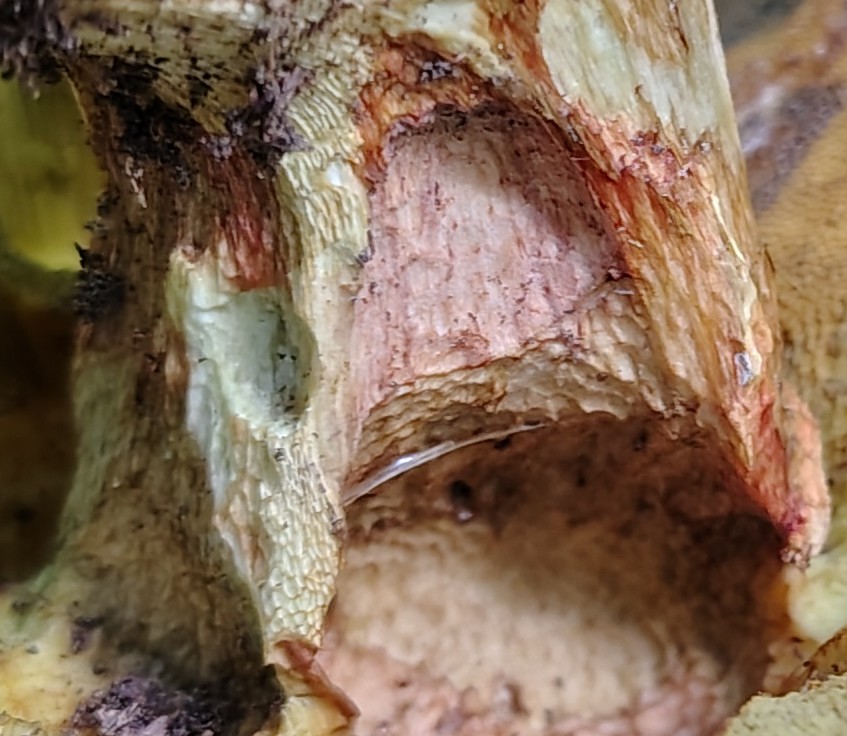 Eigentlich halte ich das für B. appendiculatus, aber das Habitat, das fehlende Anhängsel und das nicht Blauen im Fleisch macht mich etwas stutzig. Kann den jemand festnageln? Übrigens müssen die bei desaströser Trockenheit gewachsen sein, die kamen sicher noch vor dem Regen am Dienstag; am Dienstag letzte Woche kamen zwar 10l aber davor wars furztrocken. Das Habitat hält zwar die Feuchtigkeit sehr gut (was auch irgendwie gegen appendiculatus spricht, ich kenne den von eher trockenen Stellen) aber das ist trotzdem krass.
