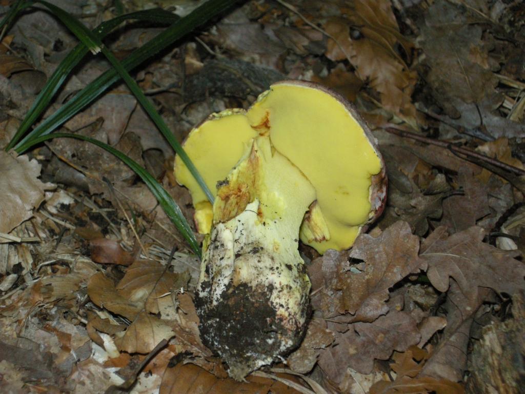 Sonst glaube ich den anhängselröhrling gefunden zu haben, diesen fand ich im kalkigen eichenwald. der pilz hat ein auffällig festes Fleisch, innen hellgelb, nicht oder nur leicht bläuend. Röhren bläuen auf druck leicht: