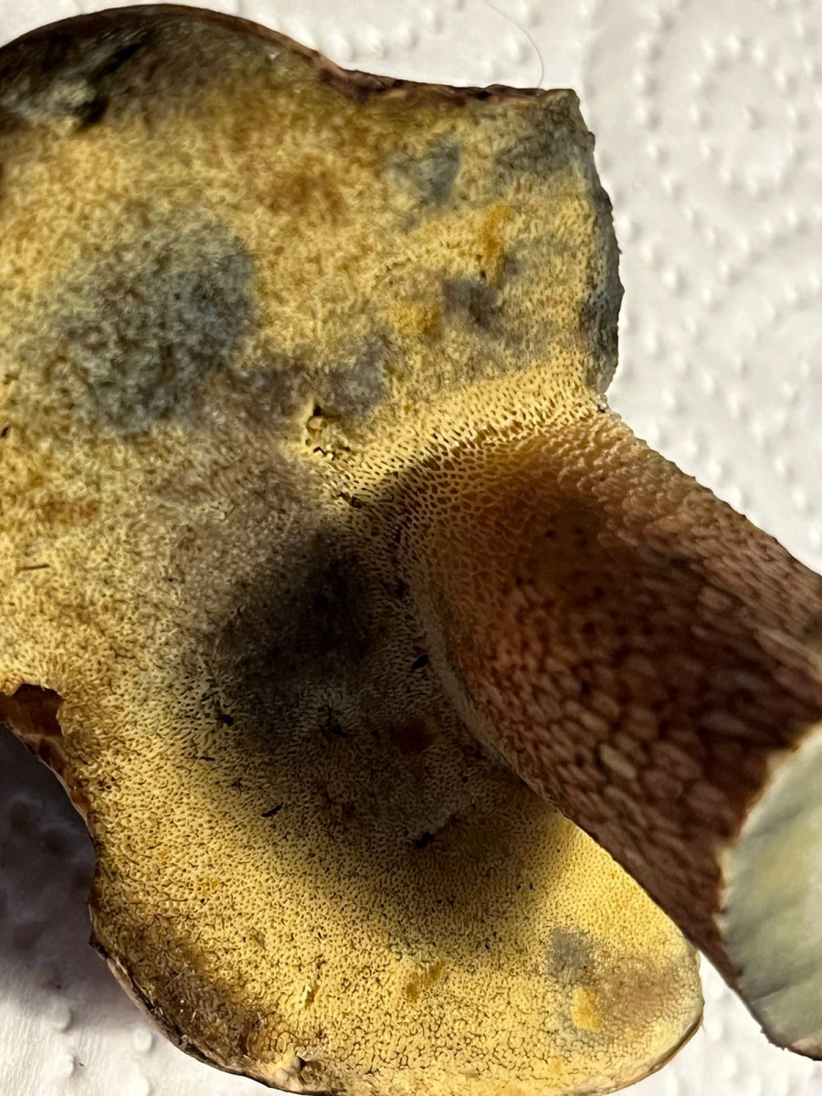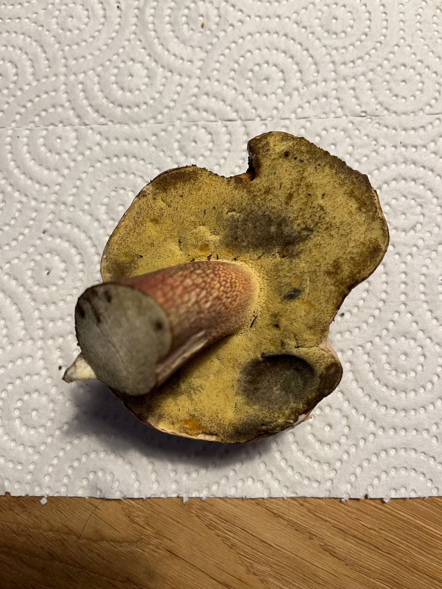 Was ich auch immer gut finde, ist, wenn man seine Meinung belegt, also wenn man dazu schreibt wie man zu seiner Meinung kommt. Genau das ist hier der Fall, und das bietet beste Gelegenheit zum Weiterlernen. Noch dazu hätte ich einen Tipp, wie man beim Bestimmen solcher Röhrlinge grundsätzlich vorgeht, um nicht bloß raten zu müssen. Hier wäre es zielführend gewesen, den Pilz ganz zu lassen und nicht abzuschnippeln oder gar vorzuputzen. Dann hätte man ein Foto vom ganzen, unversehrten Pilz und, da es sich um einen Dickröhrling handelt, eines von der Stielrinde zu machen. Anschließend müsste man den Pilz längs (also vom Hutscheitel zur Stielbasis) durchschneiden, ein bis zwei Minuten warten ob es blau wird, und vom Schnittbild ein Foto machen. Zum Schluss macht man eine Kostprobe, diese ist bei Röhrlingen mit gelben Poren ja zulässig. Durch diese hätte man die Bitterkeit des Fleisches festgestellt, und dann wäre in Kombination mit dem Blauverhalten außer dem Schönfuß kaum etwas möglich.