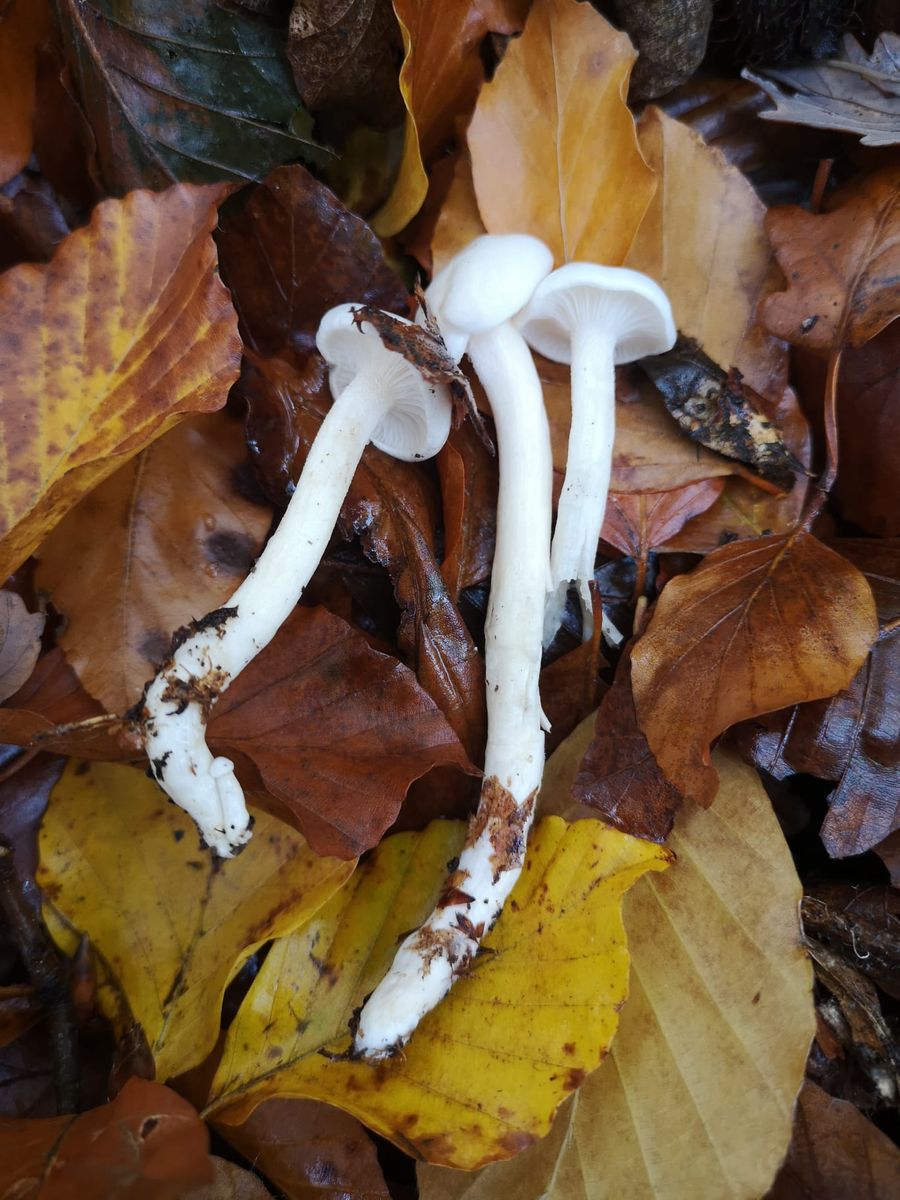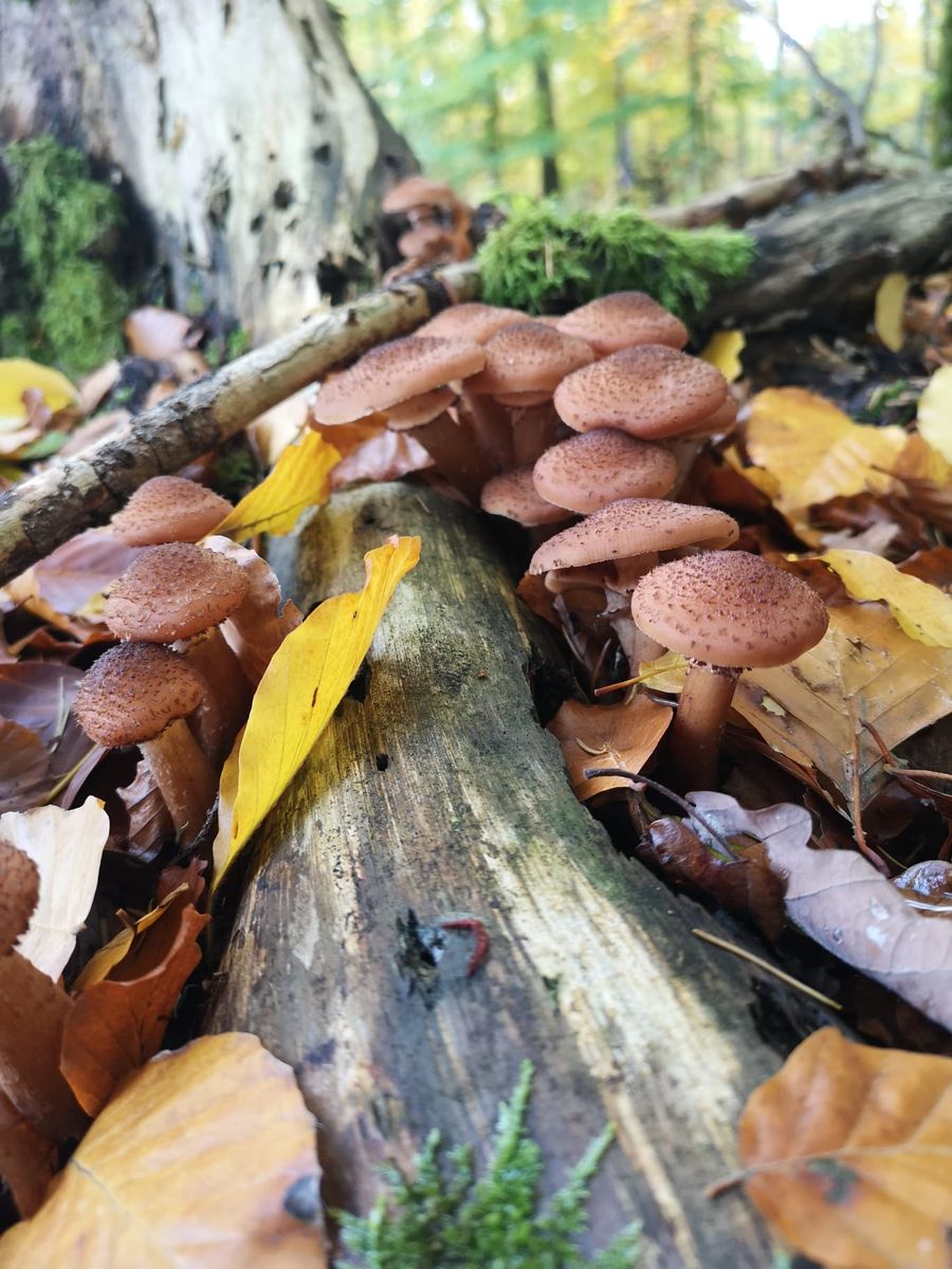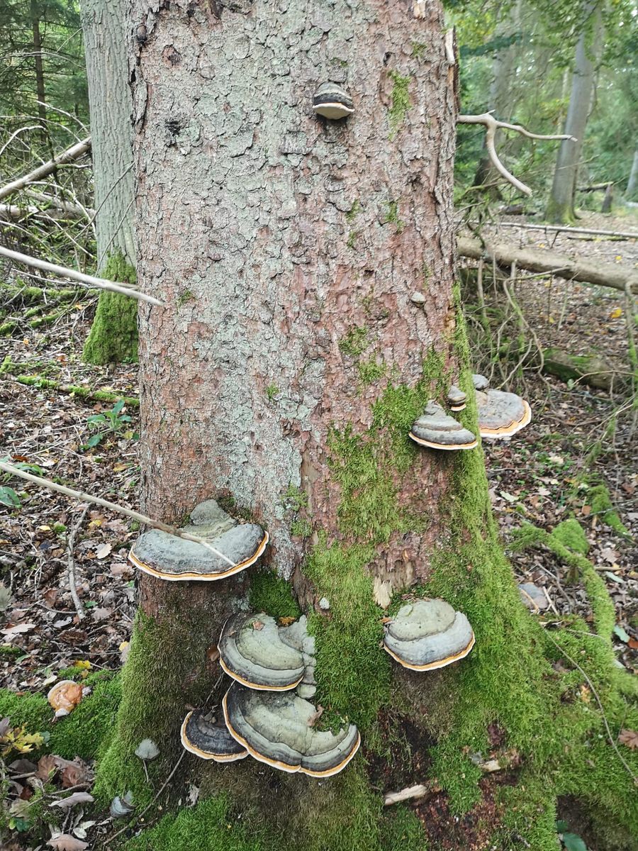 Ich ging in ein Waldstück, das ich aus meiner Kindheit kenne. Damals: dichter, dunkler Fichtenwald, moosig. Fuchs/Dachsbaue in großer Zahl. Ich war schon lange nicht mehr dort, bestimmt 15 Jahre nicht. Die Fichten sind natürlich inzwischen tot bzw. dabei, zu sterben, Fuchs und Dachsbaue sind nicht mehr erkennbar, überwuchert und vermutl. nicht mehr bewohnt. Nach dem Stück "Fichtenwald" kam ein von Buchen geprägter Laubwald. In den Waldstücken, in denen ich gespäht habe, war es sehr schwül, warm, vermeintlich beste Bedingungen für so manche Fruchtkörper.