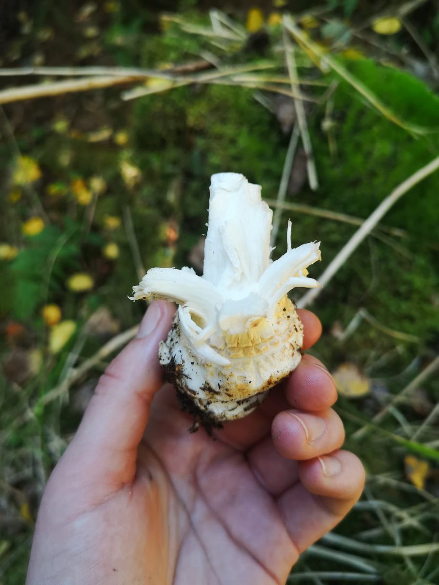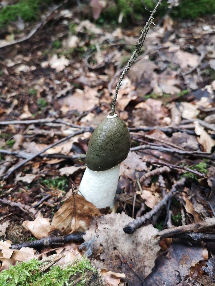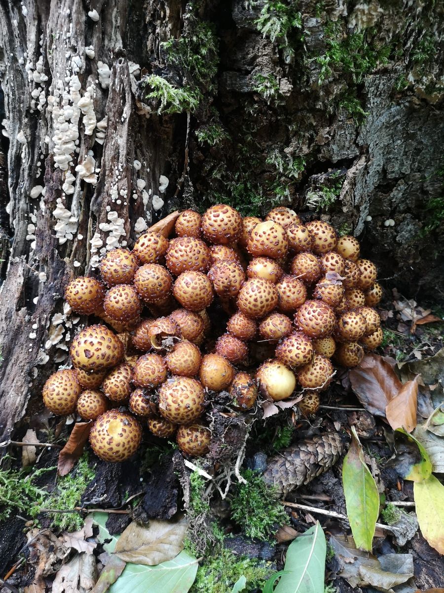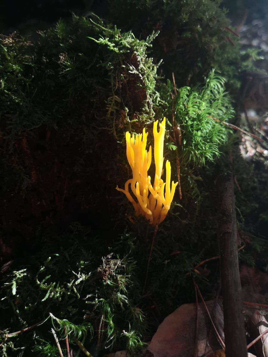 Ich ging in ein Waldstück, das ich aus meiner Kindheit kenne. Damals: dichter, dunkler Fichtenwald, moosig. Fuchs/Dachsbaue in großer Zahl. Ich war schon lange nicht mehr dort, bestimmt 15 Jahre nicht. Die Fichten sind natürlich inzwischen tot bzw. dabei, zu sterben, Fuchs und Dachsbaue sind nicht mehr erkennbar, überwuchert und vermutl. nicht mehr bewohnt. Nach dem Stück "Fichtenwald" kam ein von Buchen geprägter Laubwald. In den Waldstücken, in denen ich gespäht habe, war es sehr schwül, warm, vermeintlich beste Bedingungen für so manche Fruchtkörper.