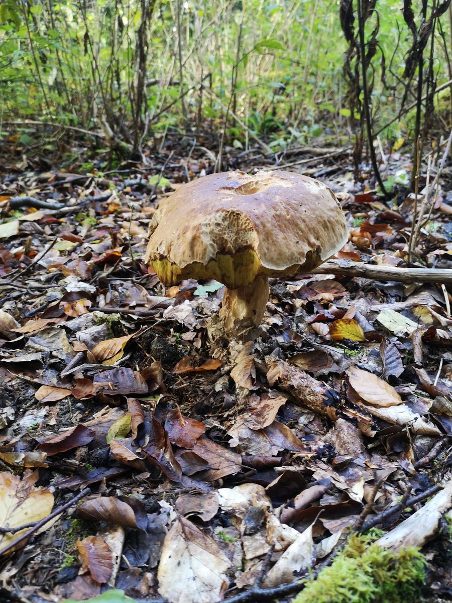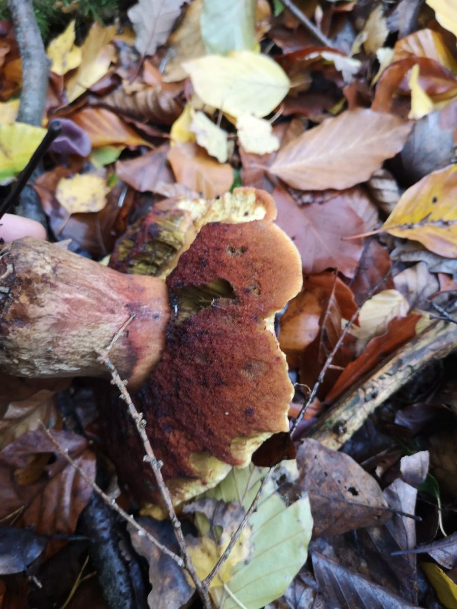 Dann habe ich meine ersten Steinpilze (?) gefunden. Völlig überraschend. Habe noch am Fundort mein Bestimmungsbuch gewälzt, war mir danach trotzdem unsicher, da ich schließlich noch nie zuvor einen Steinpilz gefunden habe. Das Habitat dieser FK bestand vorrangig aus Buchen, einige Eichen und ältere sowie jüngere Fichten (?) waren ebenfalls vertreten.