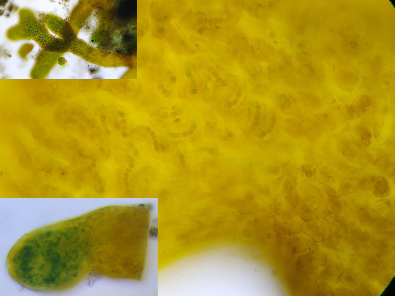 Bild 18 Gelb-grüne Thallusfragmente in Wasser, Nostoc liegt im Gallert in Ketten vor