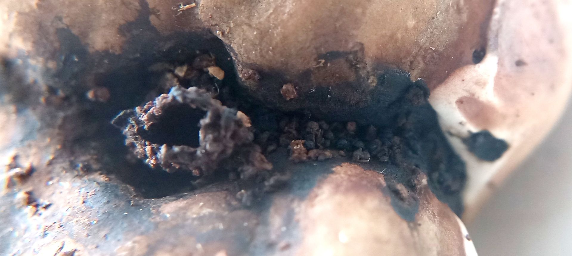Und jetzt weiß ich, warum da so braune Flüssigkeit ist. Irgendwelche Tiere sind die Ursache. Seltsamerweise auf der Oberseite.