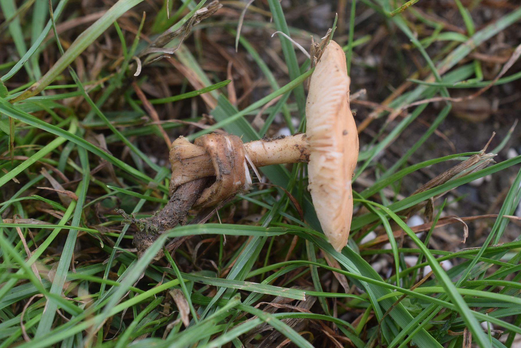 Das könnten Nelkenschwindlinge (Marasmius oreades) sein. Die sollten einen Bittermandelgeruch haben und einen flexiblen Stiel (sodass man einen Knoten reinmachen kann).
