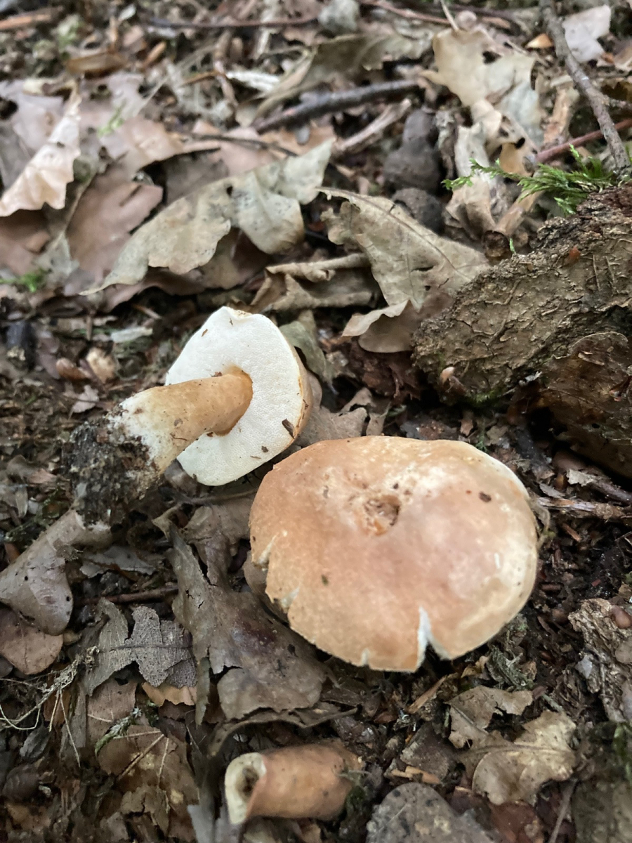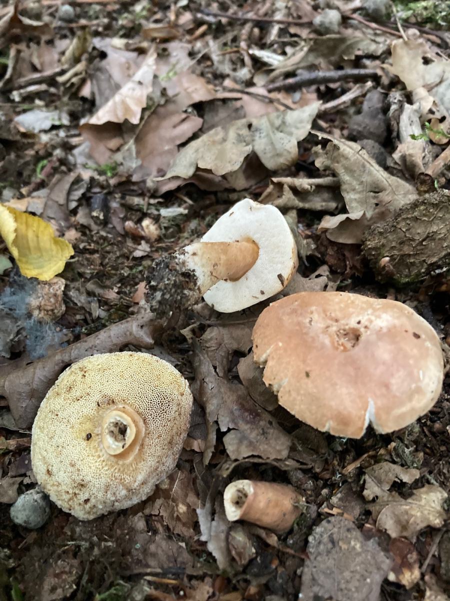 Eine kleine Gruppe kleinhütiger (2-3cm) Röhrlinge mit weißen Röhren war das. Hut- und Stielfarbe recht ähnlich hellbraun ohne Netz. Kein auffälliger Geruch. Das alles direkt unter Eiche. Der Stiel schien teils hohl gekammert zu sein. Kein Blauen oder Röten.