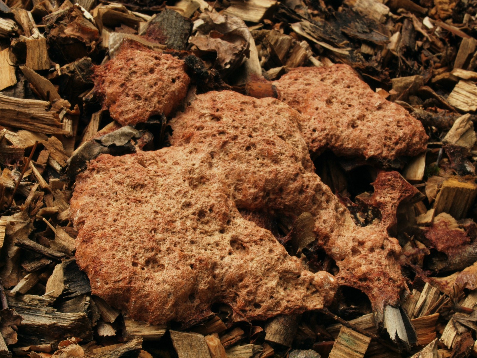 Auf dem gleichen Häckelhaufen breitete sich die Rötliche Lohblüte (Fuligo rufa) aus