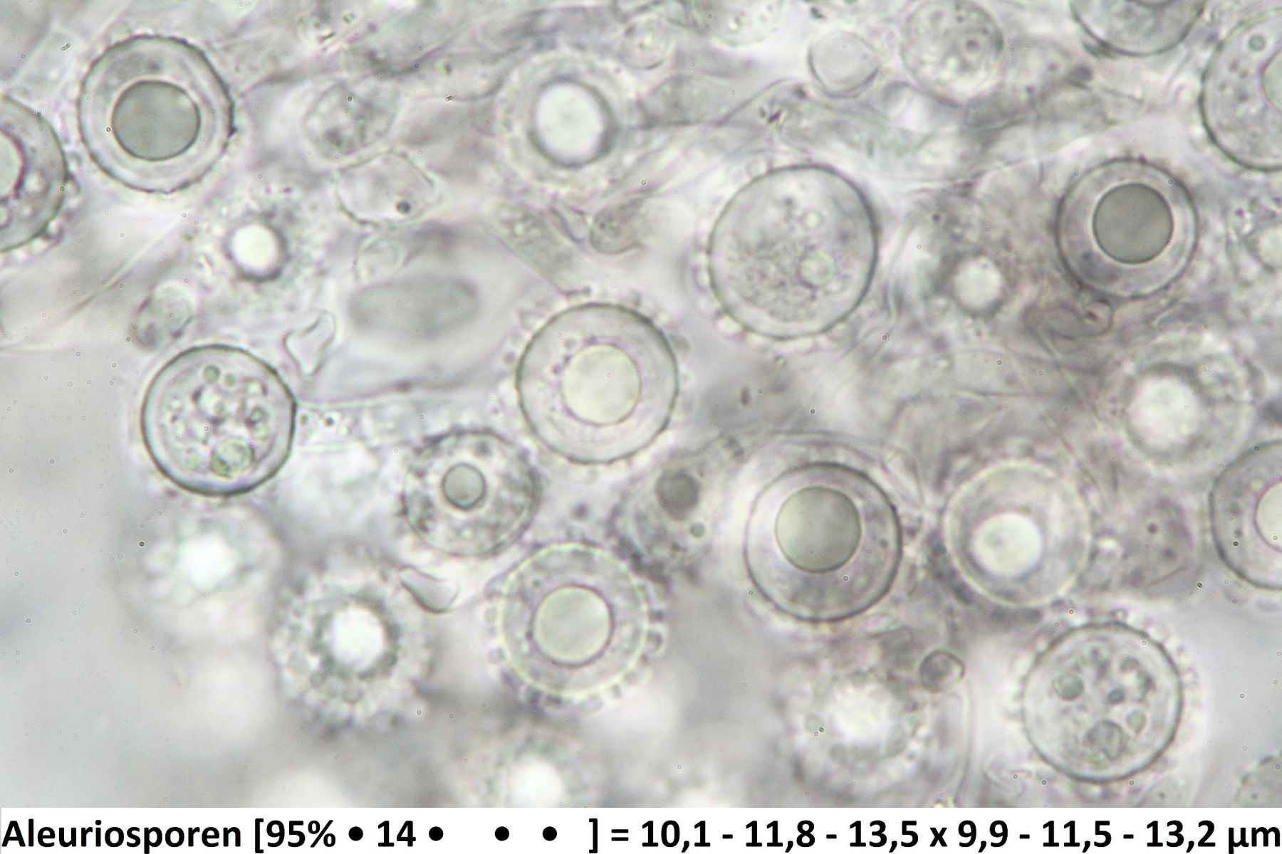 Bei Hypomyces gibt es 2 Formen der Nebenfruchtform. Es gibt einmal die normalen kleinen Konidien und Aleuriosporen, die deutlich größer, anders geformt und oft mit Ornament sind.