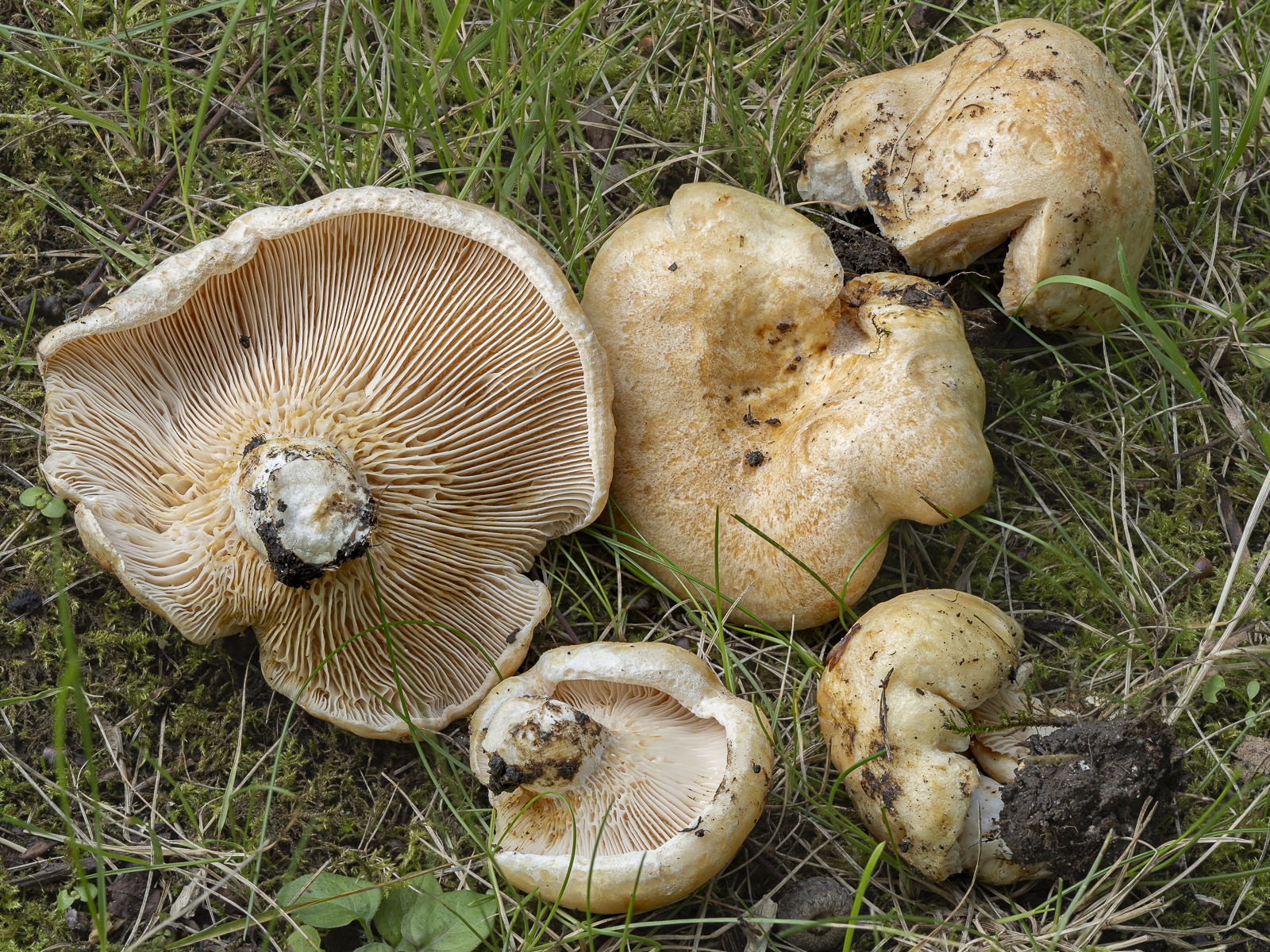 Anfang dachte ich, als die FK noch klein waren, oh, ein gelber, gezonter Milchling mit Gruben am Stiel. Das ist der Lactarius scrobiculatus, der Grubige Milchling.
