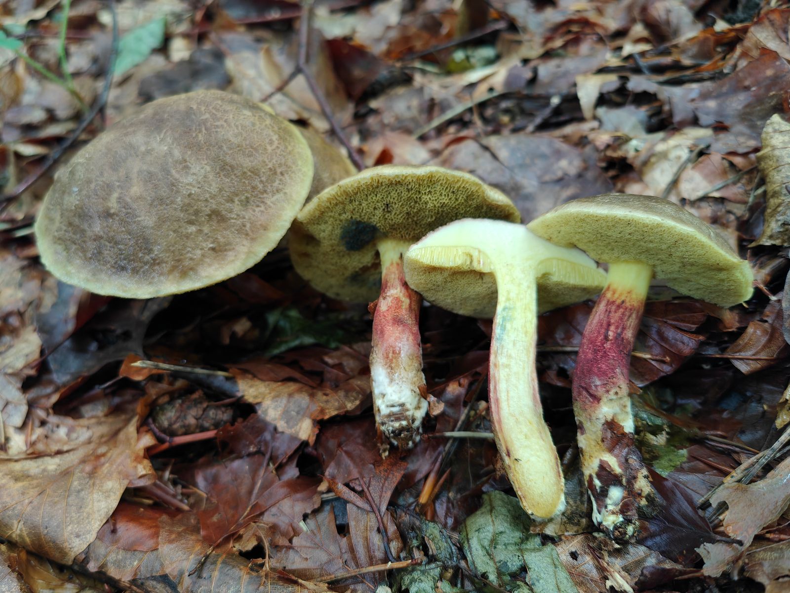 Nr. 1 und 3 haben recht einfarbig gelbes, nicht blauendes Fleisch und einen hellen Hutrand. Das wäre für mich Xerocomellus pruinatus.