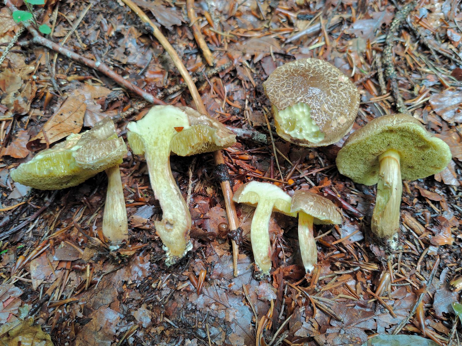 Auf den Bildern, gerade Koll.1, wirkt es so als hätten die Röhren einen grünlichen Schimmer den ich mit chrysenteron in Verbindung bringe. Im Zweifel schaue ich mittlerweile, ob ich subtrunkate Sporen finde (chrysenteron hat solche). Hast du welche mitgenommen?