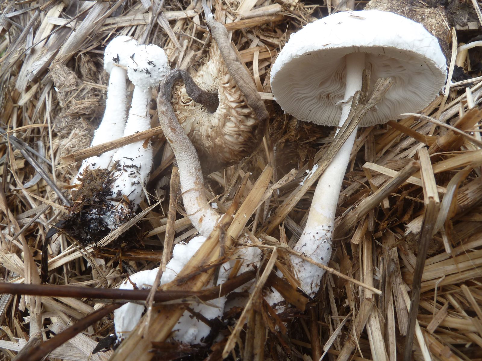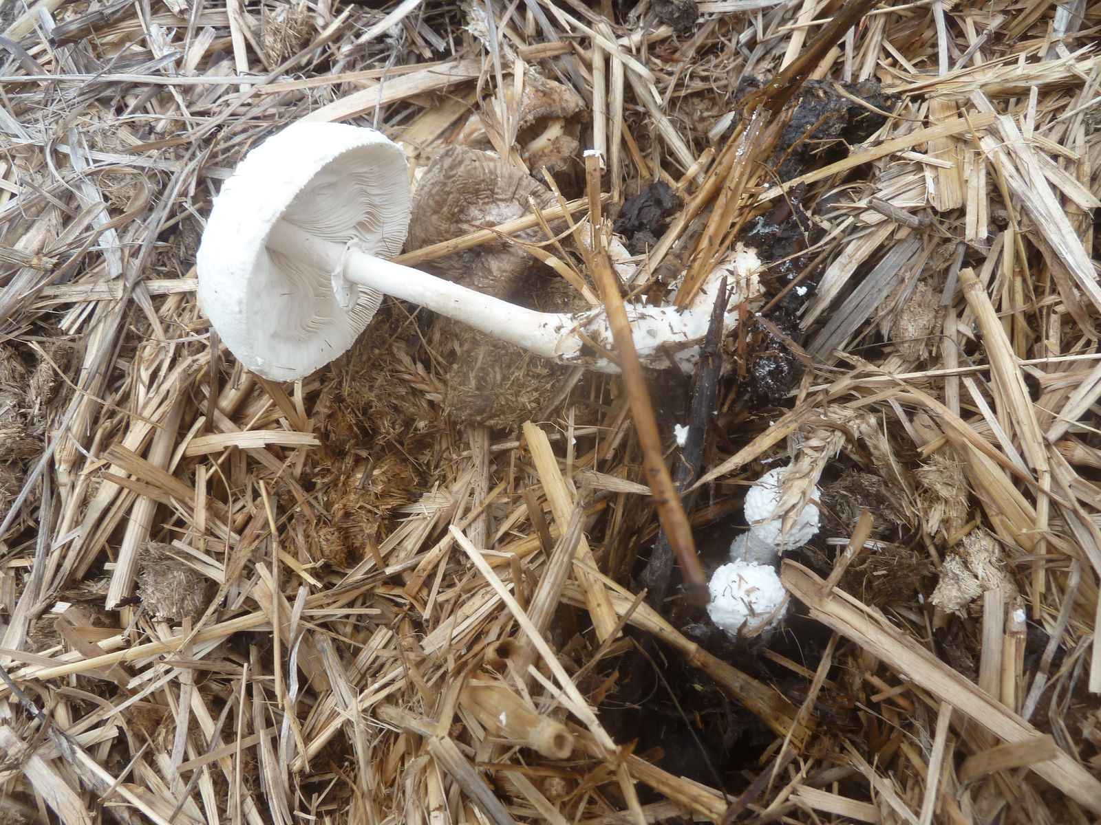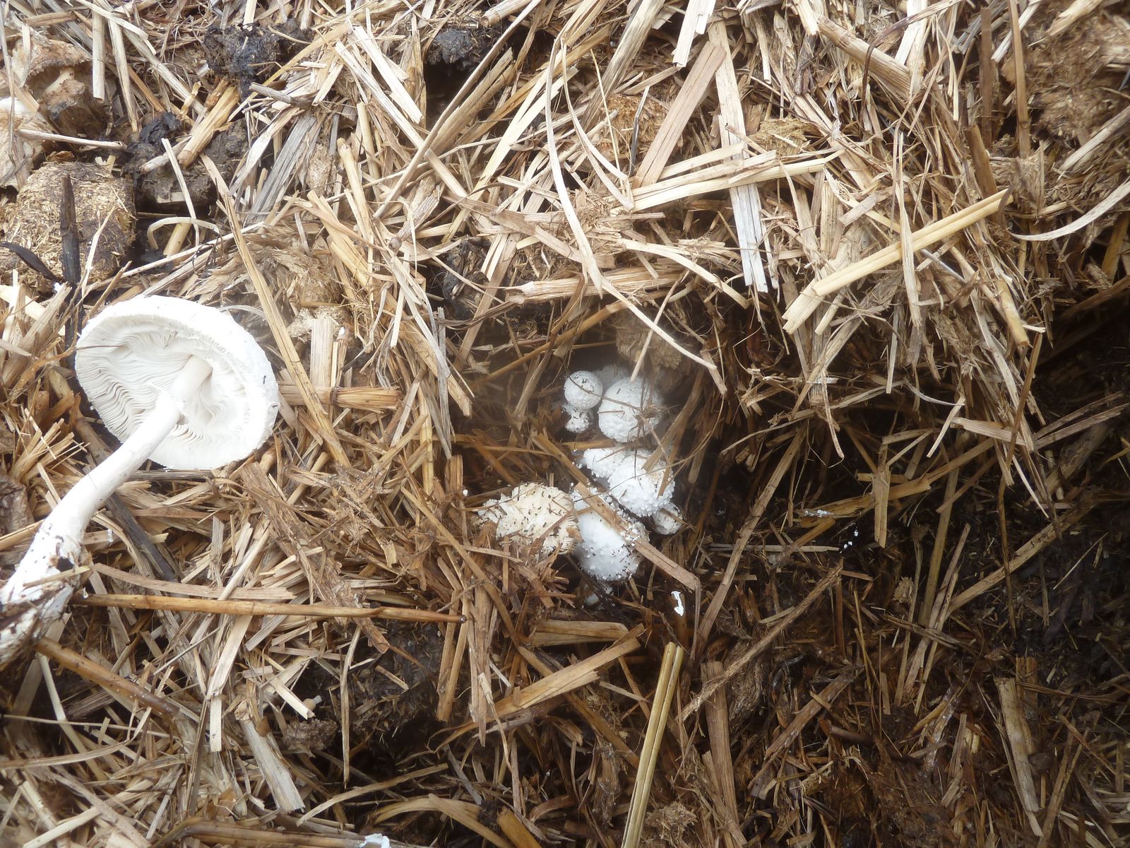 Die Regenpause am Nachmittag habe ich für einen Waldspaziergang genutzt. Während es innerhalb des Waldes keine wirklich interessanten Funde gab, konnte ich auf dem Rückweg auf einem Haufen mit Stallmist weiße Pilze entdecken. Ein Abgleich hat mich zu Leucocoprinus cretaceus geführt, passt das?