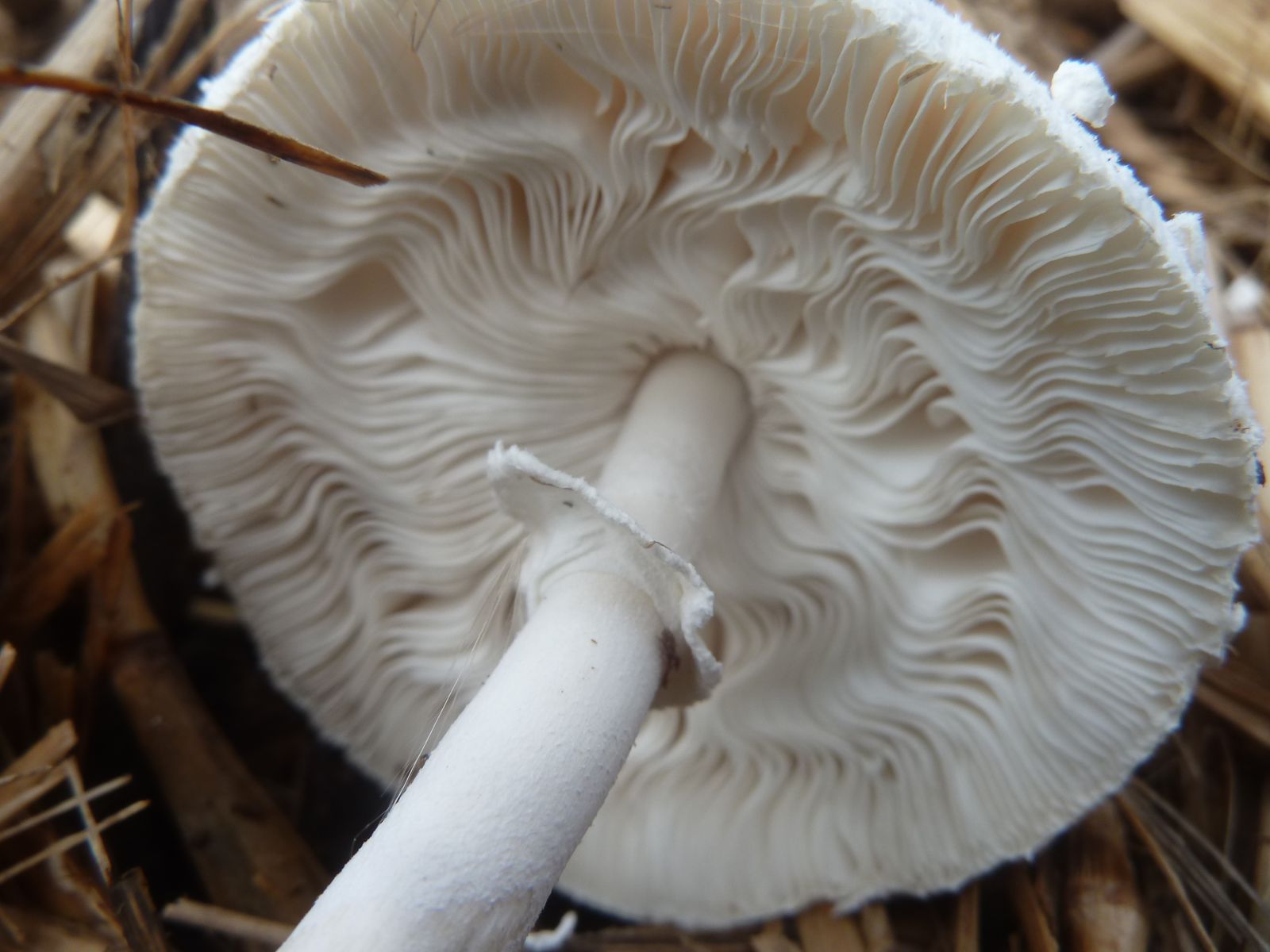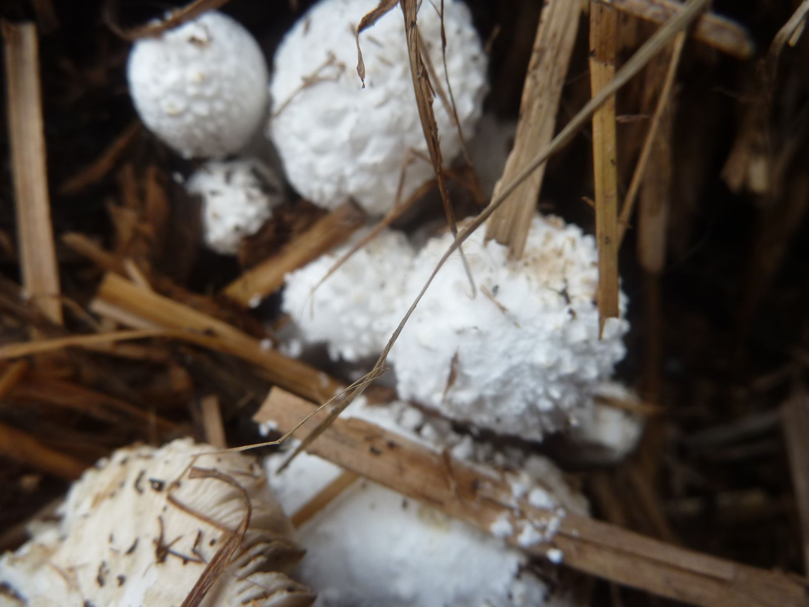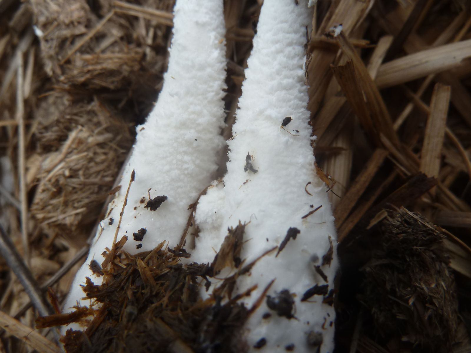 Die Regenpause am Nachmittag habe ich für einen Waldspaziergang genutzt. Während es innerhalb des Waldes keine wirklich interessanten Funde gab, konnte ich auf dem Rückweg auf einem Haufen mit Stallmist weiße Pilze entdecken. Ein Abgleich hat mich zu Leucocoprinus cretaceus geführt, passt das?