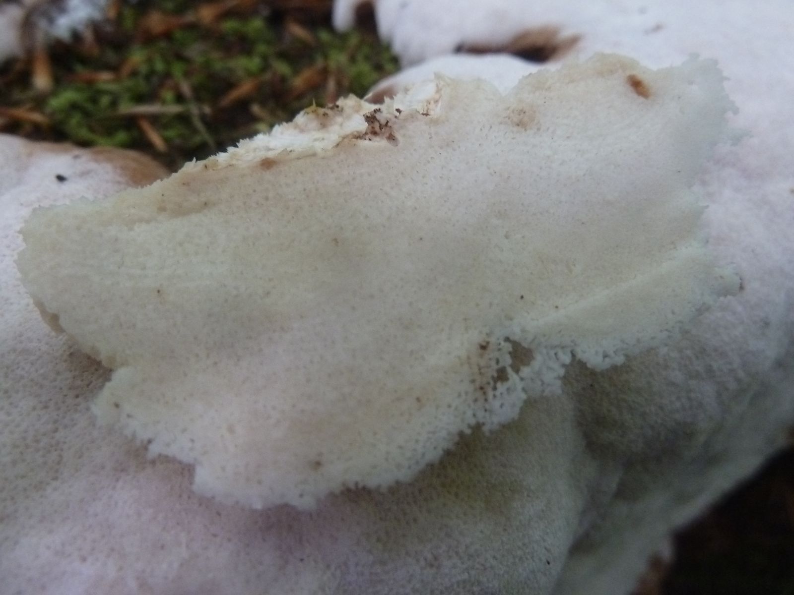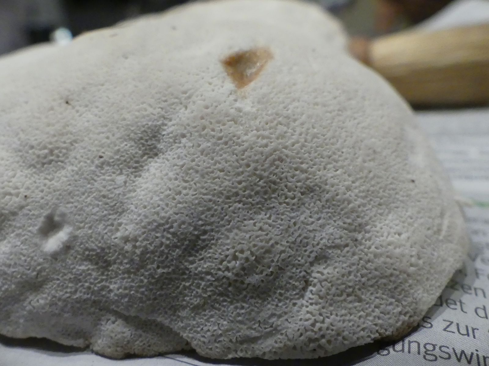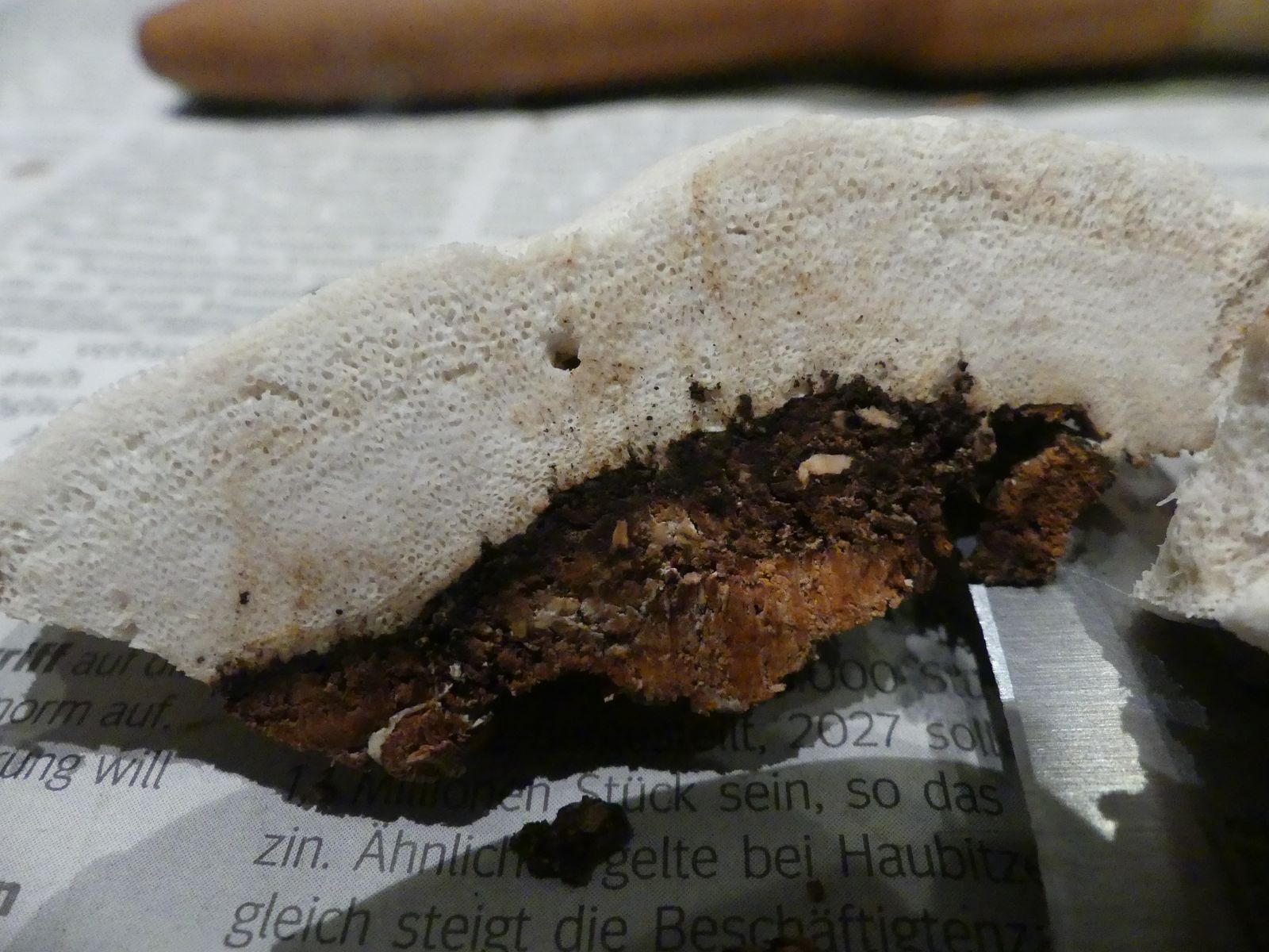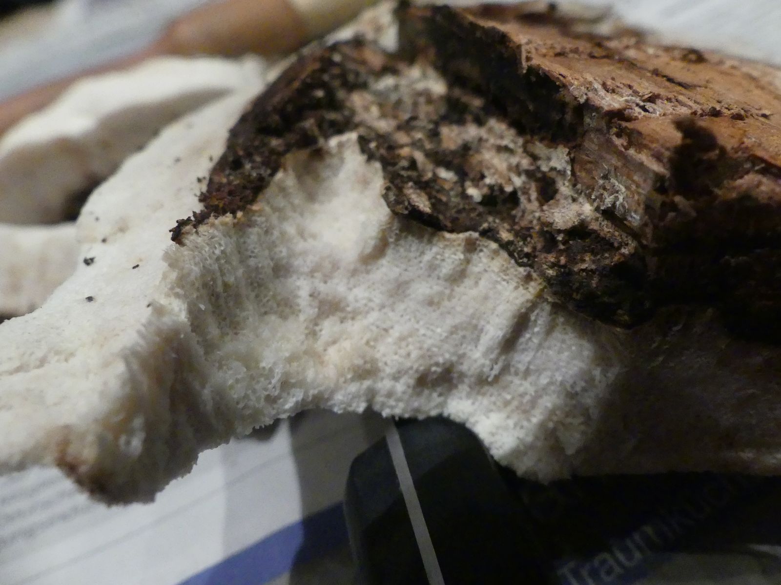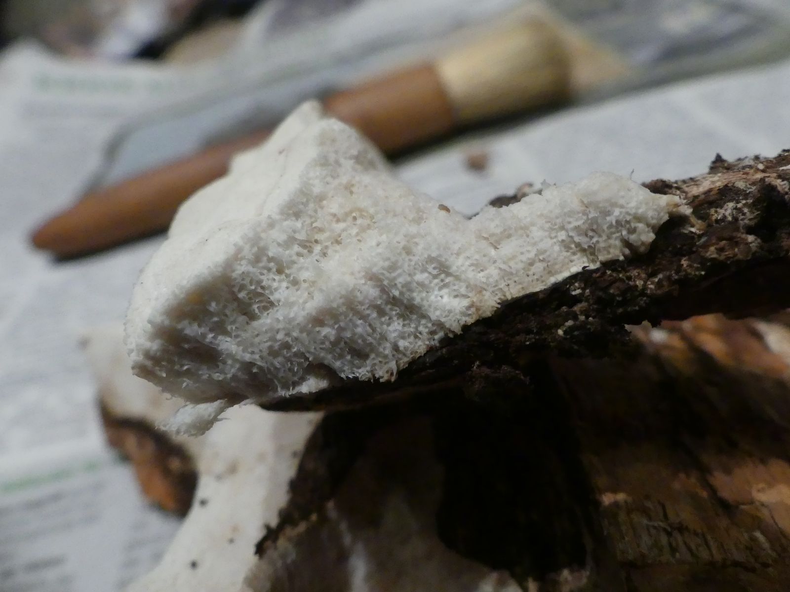 Einen interessanten Fund habe ich doch noch zu vermelden, diesen "weißen Riesen" auf einem Kiefern-(oder Lärche?)stumpf. Relativ weich, lässt sich gut mit dem Messer schneiden. Kein besonderer Geruch feststellbar, Geschmack etwas unangenehm, leicht säuerlich, aber nicht wirklich bitter. Bitterer Saftporling sollte demnach ausscheiden, weil der "stark bitter" schmecken soll.