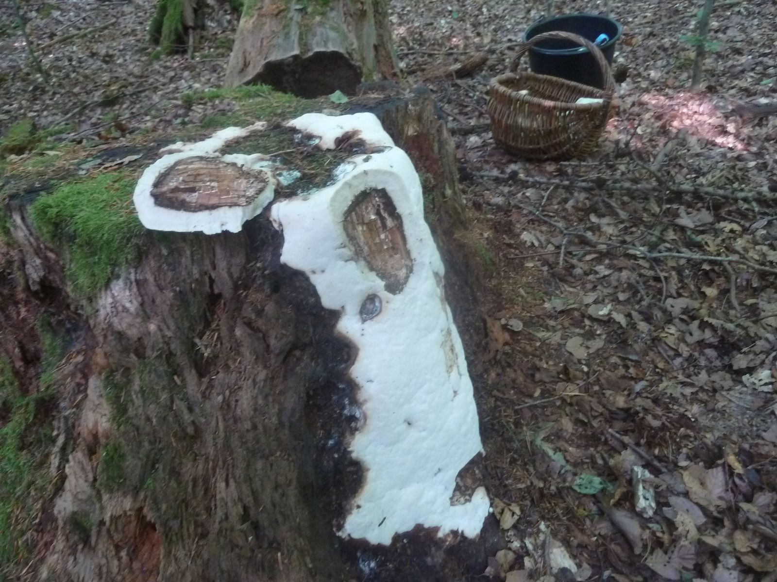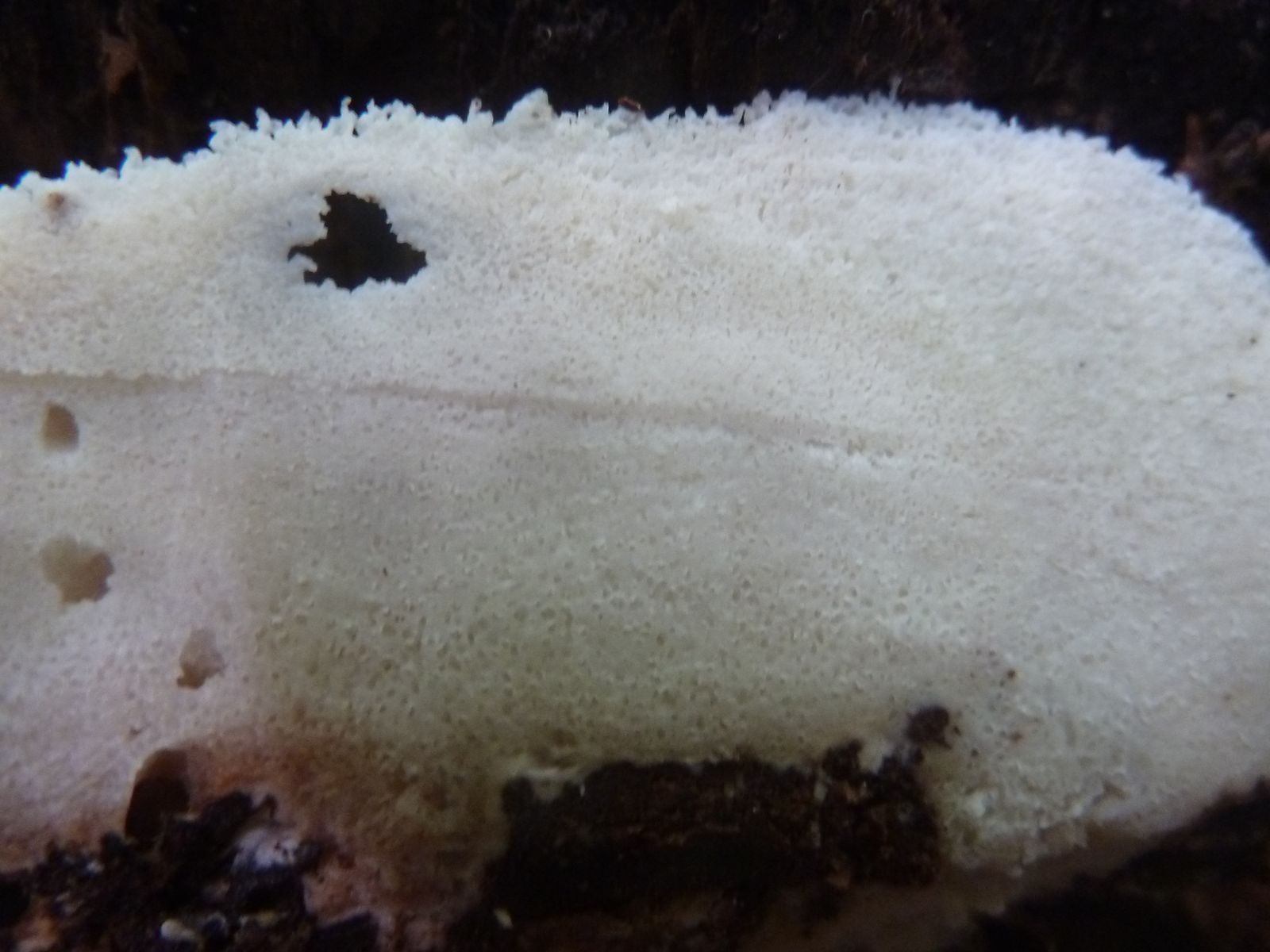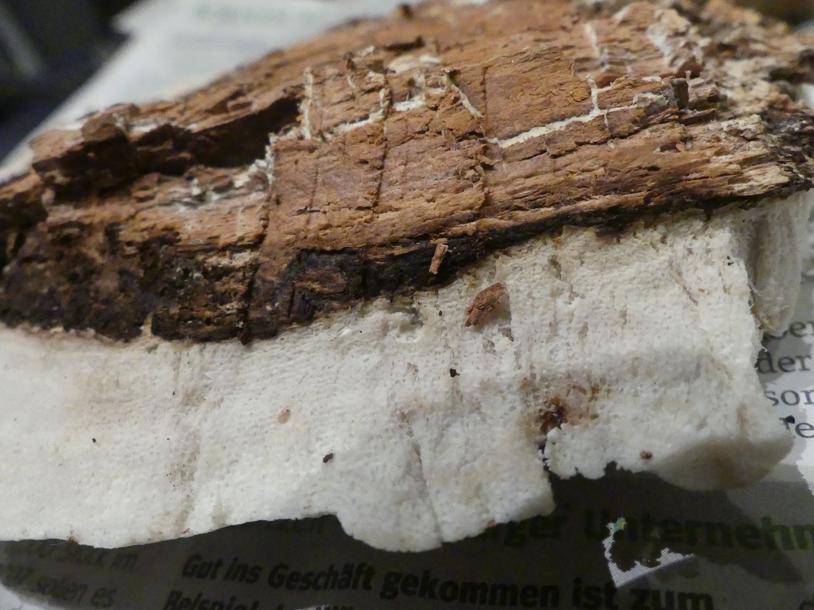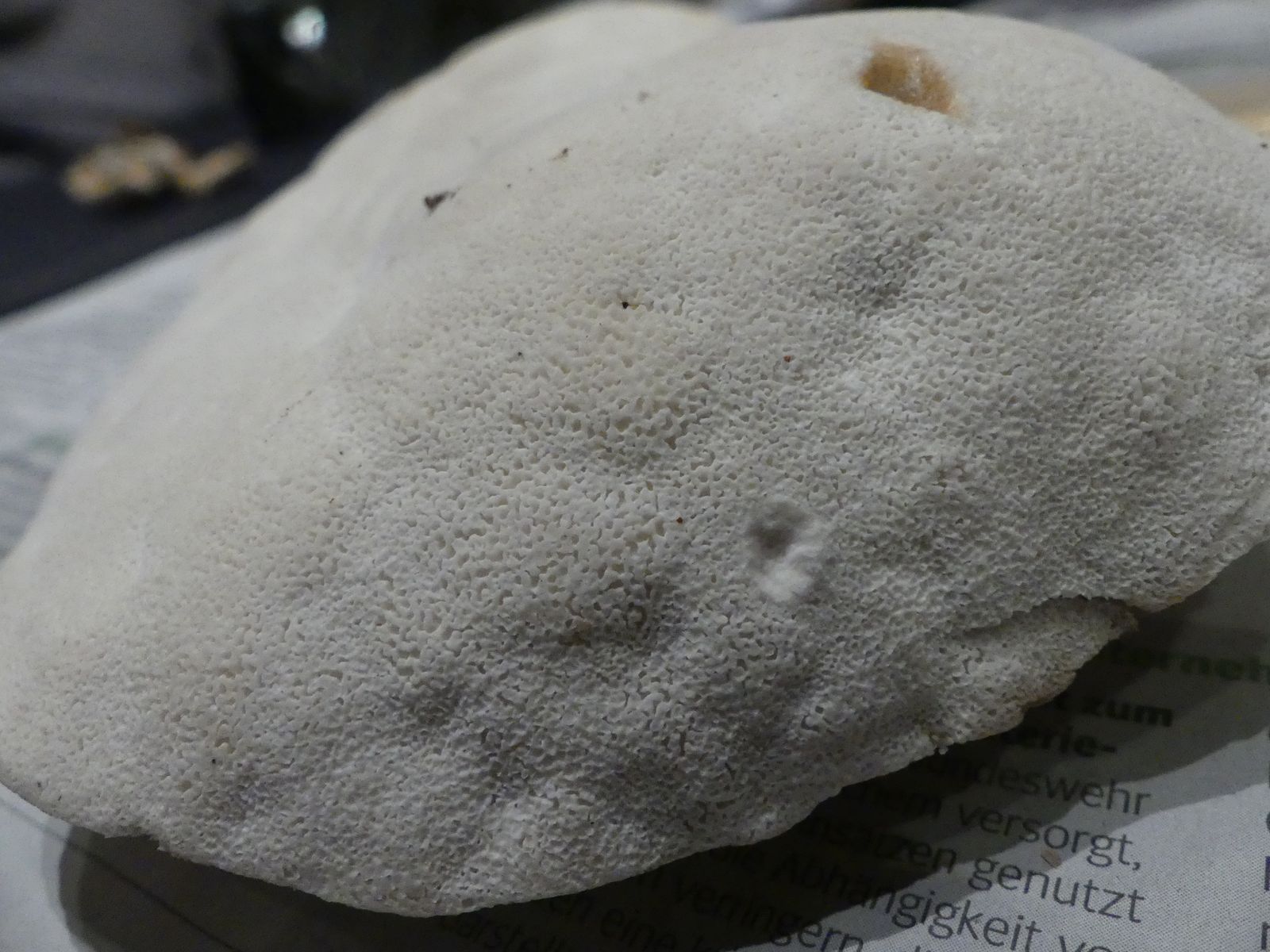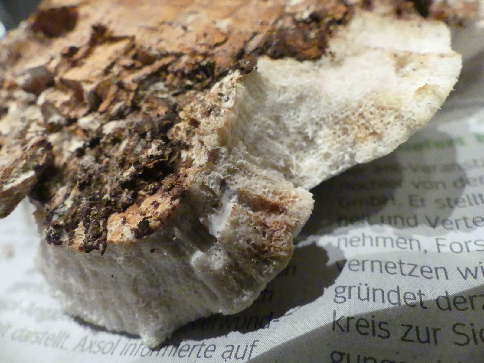 Einen interessanten Fund habe ich doch noch zu vermelden, diesen "weißen Riesen" auf einem Kiefern-(oder Lärche?)stumpf. Relativ weich, lässt sich gut mit dem Messer schneiden. Kein besonderer Geruch feststellbar, Geschmack etwas unangenehm, leicht säuerlich, aber nicht wirklich bitter. Bitterer Saftporling sollte demnach ausscheiden, weil der "stark bitter" schmecken soll.