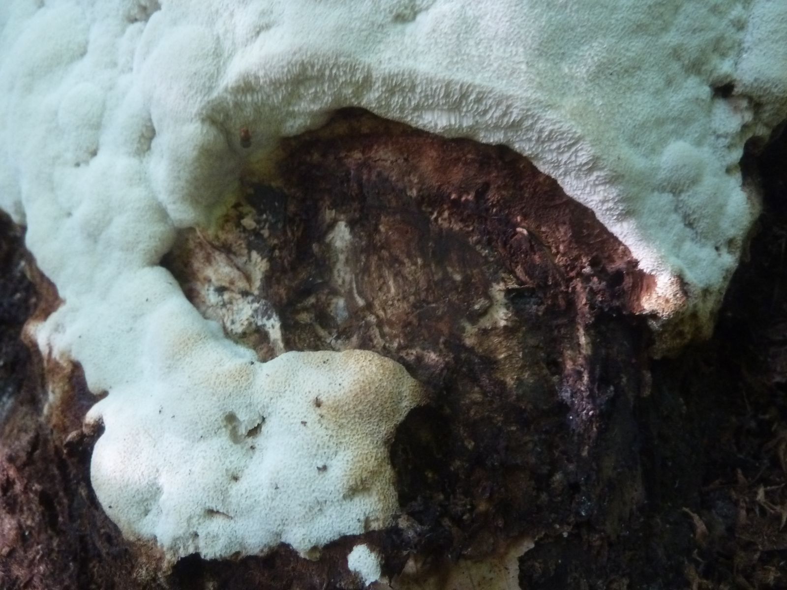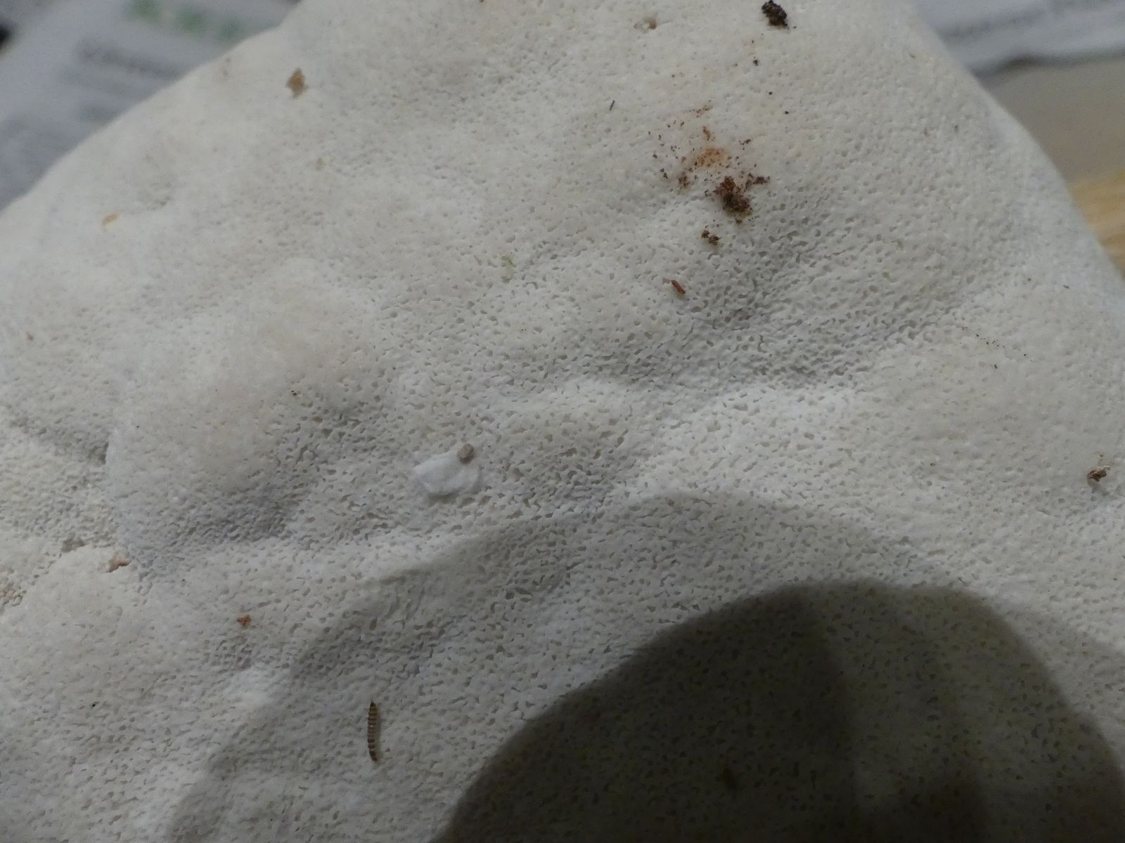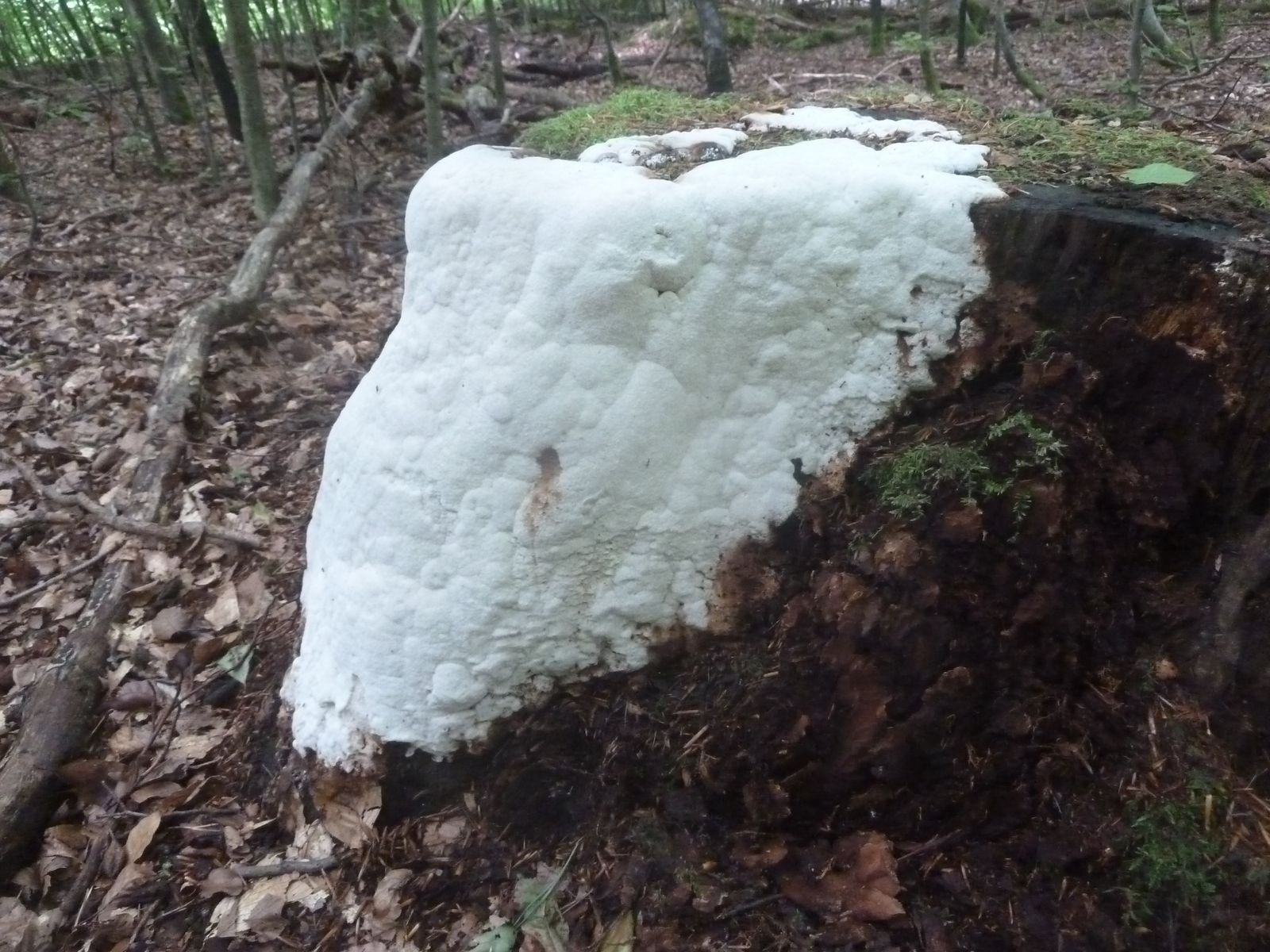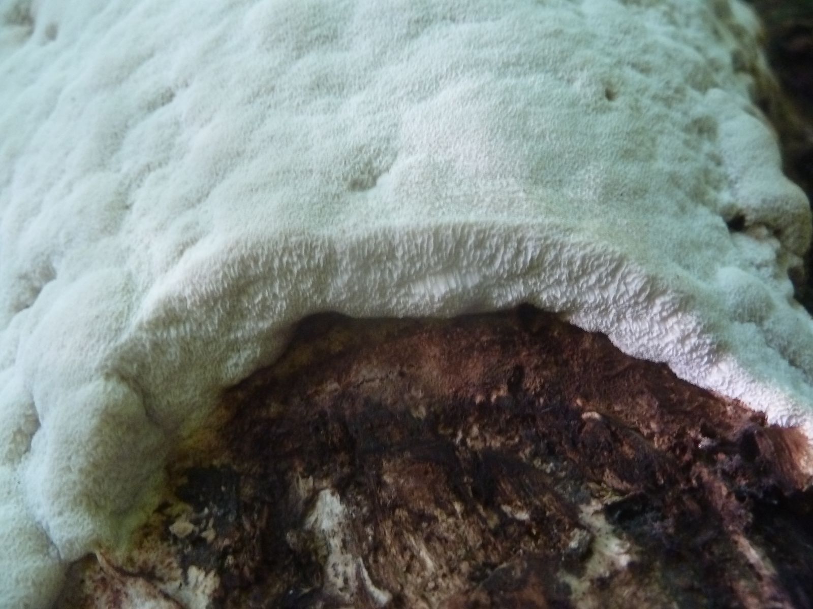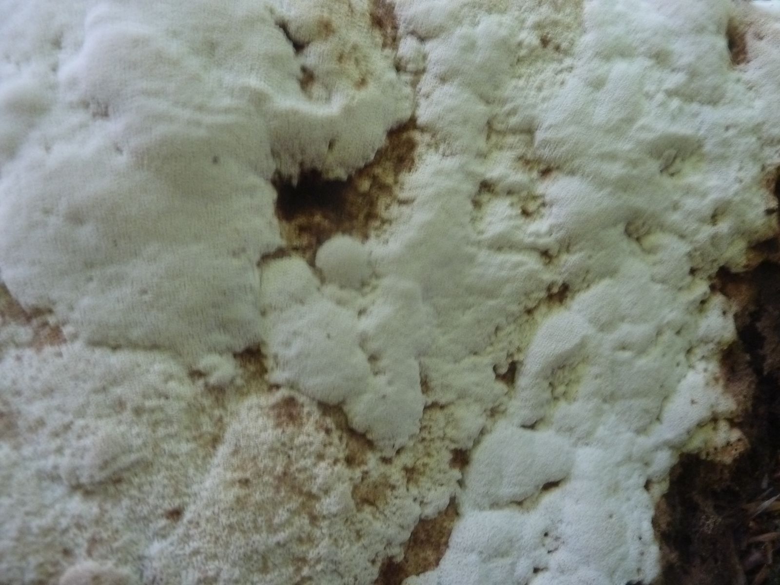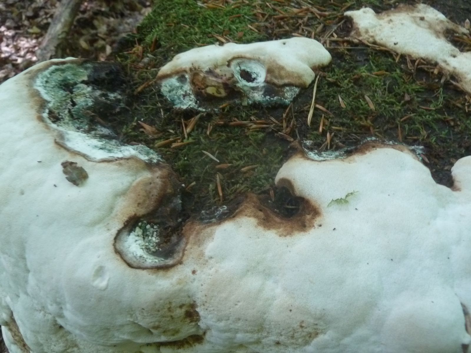 Einen interessanten Fund habe ich doch noch zu vermelden, diesen "weißen Riesen" auf einem Kiefern-(oder Lärche?)stumpf. Relativ weich, lässt sich gut mit dem Messer schneiden. Kein besonderer Geruch feststellbar, Geschmack etwas unangenehm, leicht säuerlich, aber nicht wirklich bitter. Bitterer Saftporling sollte demnach ausscheiden, weil der "stark bitter" schmecken soll.