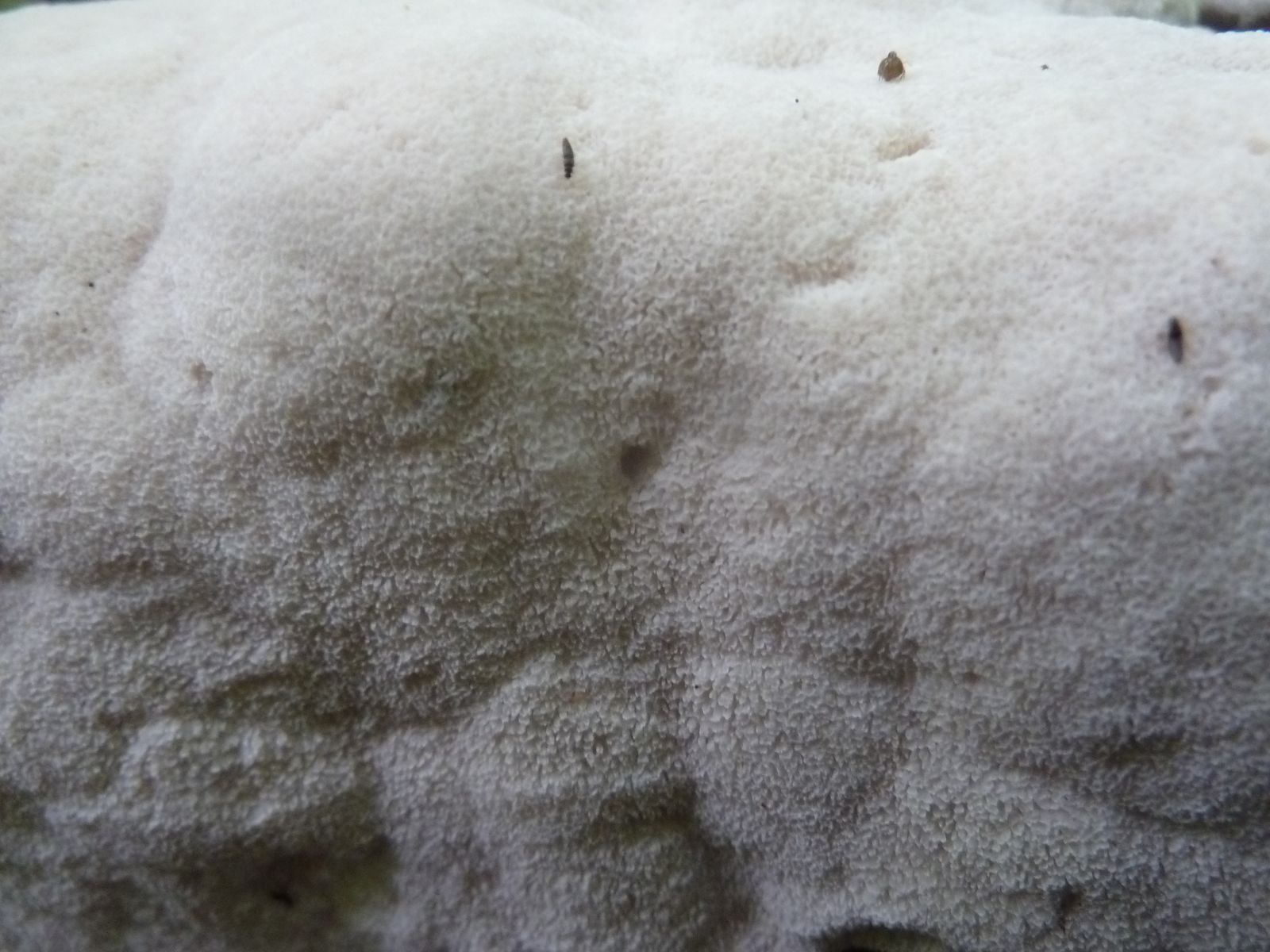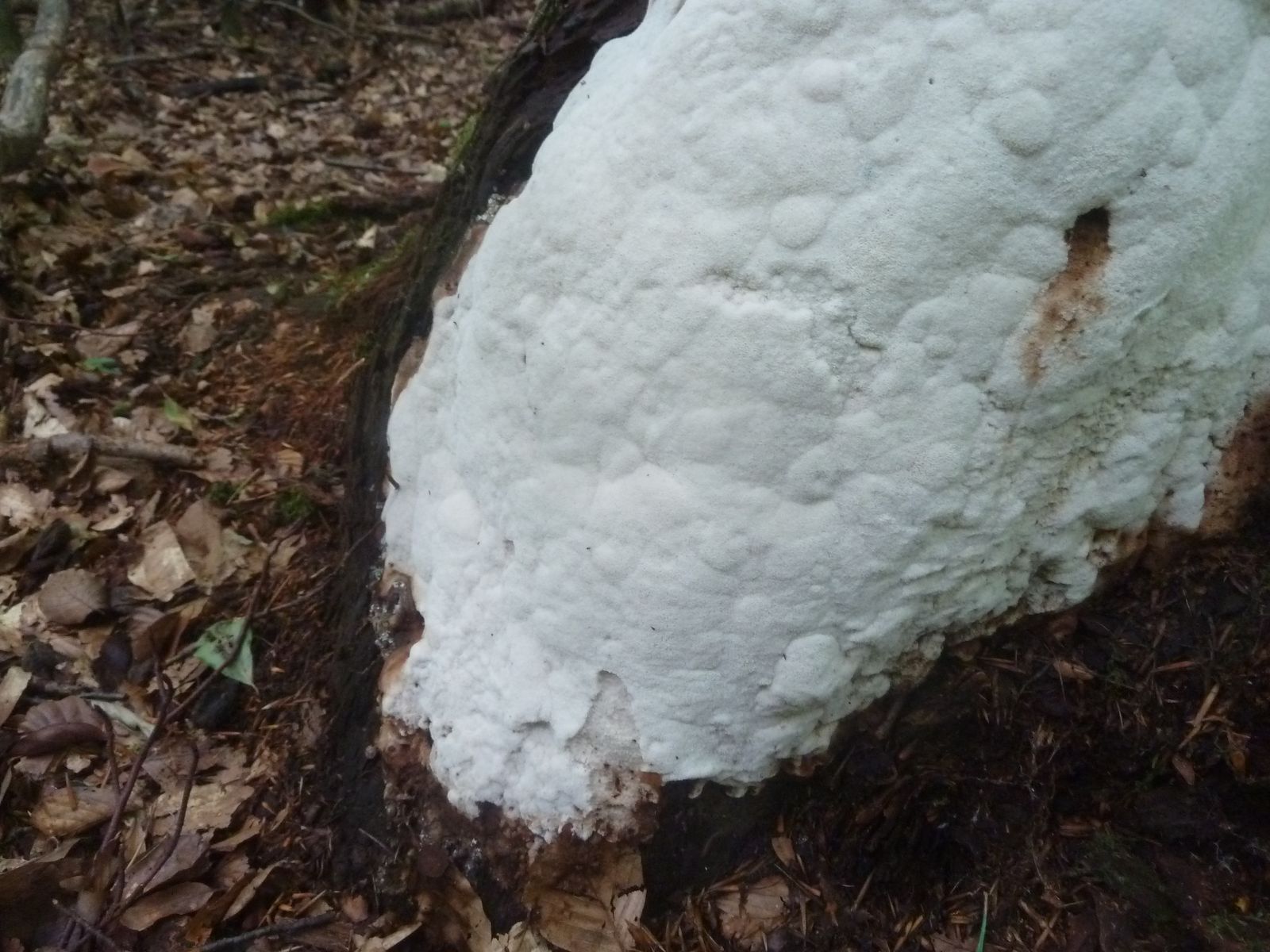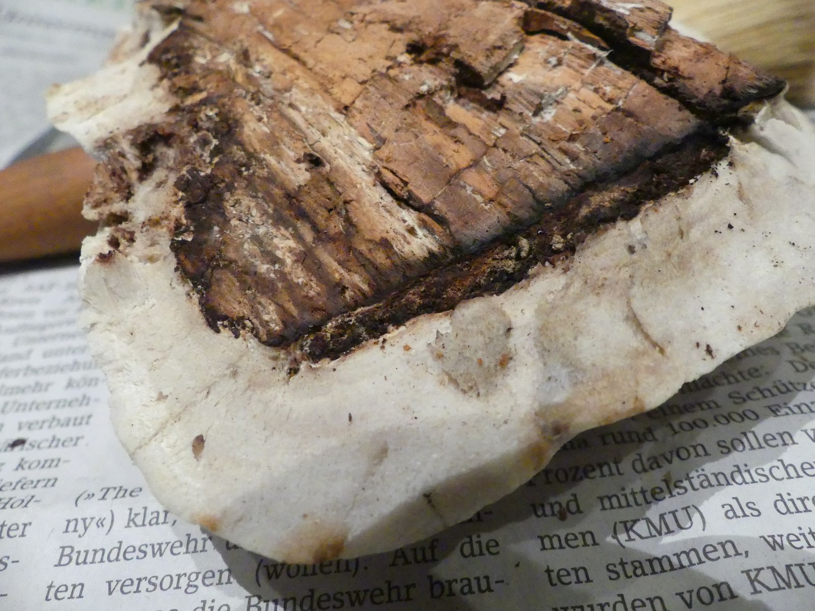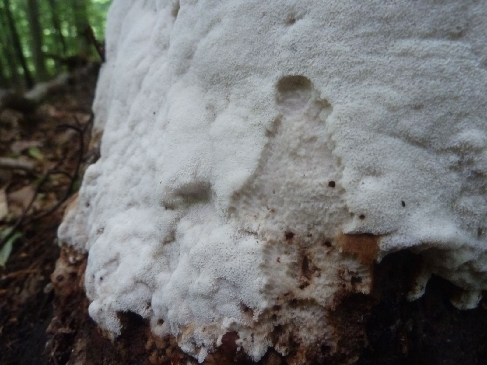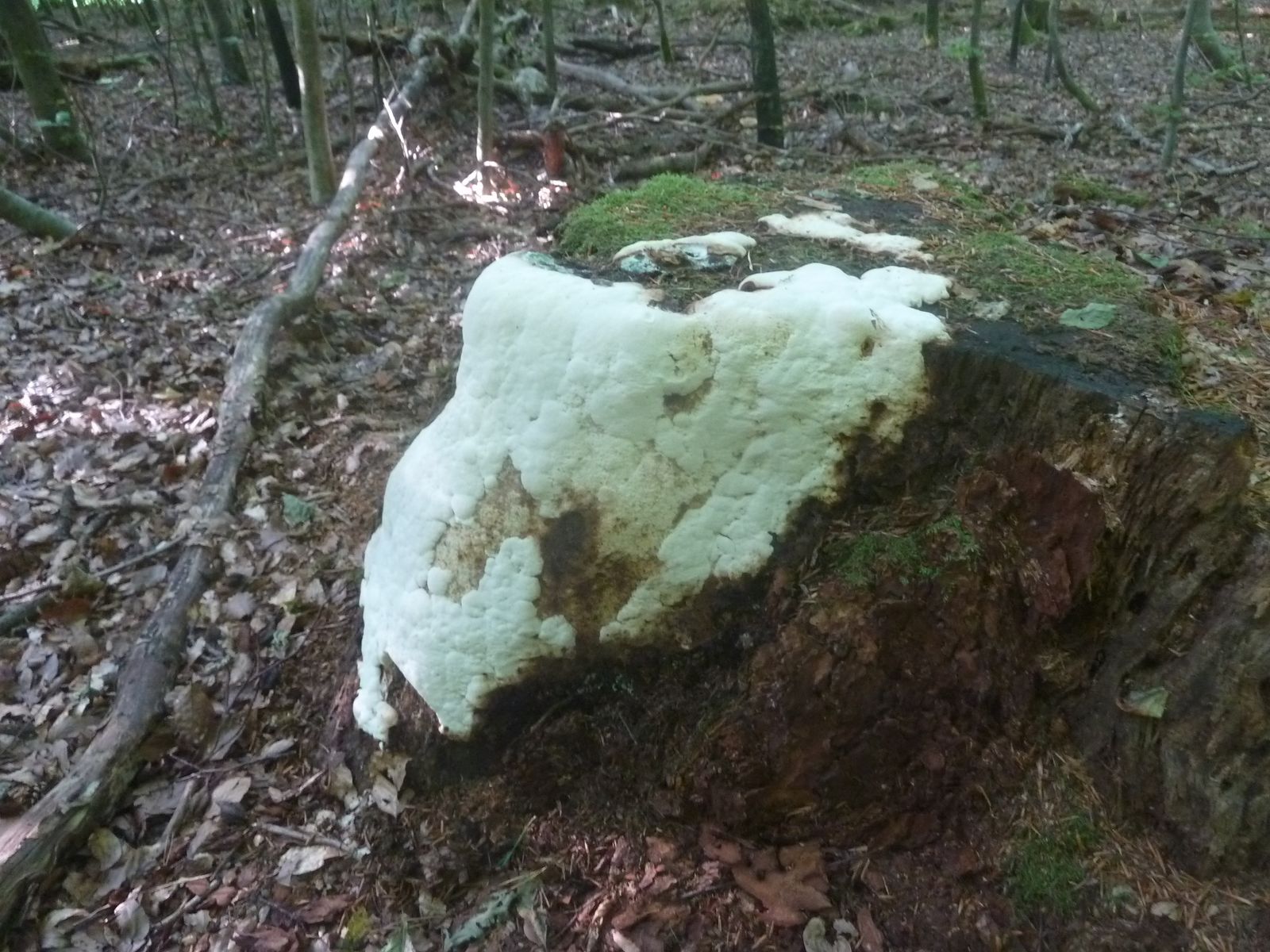 Einen interessanten Fund habe ich doch noch zu vermelden, diesen "weißen Riesen" auf einem Kiefern-(oder Lärche?)stumpf. Relativ weich, lässt sich gut mit dem Messer schneiden. Kein besonderer Geruch feststellbar, Geschmack etwas unangenehm, leicht säuerlich, aber nicht wirklich bitter. Bitterer Saftporling sollte demnach ausscheiden, weil der "stark bitter" schmecken soll.