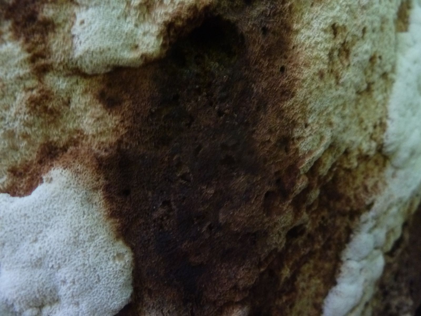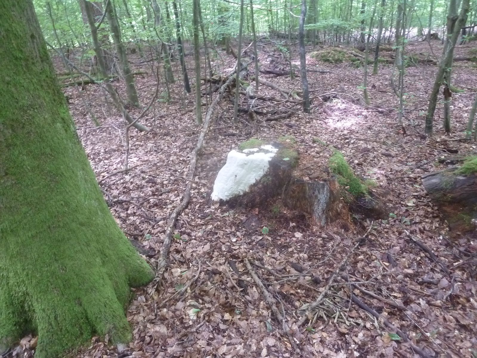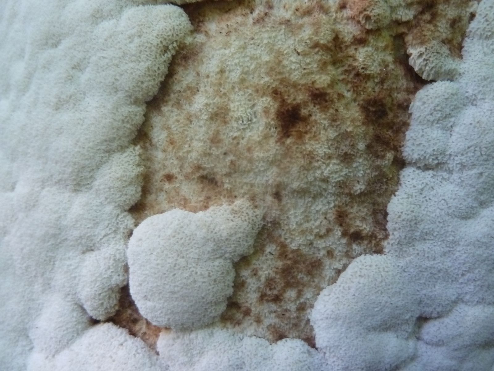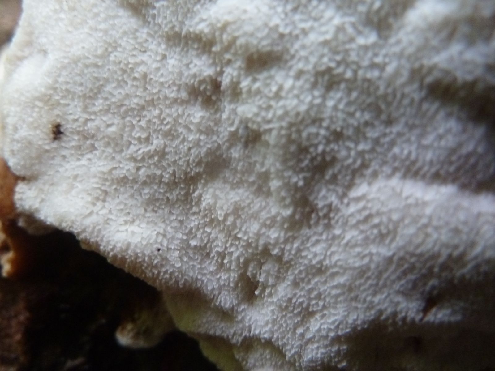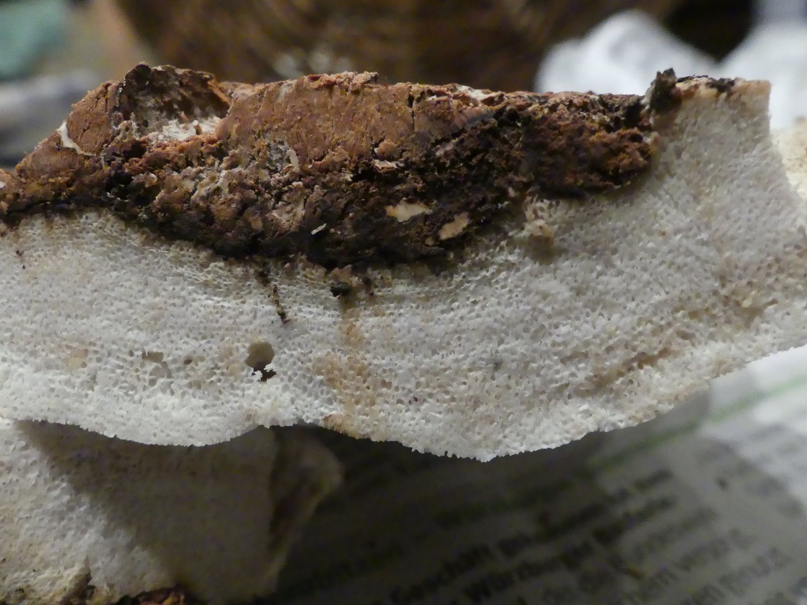 Einen interessanten Fund habe ich doch noch zu vermelden, diesen "weißen Riesen" auf einem Kiefern-(oder Lärche?)stumpf. Relativ weich, lässt sich gut mit dem Messer schneiden. Kein besonderer Geruch feststellbar, Geschmack etwas unangenehm, leicht säuerlich, aber nicht wirklich bitter. Bitterer Saftporling sollte demnach ausscheiden, weil der "stark bitter" schmecken soll.