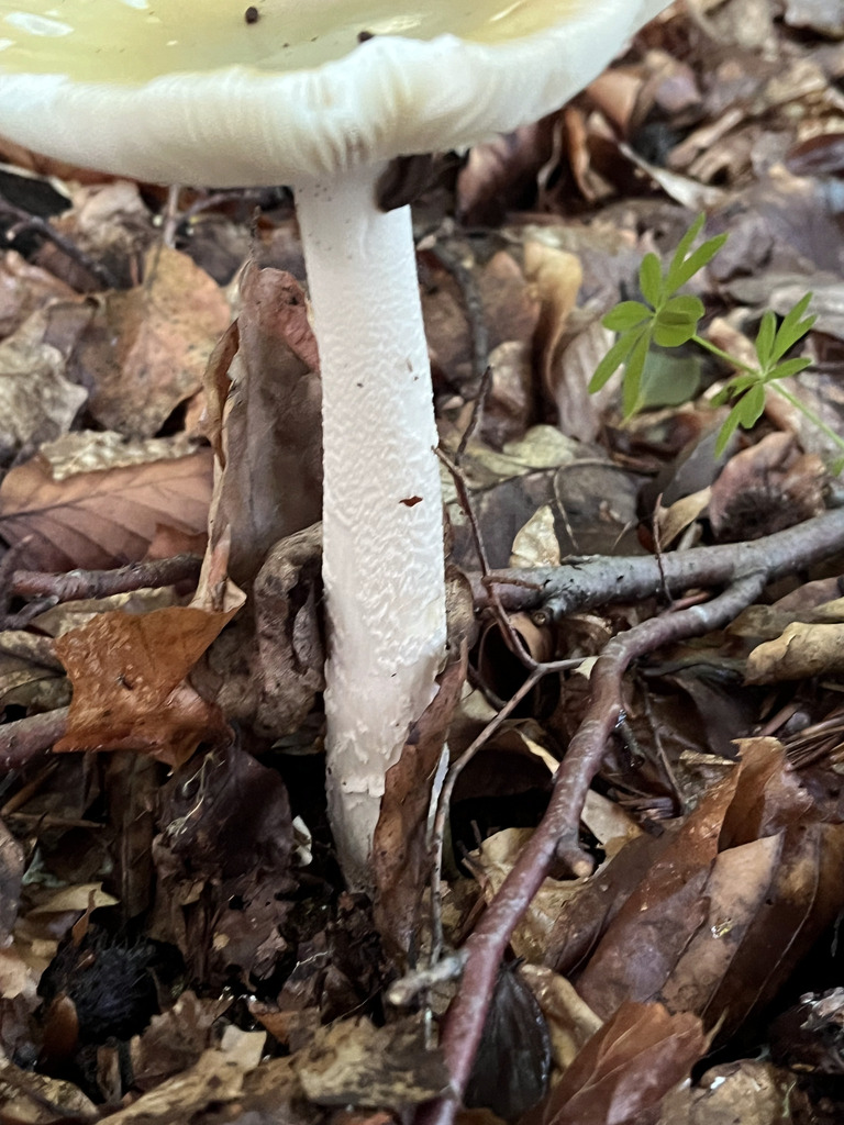 • Was spricht denn gegen Amanita phalloides? Der Standort wäre typisch, die Hutfarbe und der rauhe, genattert wirkende Stiel passen ebenfalls gut. Der Ring von A. phalloides ist recht lappig und kann auch schnell mal durch Fraß etc. verloren gehen. Wie war der Geruch?