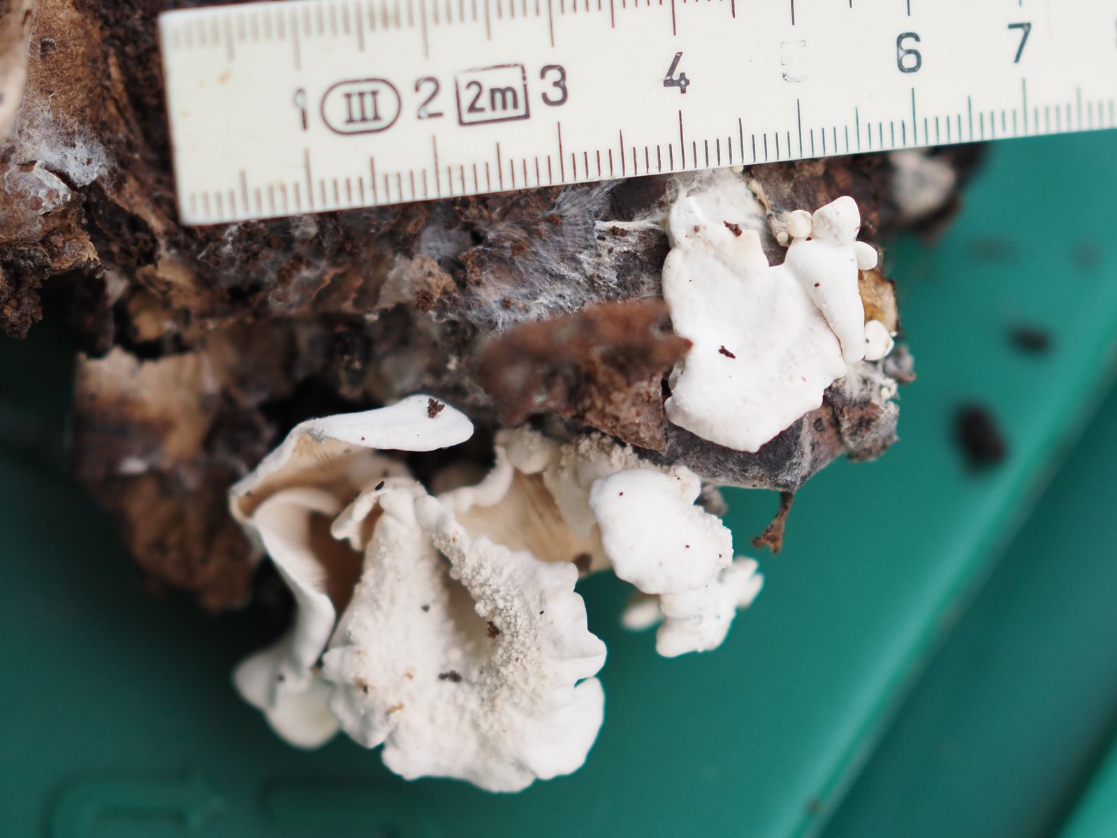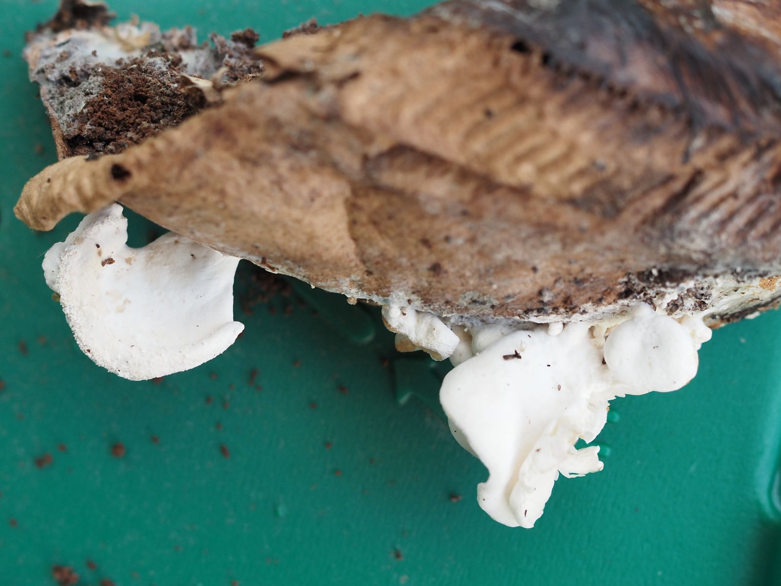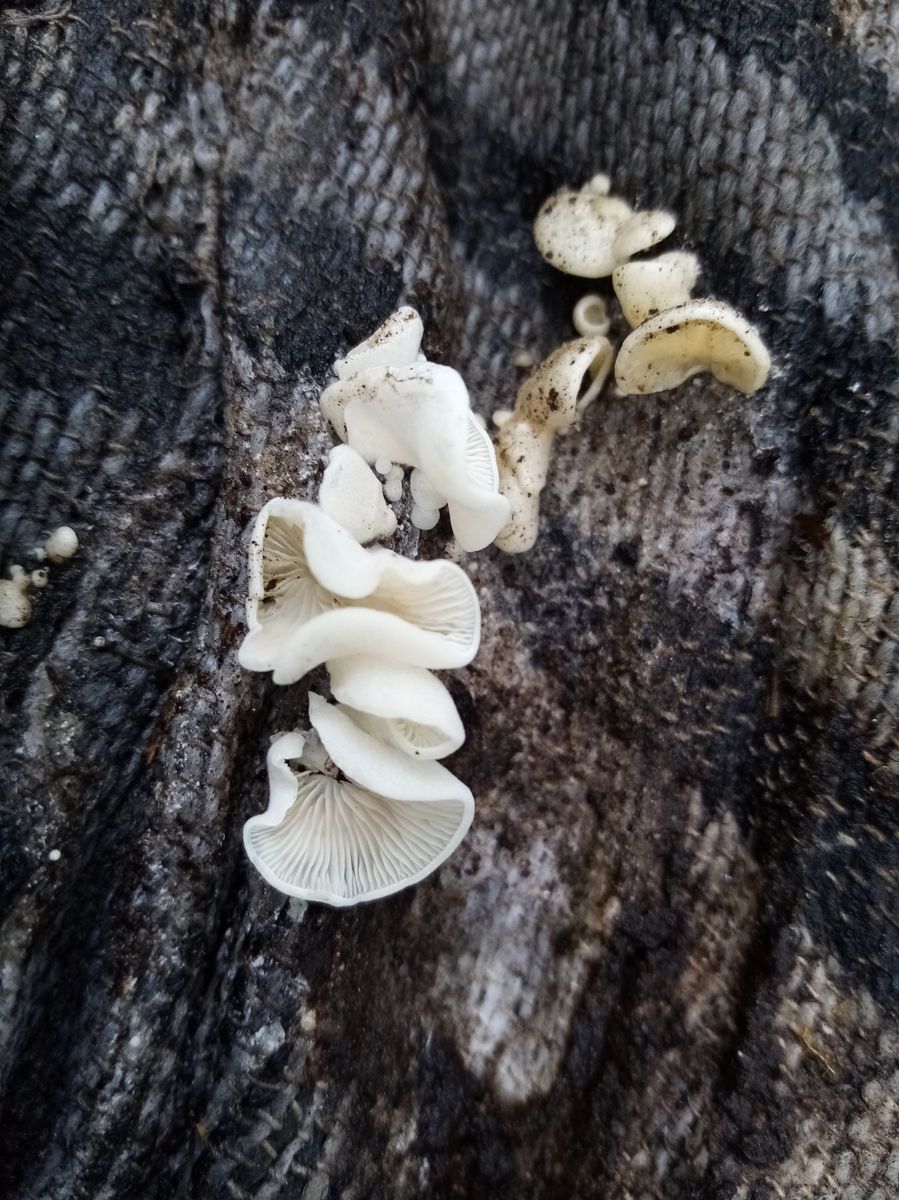 Den Ohrförmigen Seitling möchte ich fast ausschließen, da im Norden fehlend und an Nadelholz wachsend. Und ich vermute mal, dass die braunen Bio-Filtertüten nicht aus Nadelholz hergestellt werden.