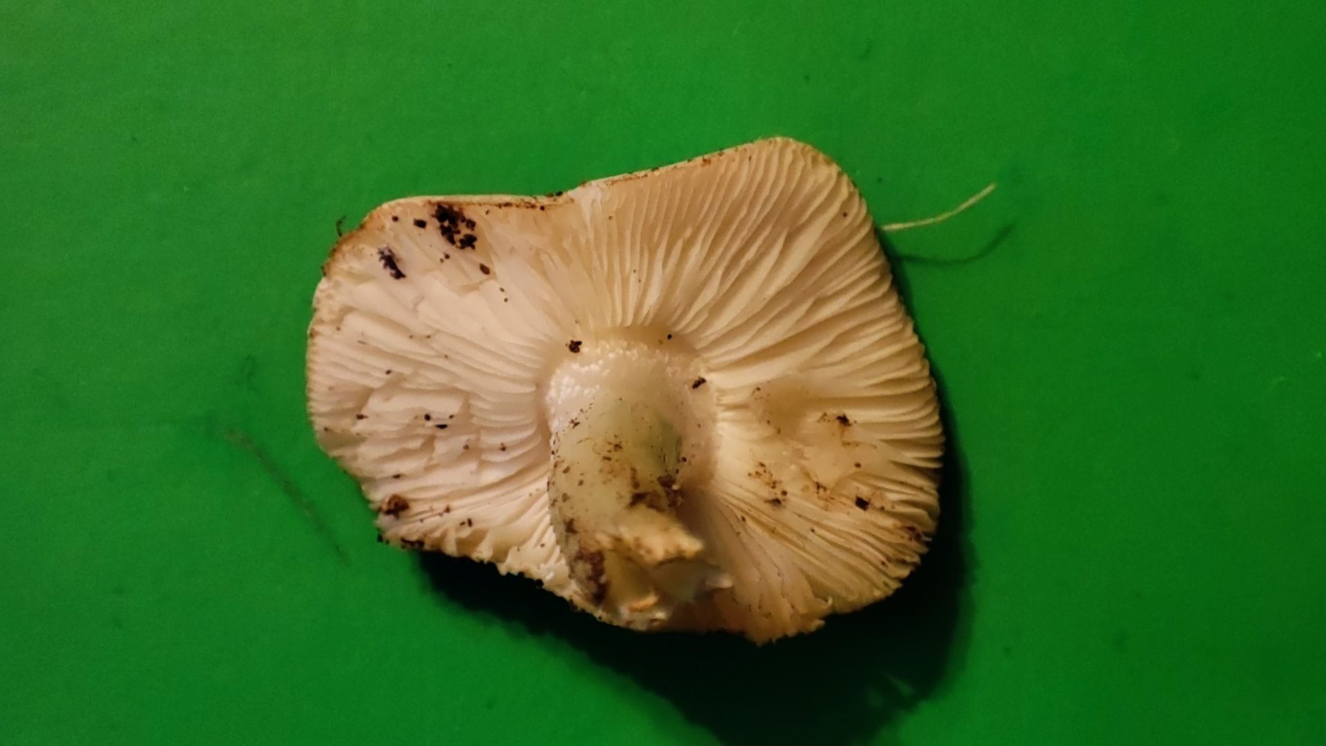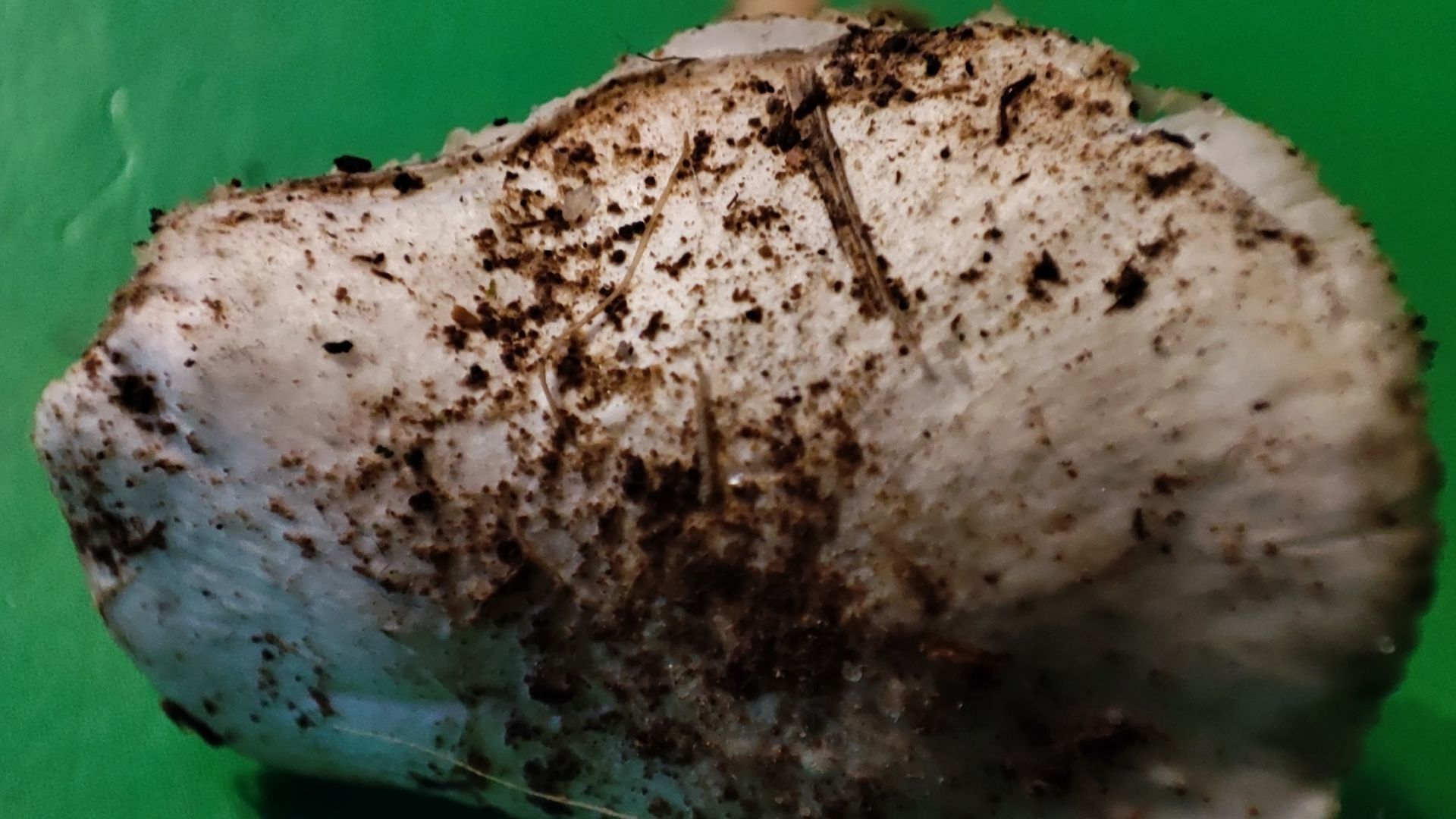 Hutoberfläche: Leicht radialfaserig, fast glatt, es klebte Erde daran