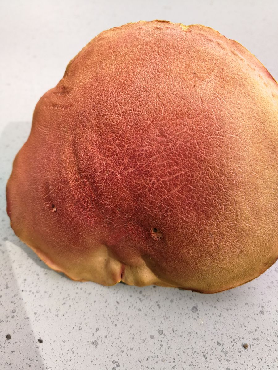 Der Hut ist wunderbar filzig, ziemlich rötlich und er beginnt, feldrig aufzureißen. Der Rand ist aber nicht so hell, wie ich es von den Rotfußröhrlingen kenne.
