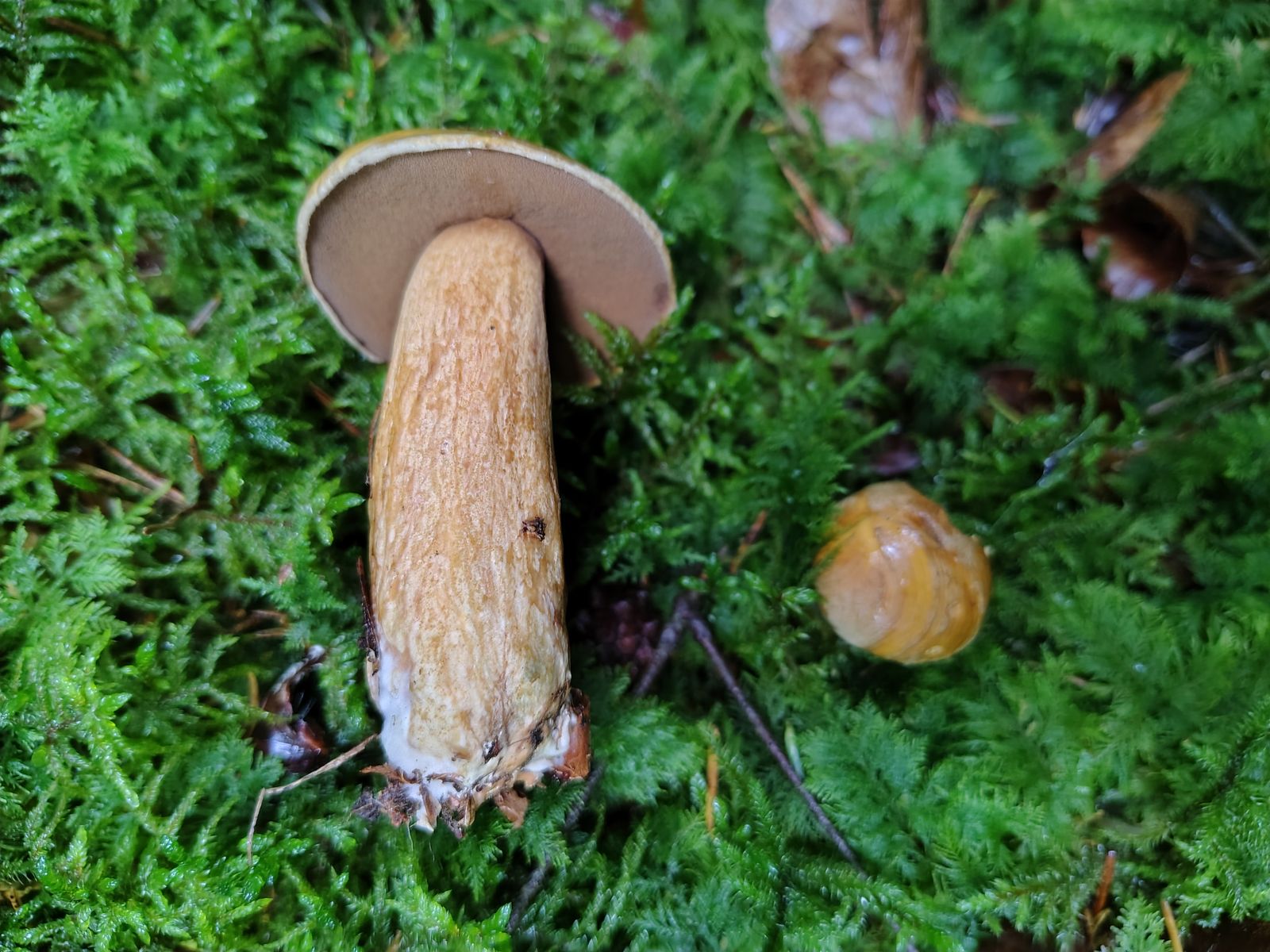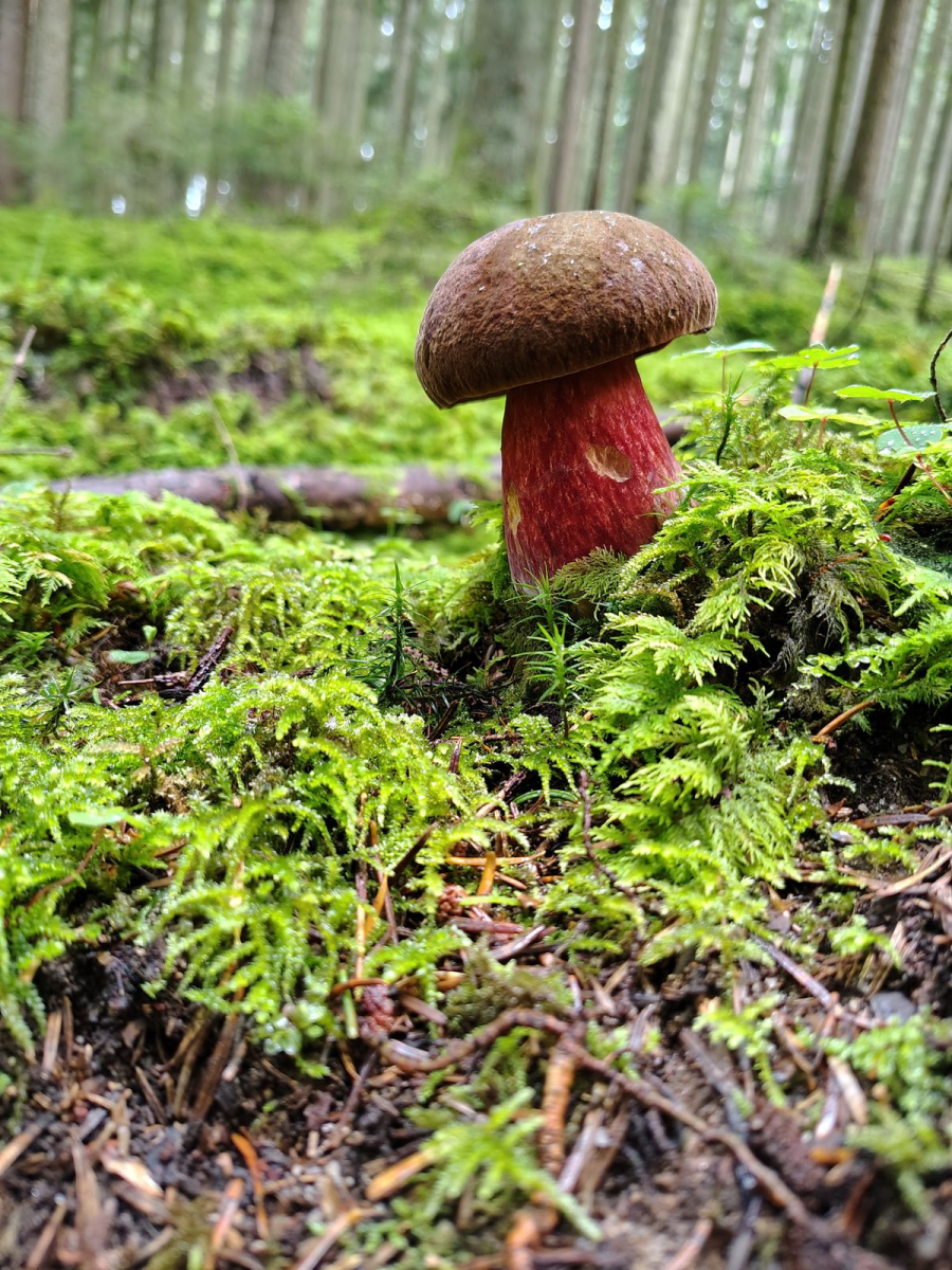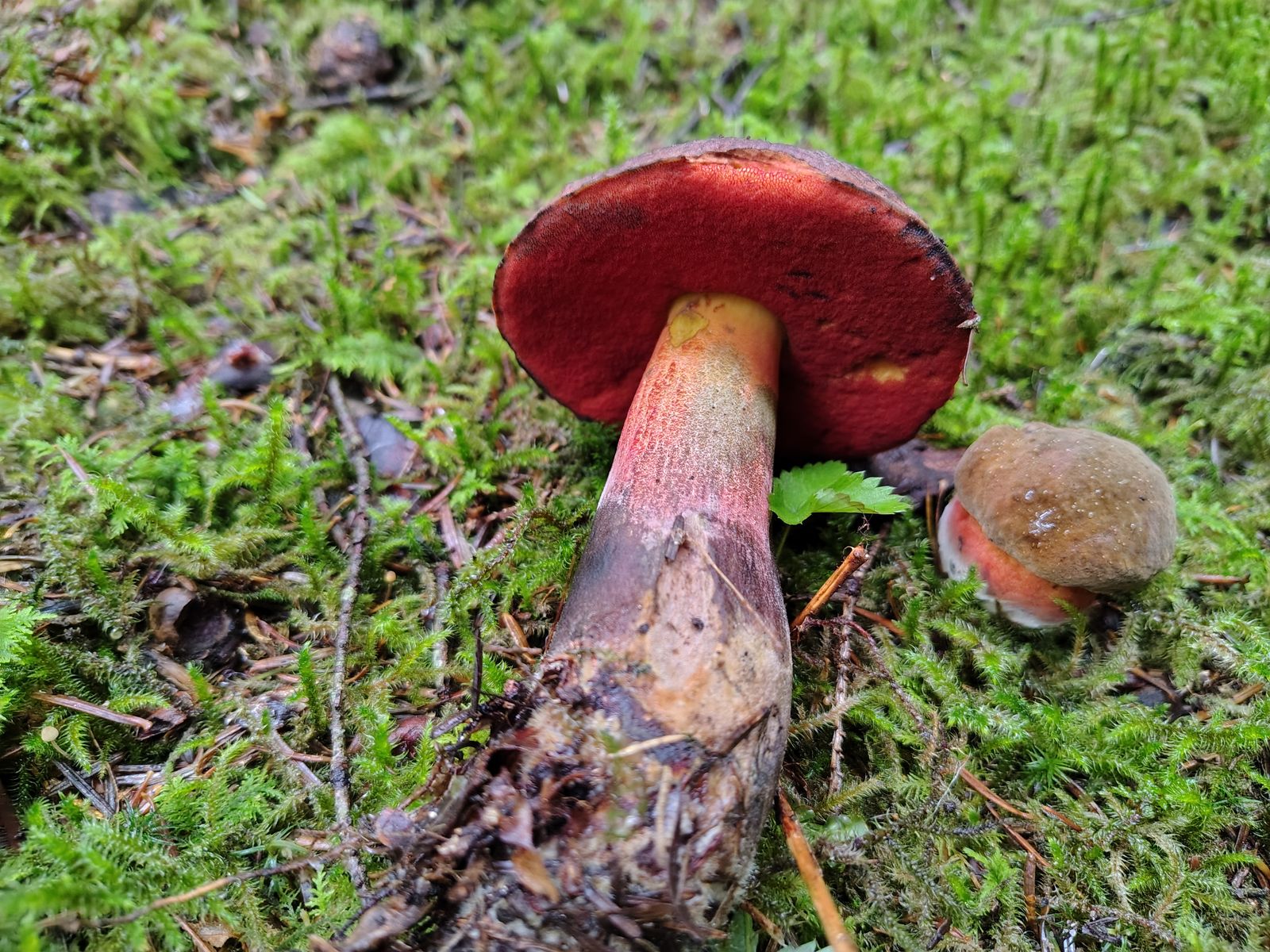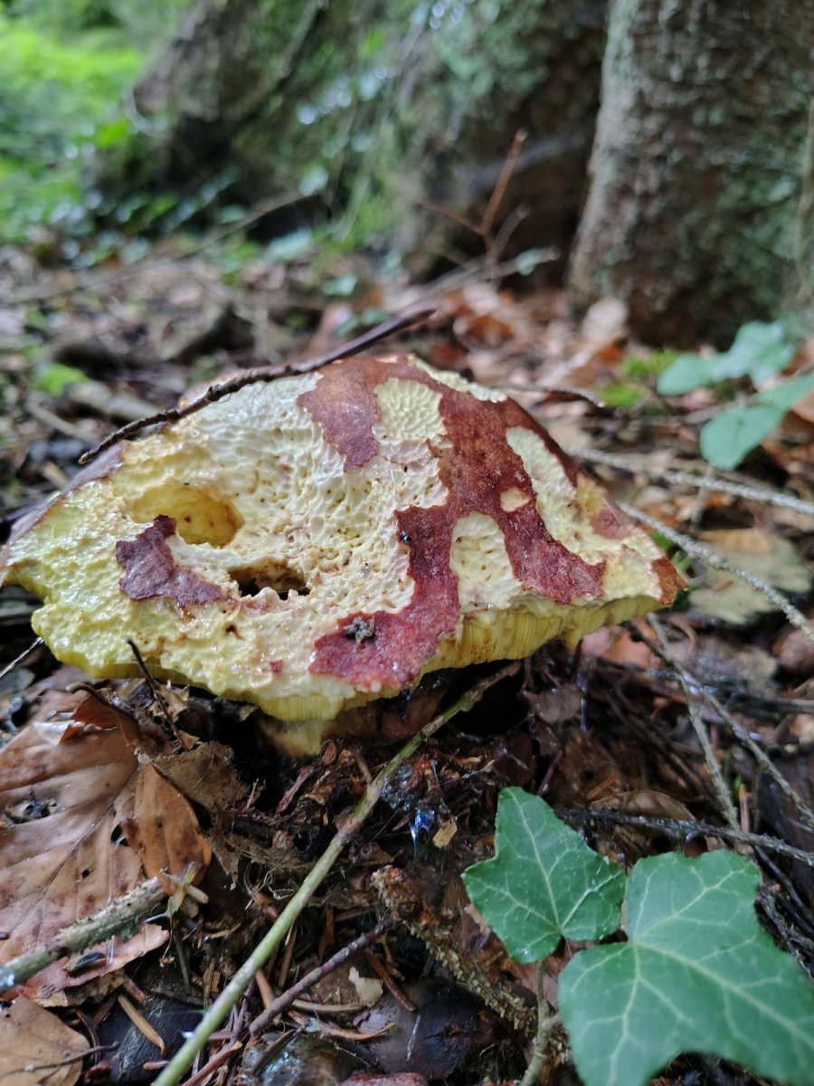 3. Achtung Bild mit Rotstich: Wieder Butyriboletus appendiculatus, im meilenweit nadeldominierten Wald in der Nähe einer kleinen Buche.