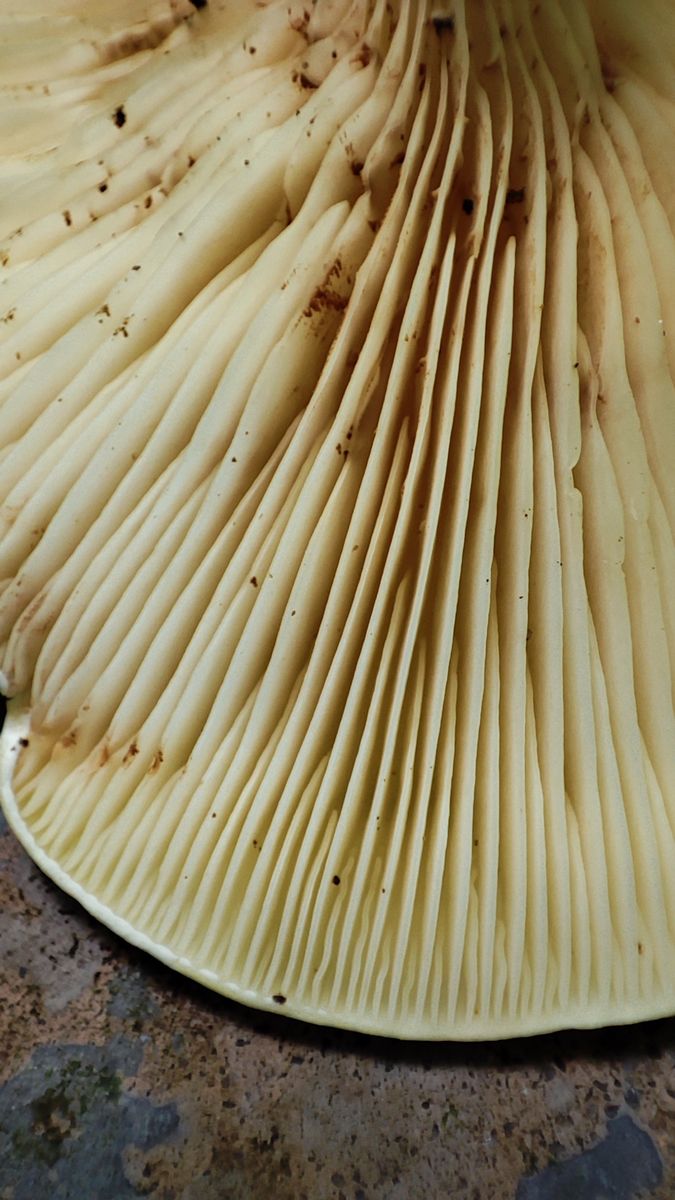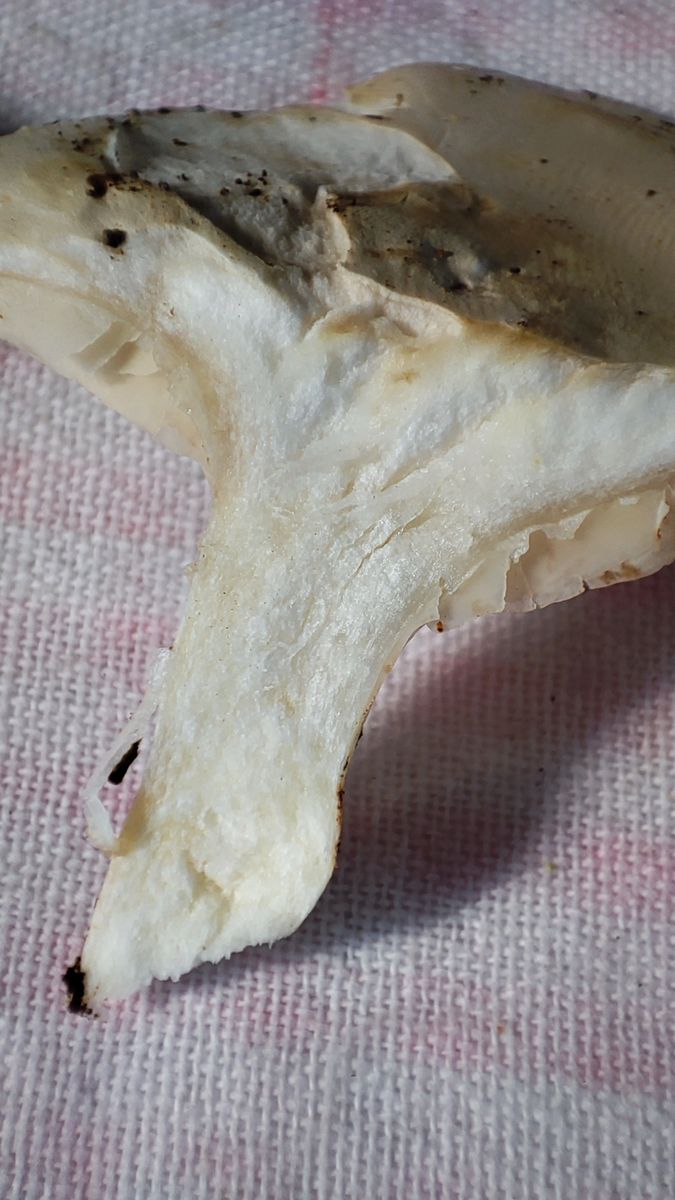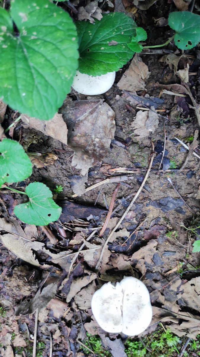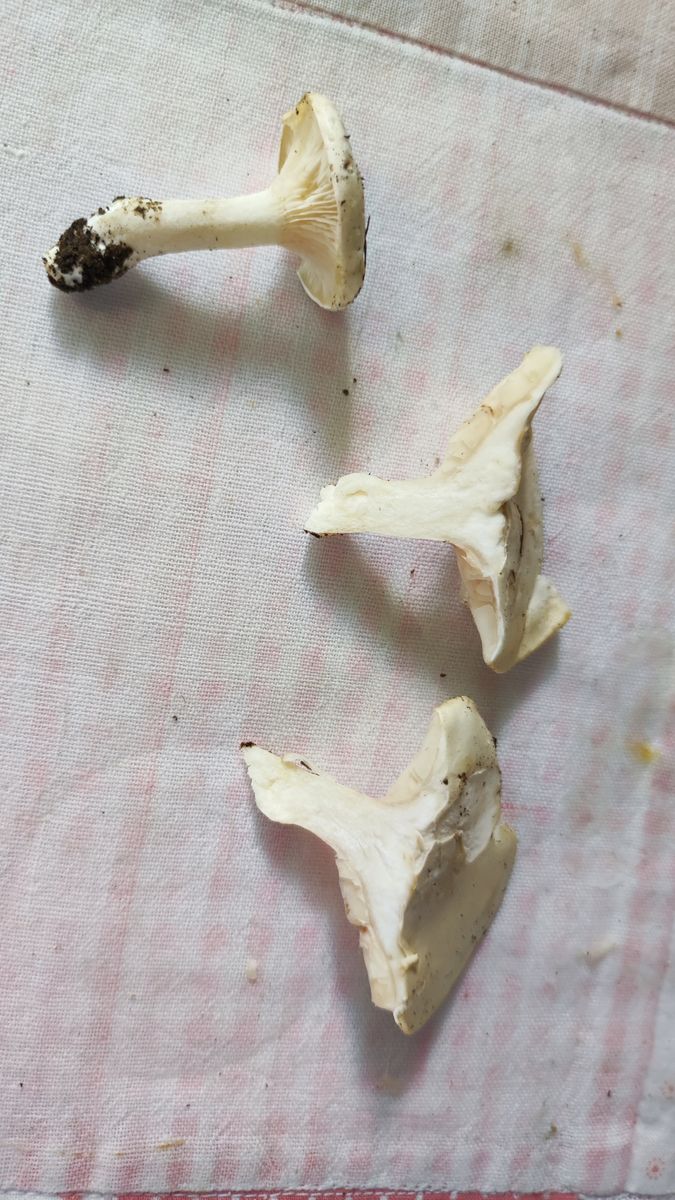 Dann leuchtete noch was WeiĂes aus Laubstreu und Efeu. KWP mit leicht trichterlingsähnlichem Habitus. Lamellen dicht, untermischt, herablaufend. Geruch fĂźr mich unidentifizierbar. Irgendwo zwischen pilzig, mehlig und kellerartig. Hutoberfläche weiĂ u einigermaĂen glatt, Stiele nur leicht strukturiert, Stielbasis etwas flockig bzw wattig. Rand bei jungem Exemplar eingerollt, altes Exemplar ausgebreitet bis wellig. GrĂśĂe: Hut Dm 2,5-5cm, Stiele 3-5cm, Stiele Dm 1-1,5cm.