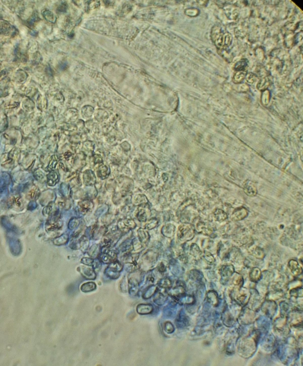 Die Sporen sind oval, Sportplatzförmig, 5-6*2-3 µm, farblos. Basidien 4-sporig. An den Lamellen sind vereinzelt blasige Objekte zu erkennen, evtl. Cheilozystiden. Die Hutschicht besteht im Auflicht oben aus unförmigen Objekten, eingeschrumpelte Kullern, die sich in Wasser als Kullern präsentieren, 12-35 µm im Durchmesser, bräunlich.