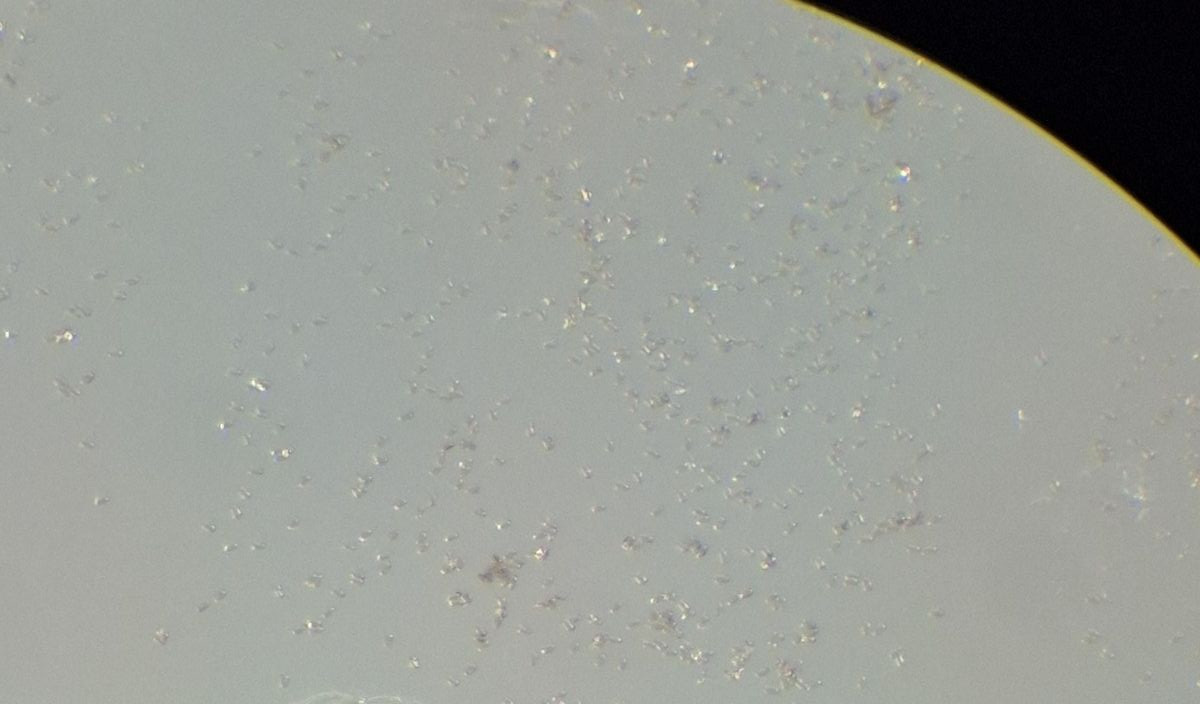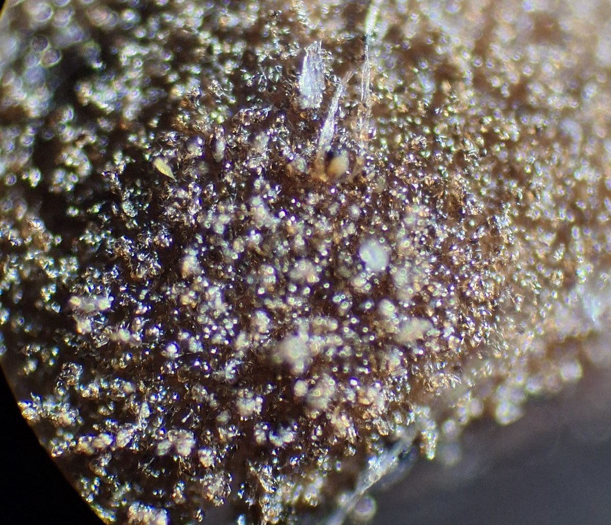 der Sporenabwurf war leider so spärlich, dass es schwierig ist, die Farbe mit dem bloßen Auge oder auch per Makrofoto zu beurteilen. Also habe ich versucht die Sporen samt Objektivträger auf weißes Papier und dann ins Durchlicht zu legen