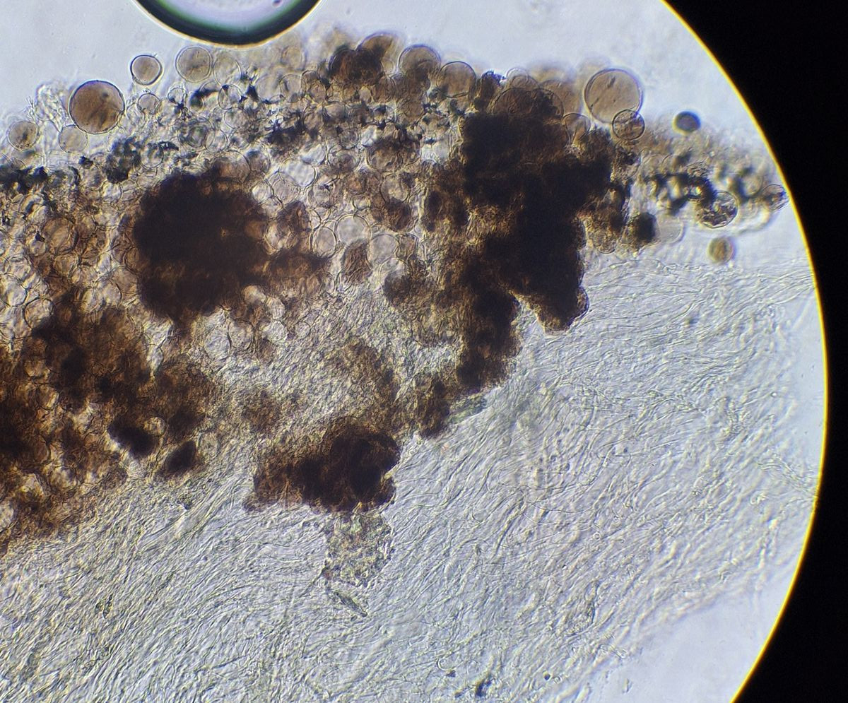 Die Sporen sind oval, Sportplatzförmig, 5-6*2-3 µm, farblos. Basidien 4-sporig. An den Lamellen sind vereinzelt blasige Objekte zu erkennen, evtl. Cheilozystiden. Die Hutschicht besteht im Auflicht oben aus unförmigen Objekten, eingeschrumpelte Kullern, die sich in Wasser als Kullern präsentieren, 12-35 µm im Durchmesser, bräunlich.