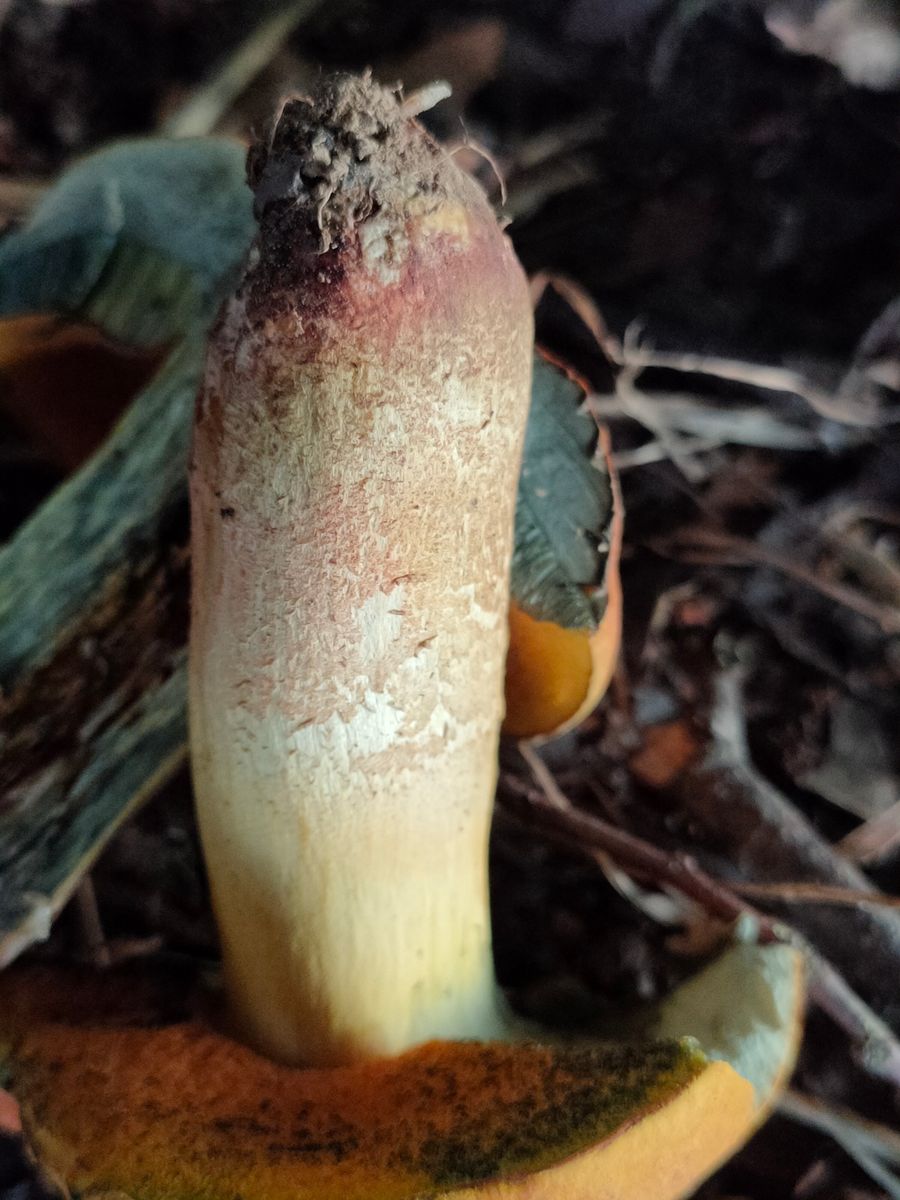 • Also ich kenne den Glattstieligen Hexenröhrling / S. Queletii nur mit deutlich (rost)rotem Hut (viel gesättigter als bei deinem Fund) im jungen Stadium, im Alter dann eher ins Orangene gehend.