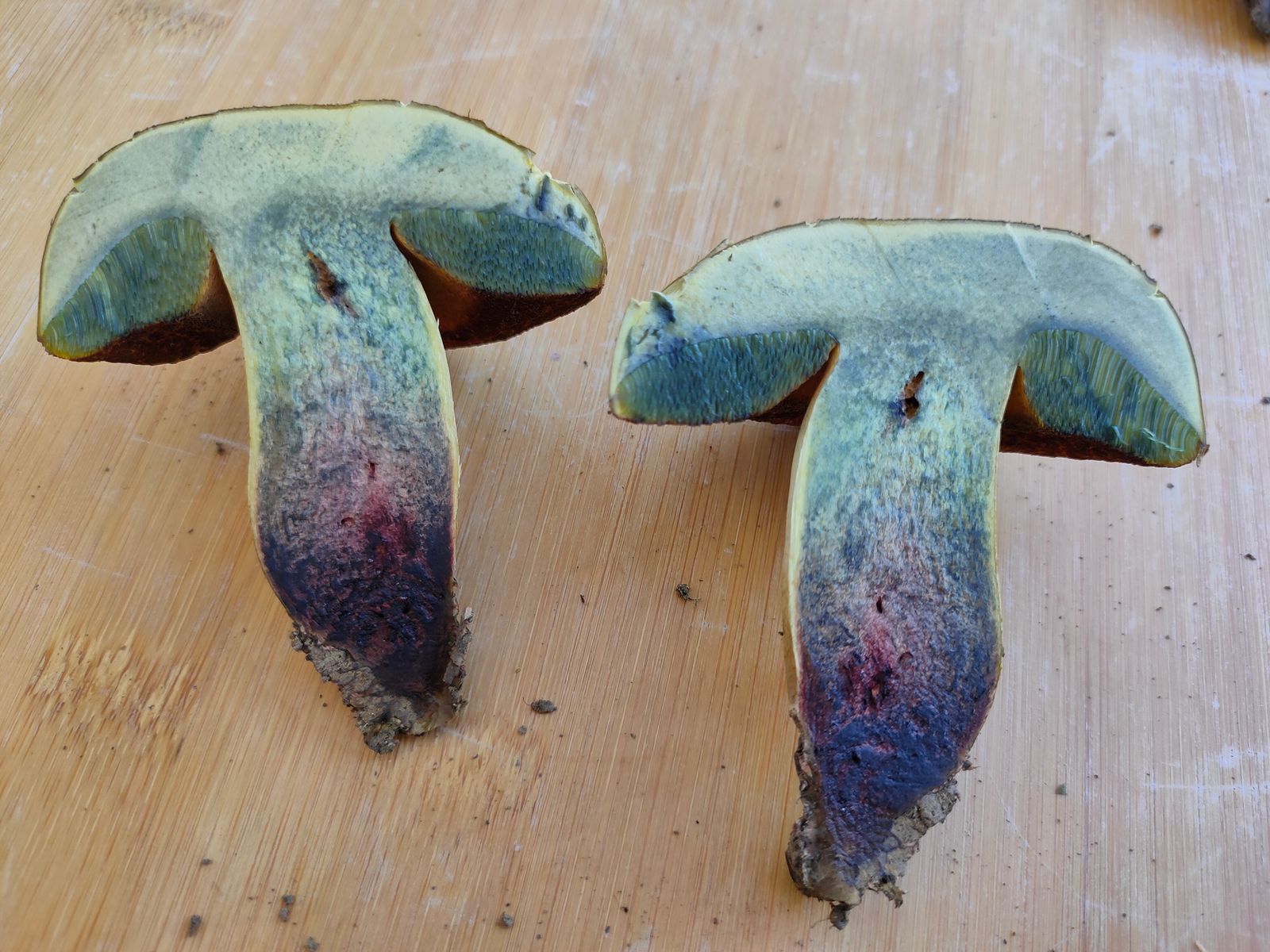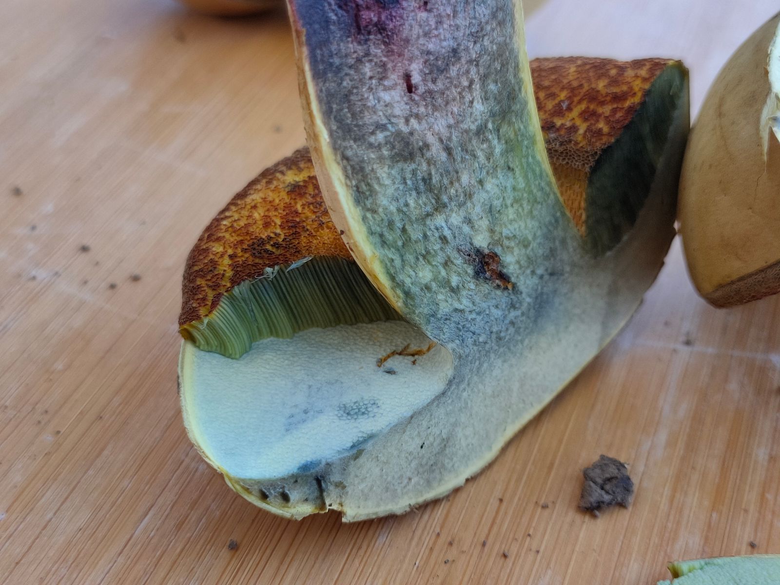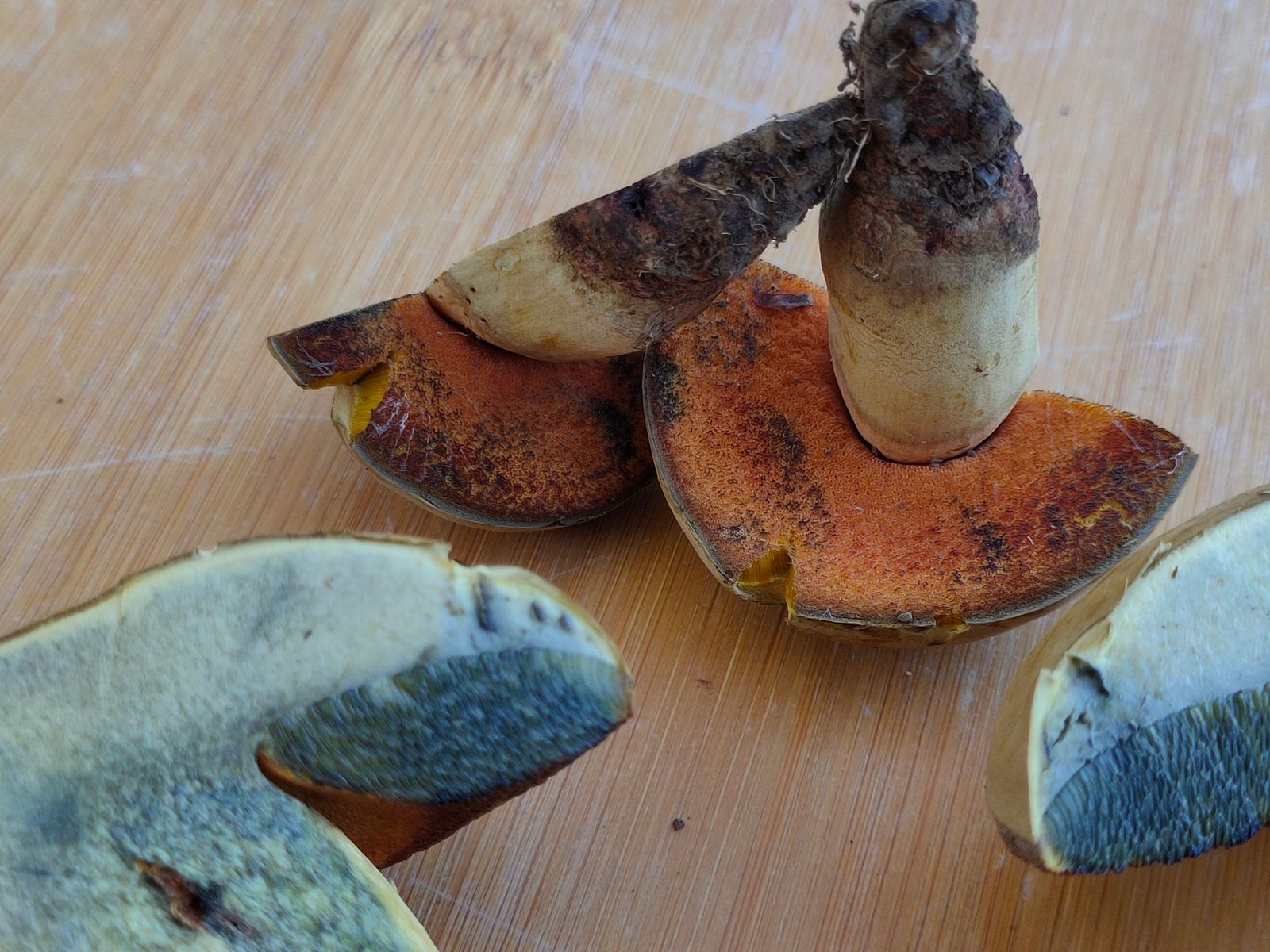 Das Fleisch rötet sofort in der Stielbasis, der Rest zeigt gelb und fängt zügig an zu blauen.